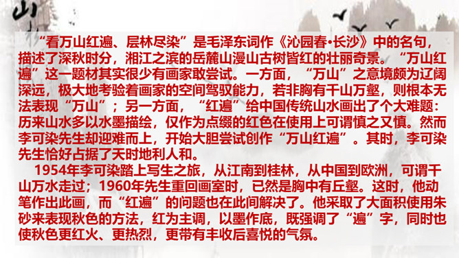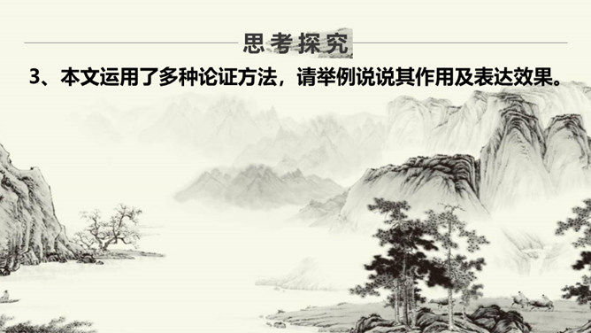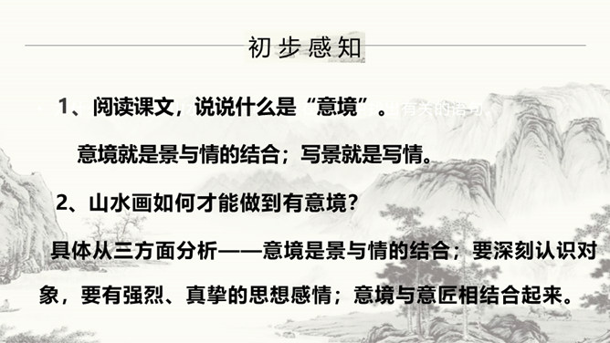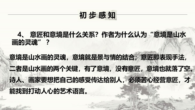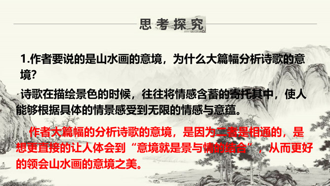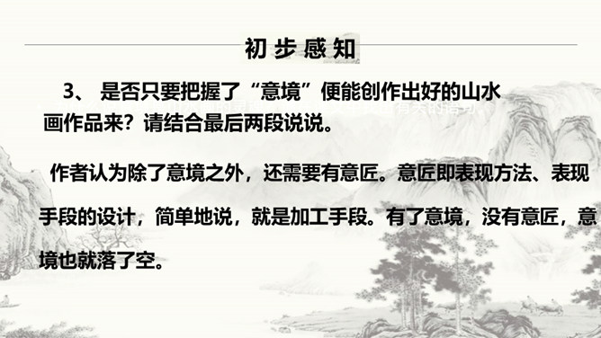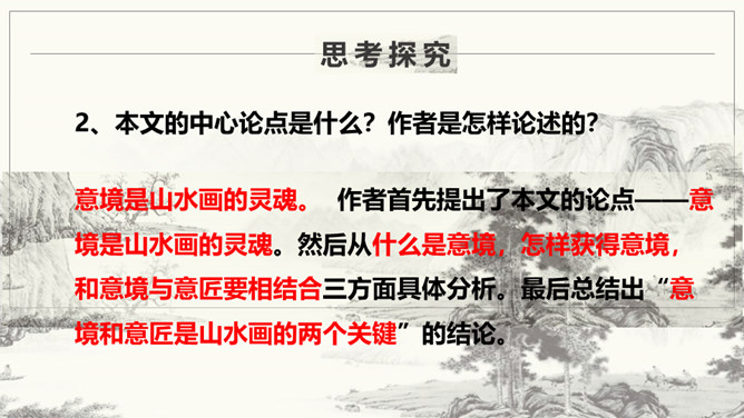作者要说的是山水画的意境,为什么大篇幅分析诗歌的意境?诗歌在描绘景色的时候,往往将情感含蓄的寄托其中,使人能够根据具体的情景感受到无限的情感与意蕴。作者大篇幅的分析诗歌的意境,是因为二者是相通的,是想更直接的让人体会到“意境就是景与情的结合”,从而更好的领会山水画的意境之美。本文的中心论点是什么?作者是怎样论述的?意境是山水画的灵魂。作者首先提出了本文的论点——意境是山水画的灵魂。然后从什么是意境,怎样获得意境,和意境与意匠要相结合三方面具体分析。所属专题:山水画的意境ppt。
