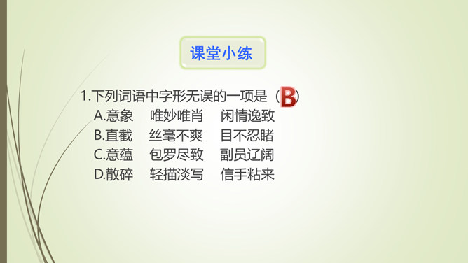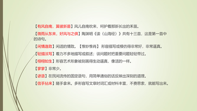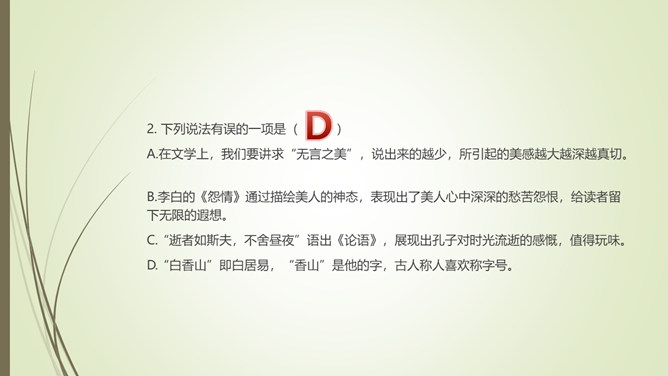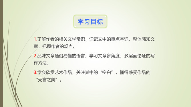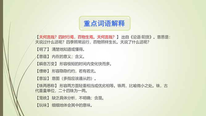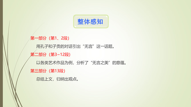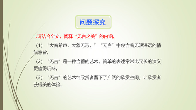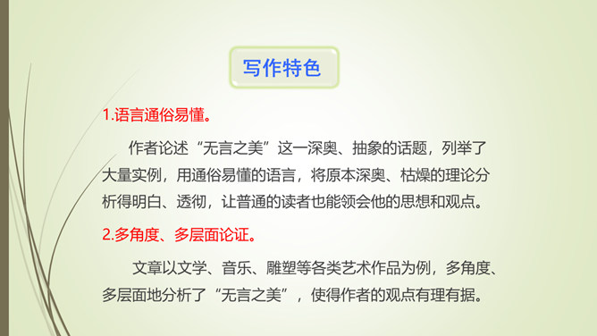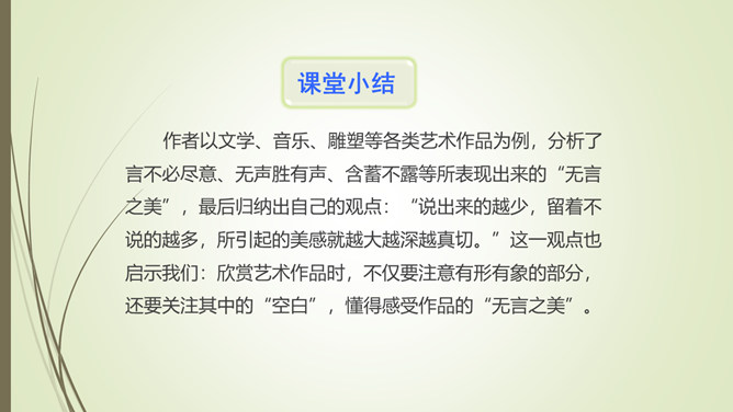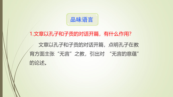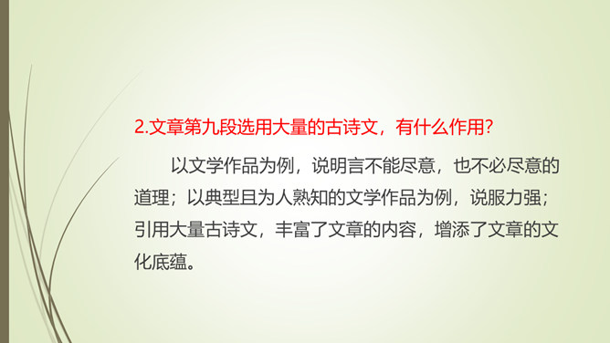 1.文章以孔子和子贡的对话开篇,有什么作用?文章以孔子和子贡的对话开篇,点明孔子在教育方面主张“无言”之教,引出对 “无言的意蕴”的论述。2.文章第九段选用大量的古诗文,有什么作用?以文学作品为例,说明言不能尽意,也不必尽意的道理;以典型且为人熟知的文学作品为例,说服力强;引用大量古诗文,丰富了文章的内容,增添了文章的文化底蕴。作者论述“无言之美”这一深奥、抽象的话题,列举了大量实例,用通俗易懂的语言,将原本深奥、枯燥的理论分析得明白、透彻,让普通的读者也能领会他的思想和观点。所属专题:无言之美ppt。
