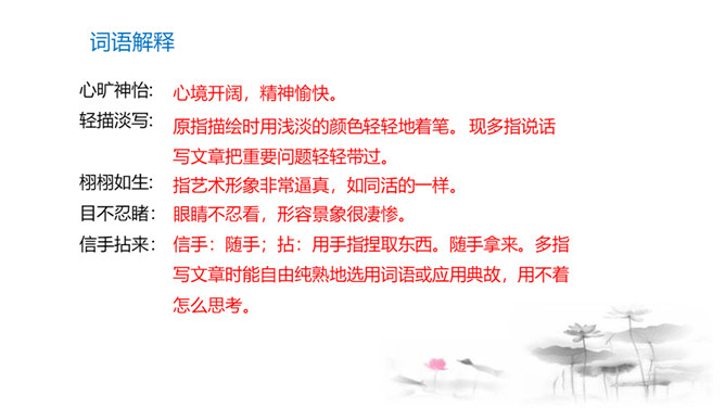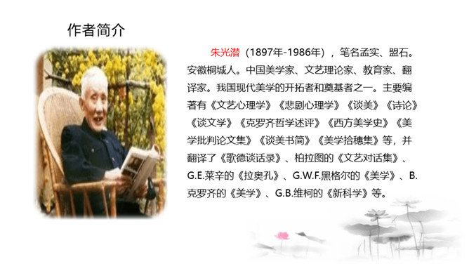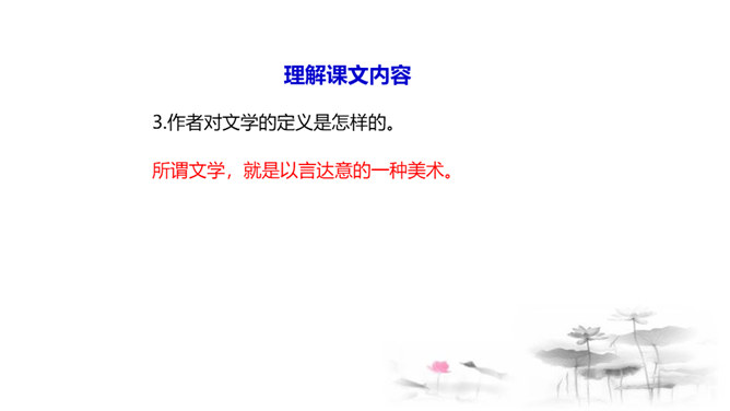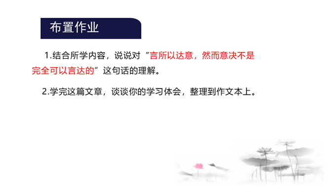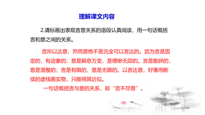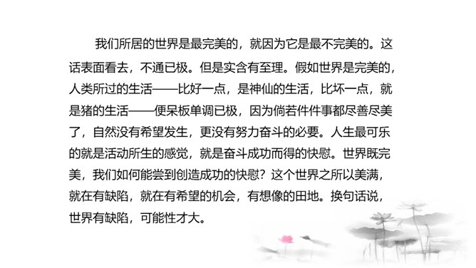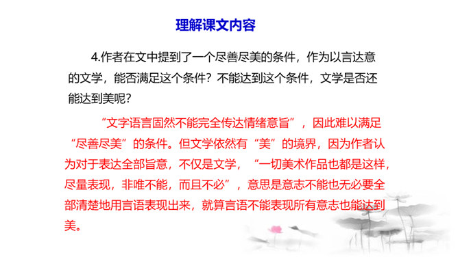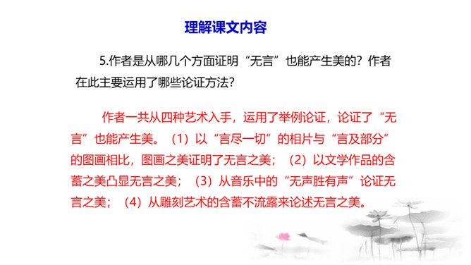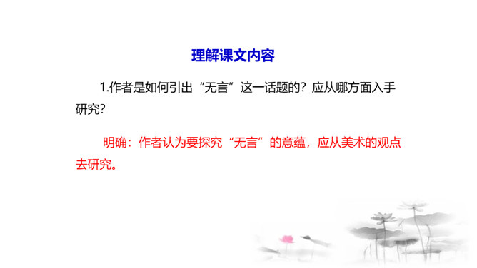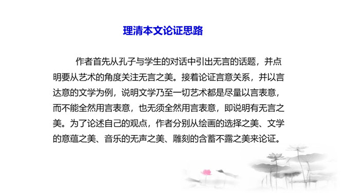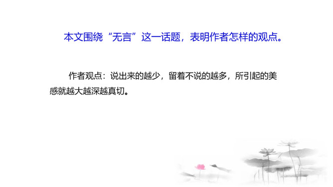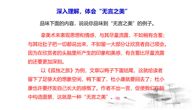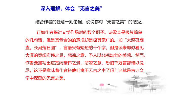正如作者探讨文学作品时的数个例子。诗歌本是极其简单的几句话,但是其包含的的意境却是极其宽广的。如“大漠孤烟直,长河落日圆”,言语只有短短的十个字,但是读来却似看见大漠的宽阔宏伟之景,悲凉之意,予人以悲凉雄壮的美感。然而,作者要描写出这宽阔宏伟之景,悲凉之意,恐怕书万言都难以说尽,这不是意味着作者将他们寓于无言之中了吗?这就是古典文学中深蕴的无言之美。拿美术来表现思想和情感,与其尽量流露,不如稍有含蓄;与其吐肚子把一切都说出来,不如留一大部分让欣赏者自己领会。所属专题:无言之美ppt。