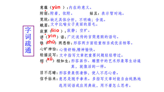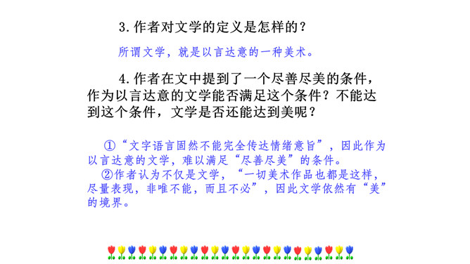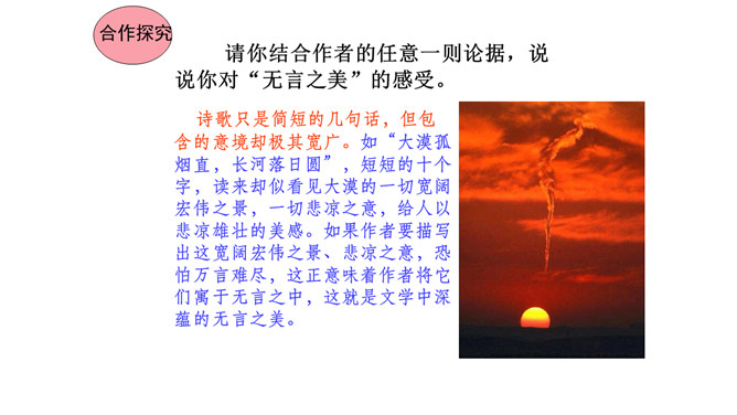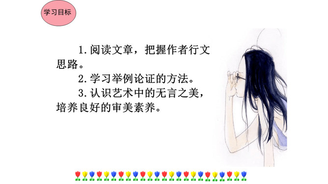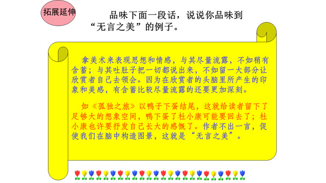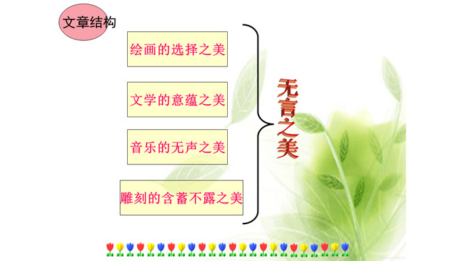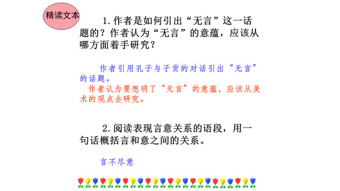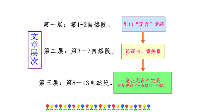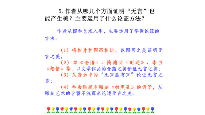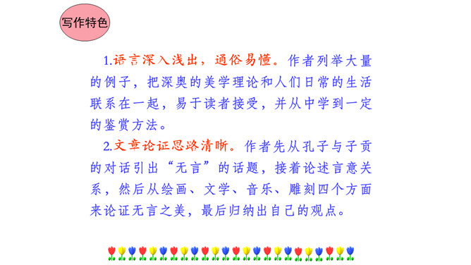 1.语言深入浅出,通俗易懂。作者列举大量的例子,把深奥的美学理论和人们日常的生活联系在一起,易于读者接受,并从中学到一定的鉴赏方法。2.文章论证思路清晰。作者先从孔子与子贡的对话引出“无言”的话题,接着论述言意关系,然后从绘画、文学、音乐、雕刻四个方面来论证无言之美,最后归纳出自己的观点。本文首先引用孔子的话,引出“无言”这一话题,接着论证言意关系,然后以绘画、文学、音乐、雕刻等各类艺术作品为例,分析了言不必尽意、无声胜有声、含蓄不露等所表现出来的“无言之美”。所属专题:无言之美ppt。