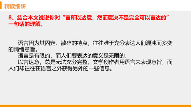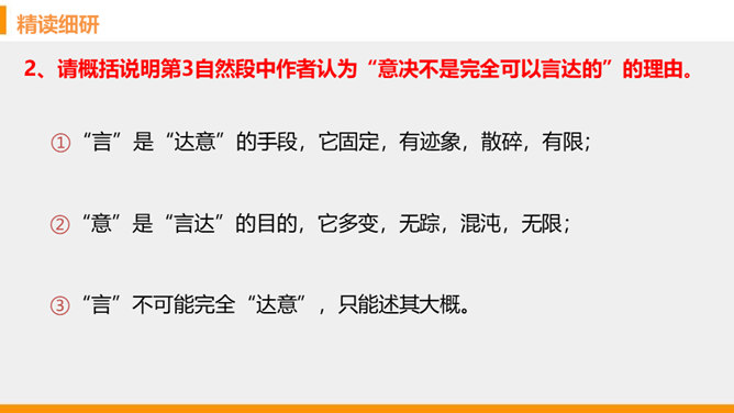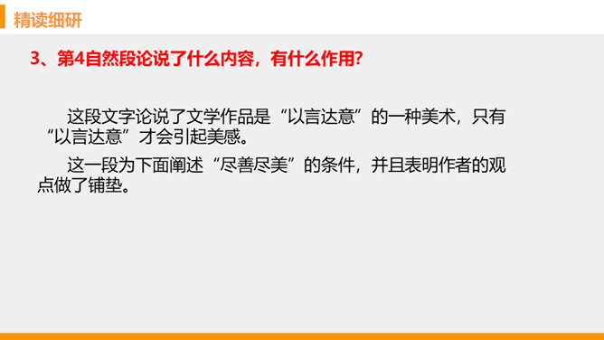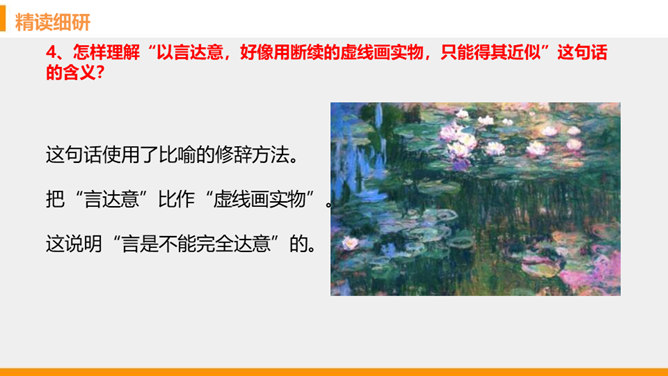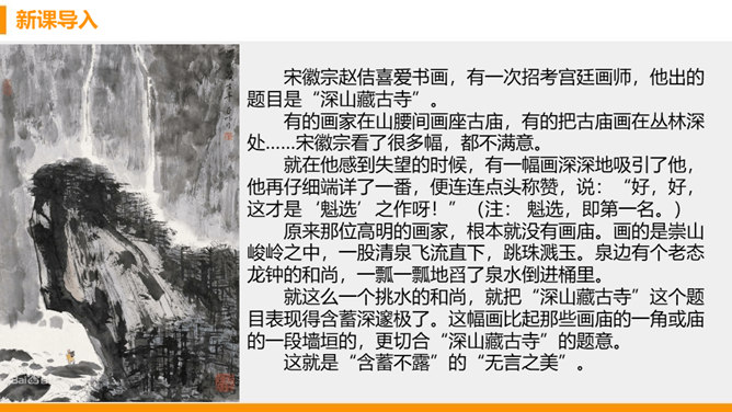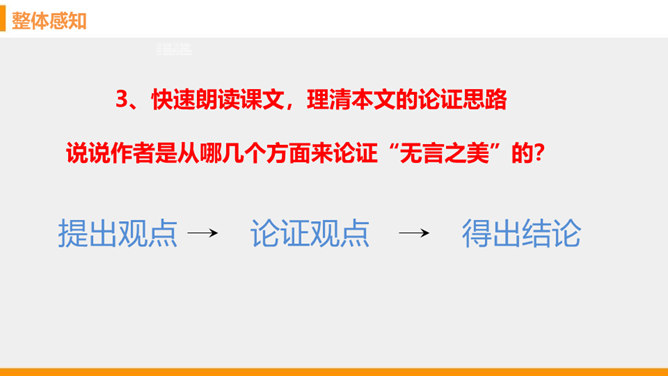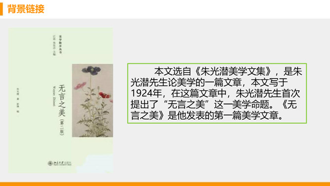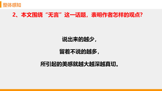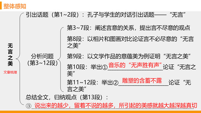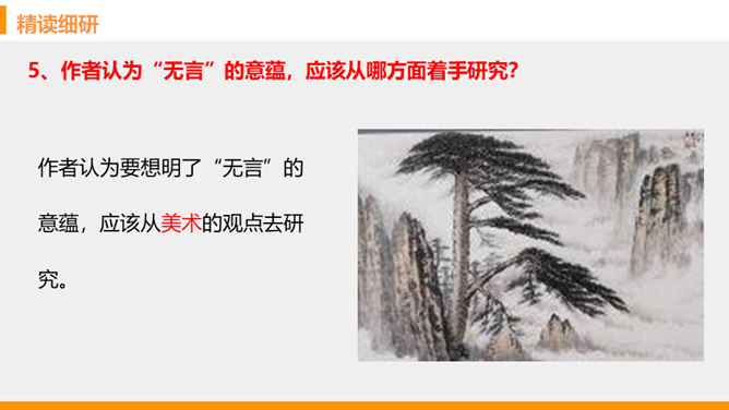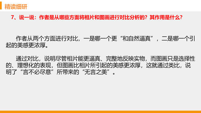 (1)文章通过孔子与学生的对话引出“无言”的话题。(2)接着阐述言意关系,证明言不尽意的“无言之美”。(3)从图画、文学、音乐、雕刻四种艺术入手,举例论证“无言之美”;(4)总结全文,得出结论:“与其尽量流露,不如稍有含蓄”。说一说:作者是从哪些方面将相片和图画进行对比分析的?其作用是什么? 作者从两个方面进行对比,一是哪一个更“和自然逼真”,二是哪一个引起的美感更浓厚。通过对比,说明尽管相片能更逼真、完整地反映实物,而图画只是选择性的、理想化的表现,但图画比相片所引起的美感更浓厚。所属专题:无言之美ppt。