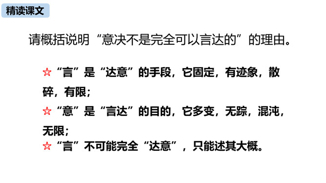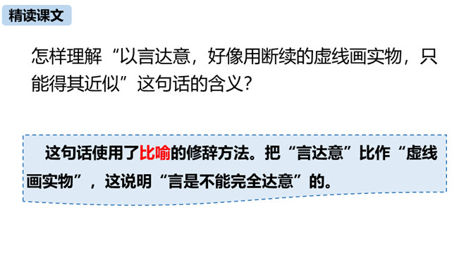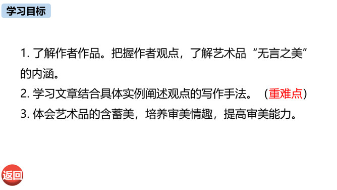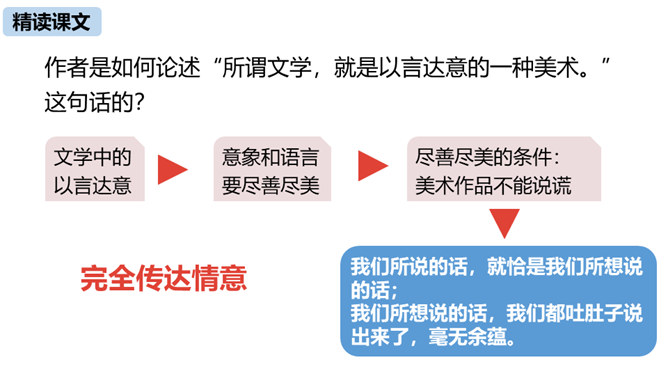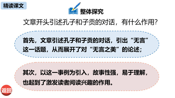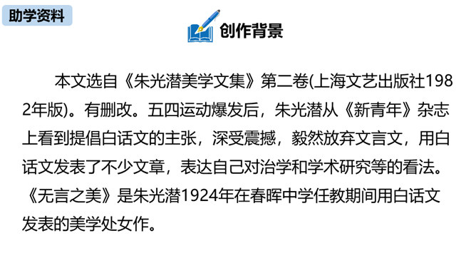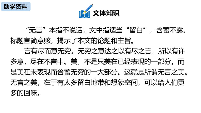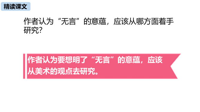 本文由《论语》中孔子与子贡的对话引出“无言”,引申到对美术作品中“无言”的理解,否定了“尽美尽善”“和自然逼真”的观点,以多个美术方面的例子为依据,得出“说出来的越少,留着不说的越多,所引起的美感就越大越深越真切”的观点,颇具独特性和深刻性。在论述过程中则十分讲究用语的严谨准确。例如,“意决不是完全可以言达的”中的“完全”、“与其尽量流露,不如稍有含蓄”中的“稍”等,都用得极有分寸,经得起推敲。作为一篇学术著作,本文深入浅出,洗练明白。所属专题:无言之美ppt。