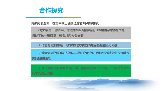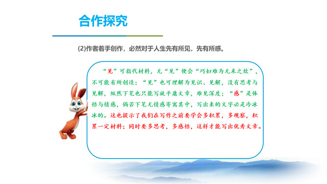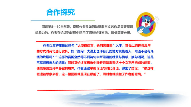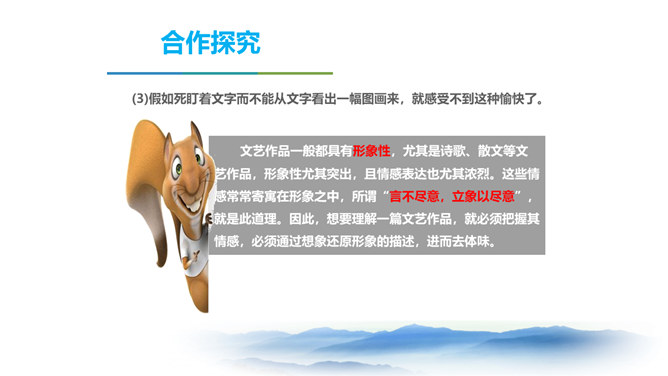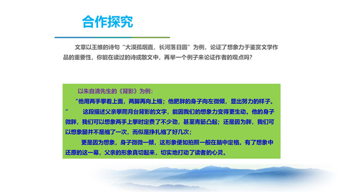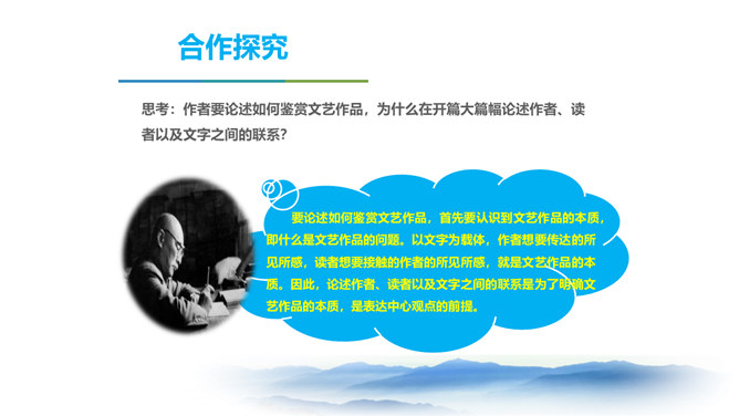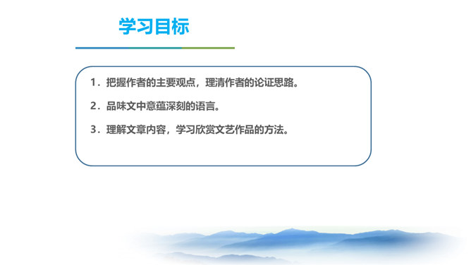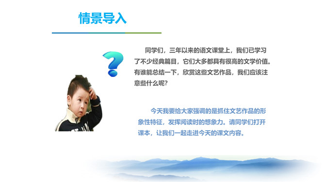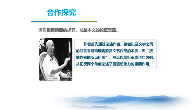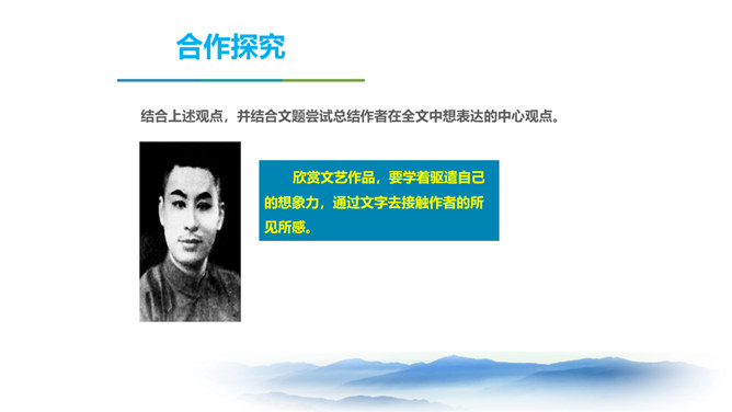 同学们,三年以来的语文课堂上,我们已学习了不少经典篇目,它们大多都具有很高的文学价值。有谁能总结一下,欣赏这些文艺作品,我们应该注意些什么呢? 今天我要给大家强调的是抓住文艺作品的形象性特征,发挥阅读时的想象力。请同学们打开课本,让我们一起走进今天的课文内容。把握作者的主要观点,理清作者的论证思路。品味文中意蕴深刻的语言。理解文章内容,学习欣赏文艺作品的方法。 结合上述观点,并结合文题尝试总结作者在全文中想表达的中心观点。欣赏文艺作品,要学着驱遣自己的想象力,通过文字去接触作者的所见所感。所属专题:驱遣我们的想象ppt。