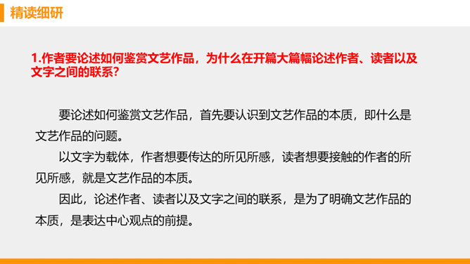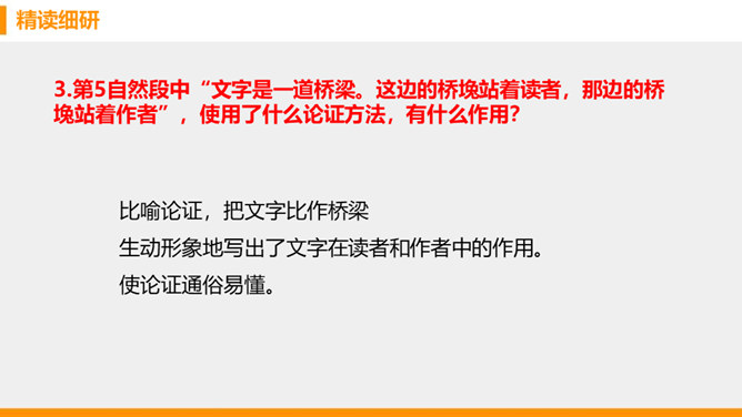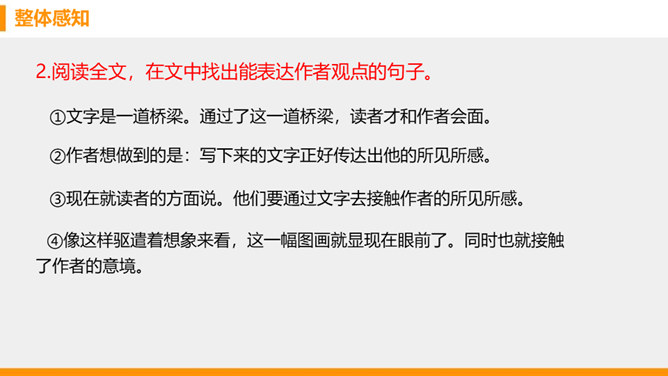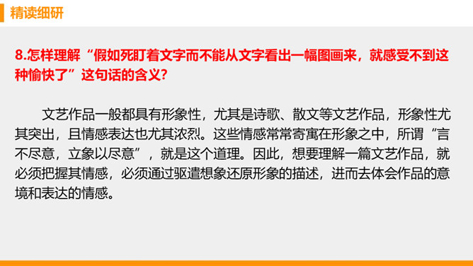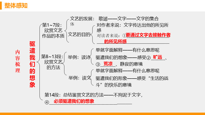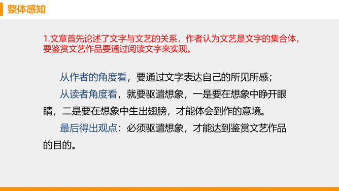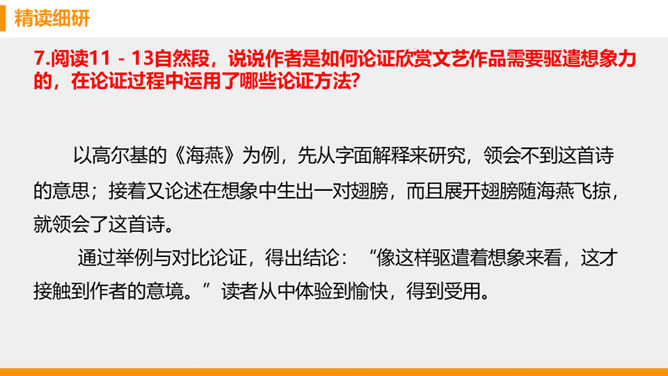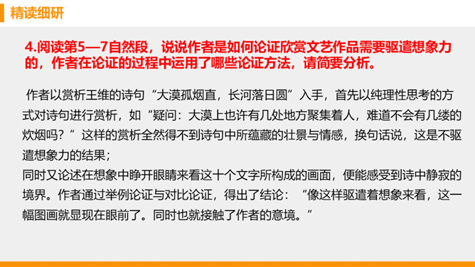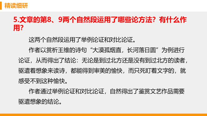 第8-9自然段的论证思路?这两段文字论述了在赏析王维的诗句时应怎样驱使我们的想象力。首先从反面论述:如果从字面意义或从无用的画面推敲无用的问题,那么就不会领会诗句的意思。然后从正面阐述:将诗句勾勒成一幅画面,然后推想“直”“圆”等形容词的表达效果,这样就理解了诗句的意境。第9自然段围绕着上面的举例,进一步论述,解释说明了如果驱遣我们的想象理解了作者的意境,就会得到一种愉悦。阅读11-13自然段,说说作者是如何论证欣赏文艺作品需要驱遣想象力的,在论证过程中运用了哪些论证方法?所属专题:驱遣我们的想象ppt。