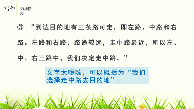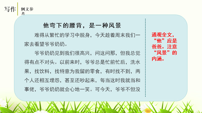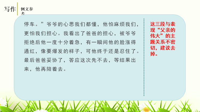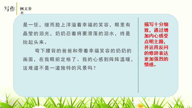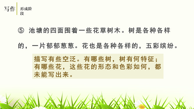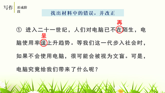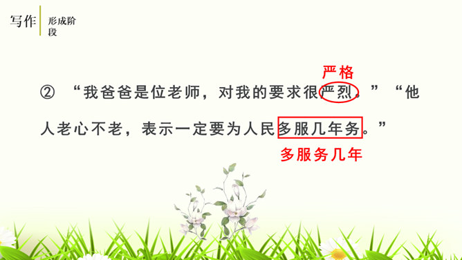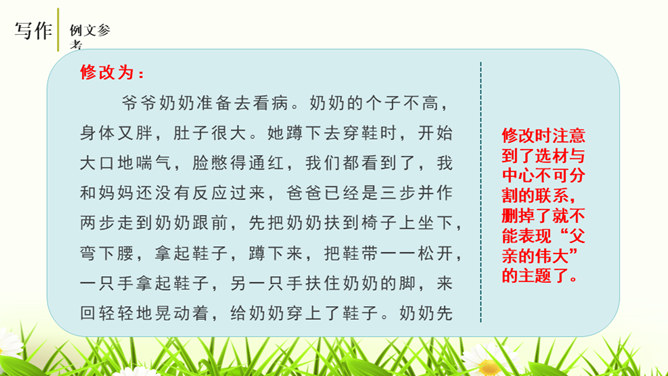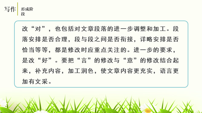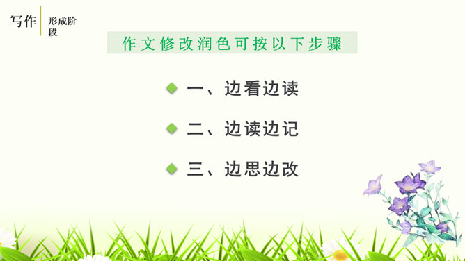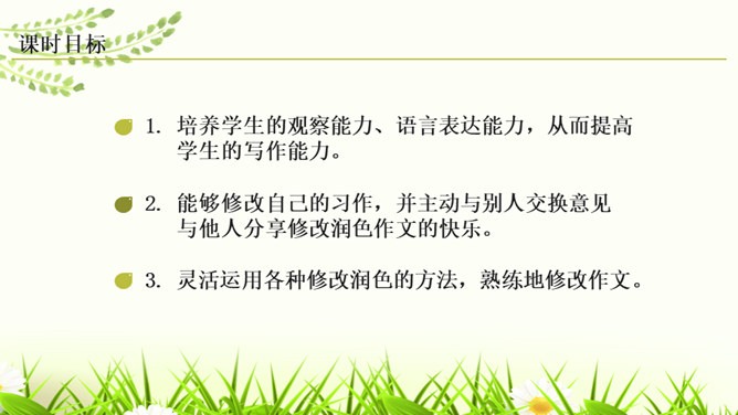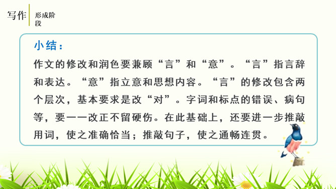 培养学生的观察能力、语言表达能力,从而提高学生的写作能力。能够修改自己的习作,并主动与别人交换意见与他人分享修改润色作文的快乐。灵活运用各种修改润色的方法,熟练地修改作文。作文的修改和润色要兼顾“言”和“意”。“言”指言辞和表达。“意”指立意和思想内容。“言”的修改包含两个层次,基本要求是改“对”。字词和标点的错误、病句等,要一一改正不留硬伤。在此基础上,还要进一步推敲用词,使之准确恰当;推敲句子,使之通畅连贯。改“对”,也包括对文章段落的进一步调整和加工。所属专题:修改润色ppt。
