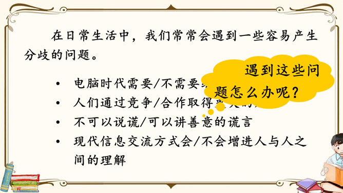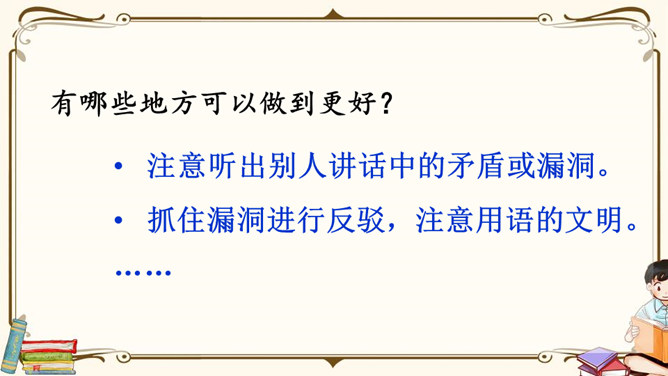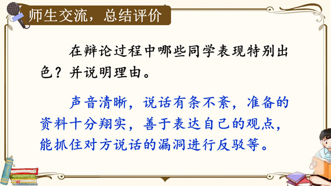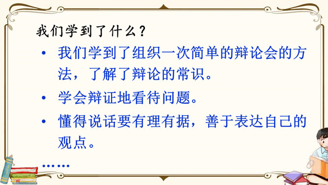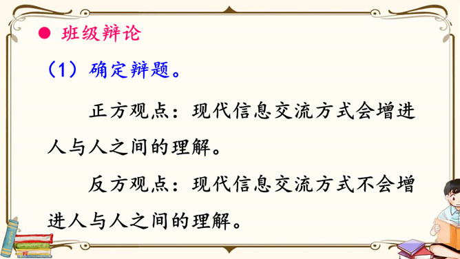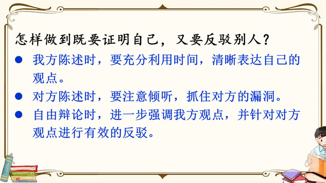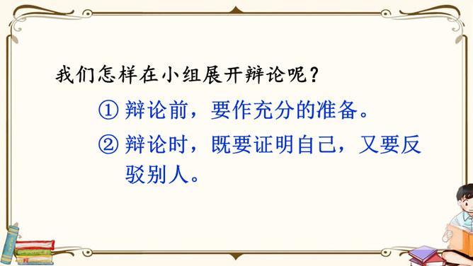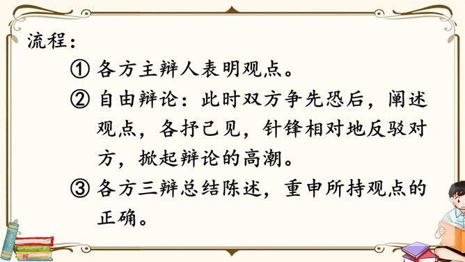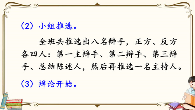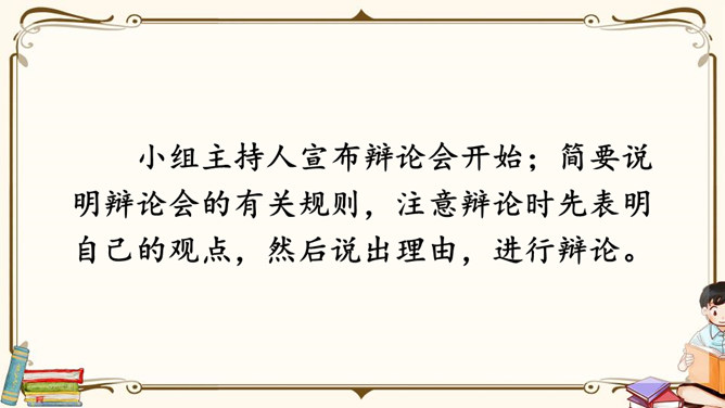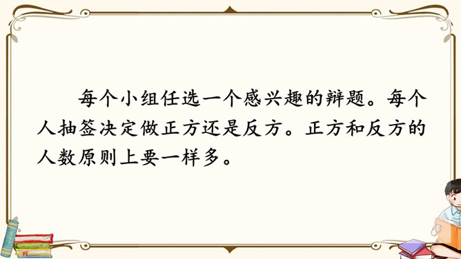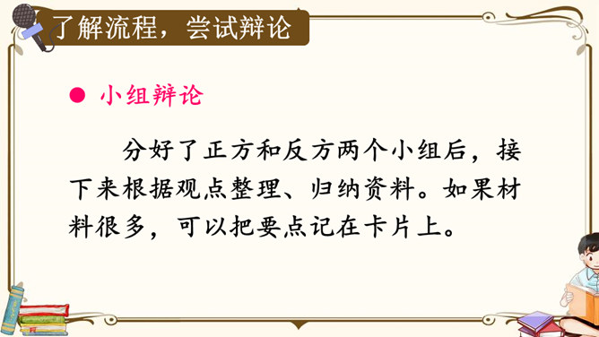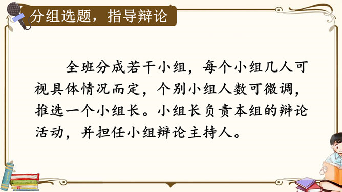 全班分成若干小组,每个小组几人可视具体情况而定,个别小组人数可微调,推选一个小组长。小组长负责本组的辩论活动,并担任小组辩论主持人。每个小组任选一个感兴趣的辩题。每个人抽签决定做正方还是反方。正方和反方的人数原则上要一样多。我们怎样在小组展开辩论呢?辩论前,要作充分的准备。辩论时,既要证明自己,又要反驳别人。分好了正方和反方两个小组后,接下来根据观点整理、归纳资料。如果材料很多,可以把要点记在卡片上。怎样做到既要证明自己,又要反驳别人?所属专题:辩论ppt。