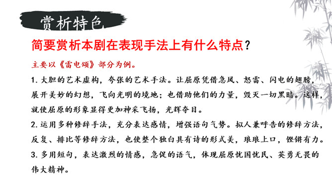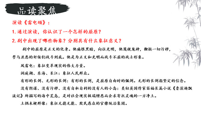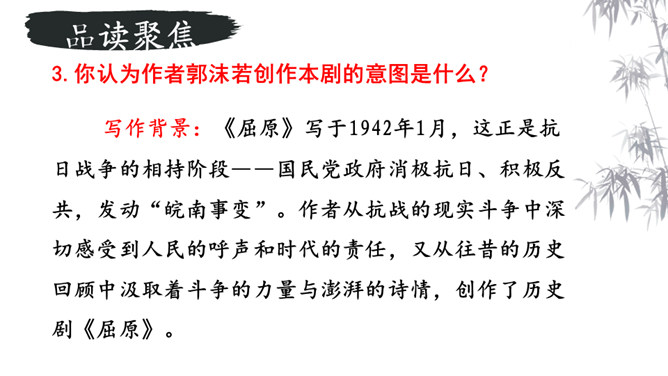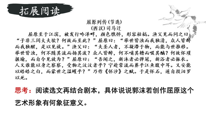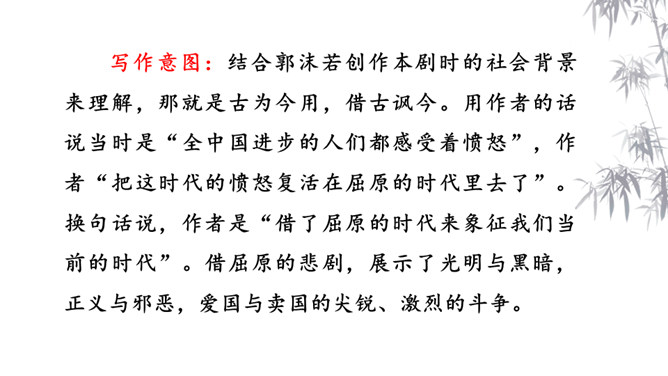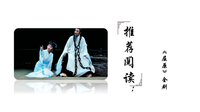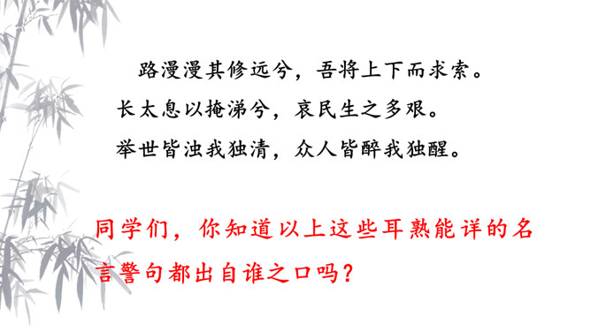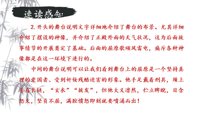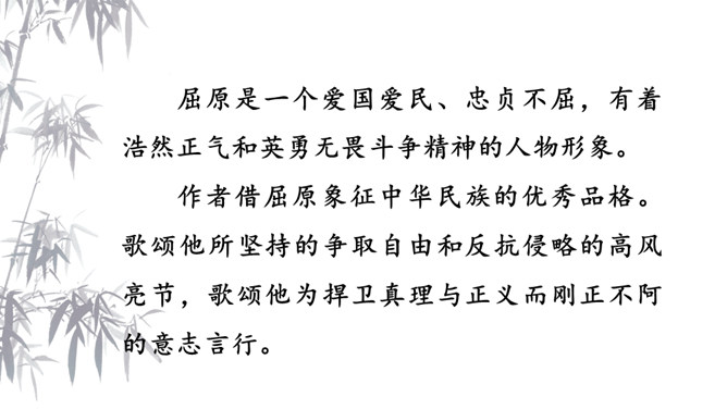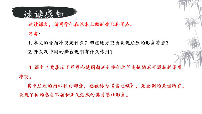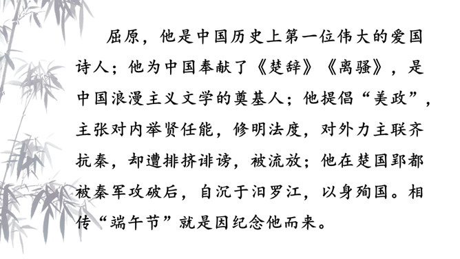 他是中国历史上第一位伟大的爱国诗人;他为中国奉献了《楚辞》《离骚》,是中国浪漫主义文学的奠基人;他提倡“美政”,主张对内举贤任能,修明法度,对外力主联齐抗秦,却遭排挤诽谤,被流放;他在楚国郢都被秦军攻破后,自沉于汨罗江,以身殉国。相传“端午节”就是因纪念他而来。速读课文,请同学们在课本上做好旁批和圈点。思考:1.本文的矛盾冲突是什么?哪些地方突出表现屈原的形象特点?2.开头及中间的舞台说明有什么作用?课文主要展示了屈原和楚国朝廷奸佞们之间尖锐的不可调和的矛盾冲突。所属专题:屈原ppt。