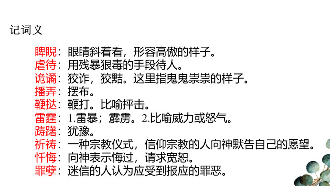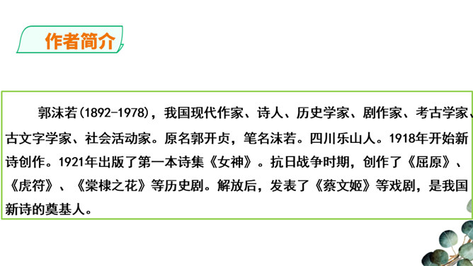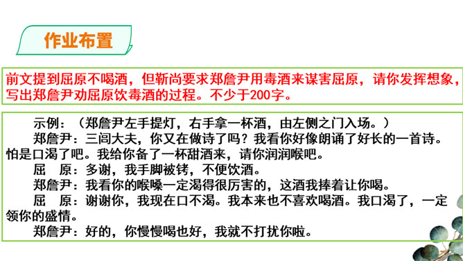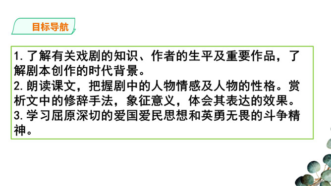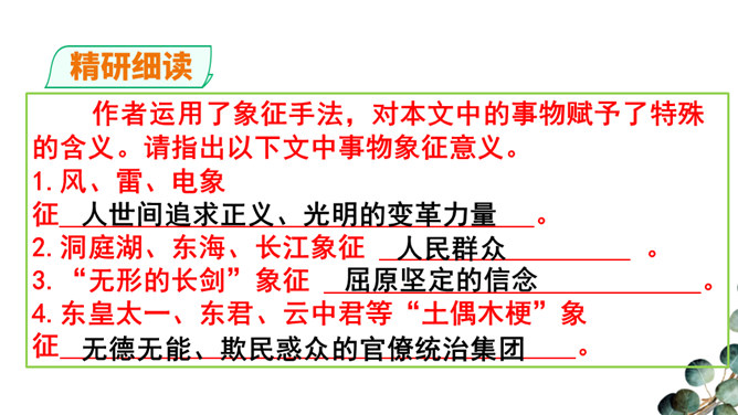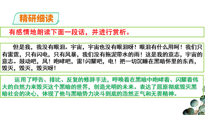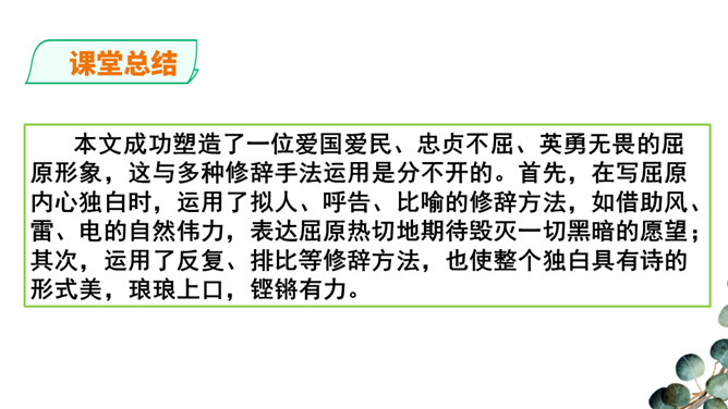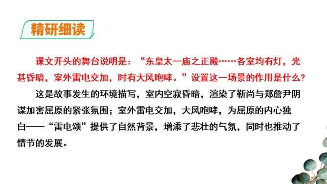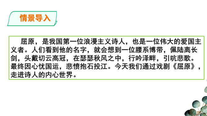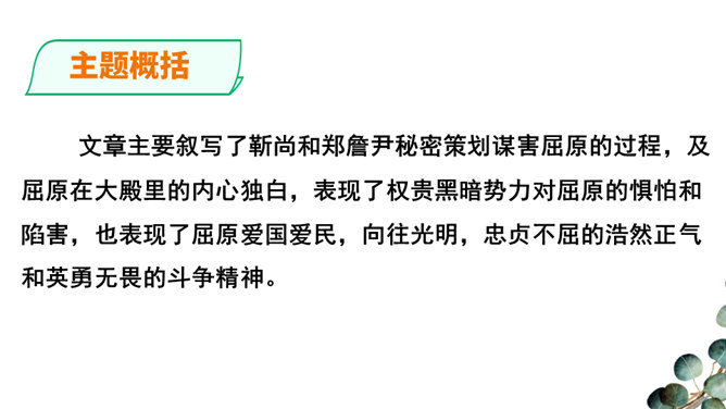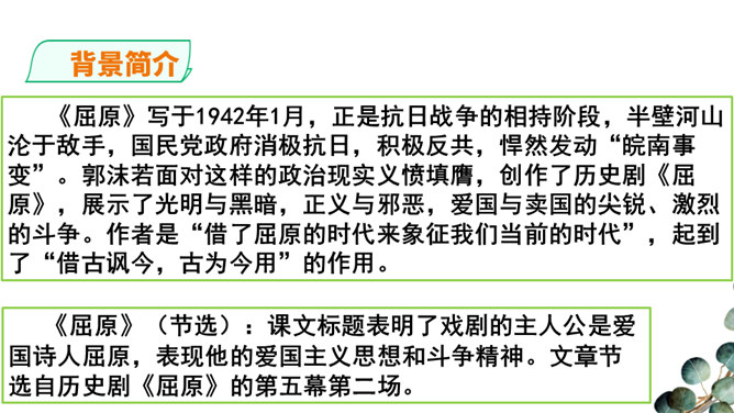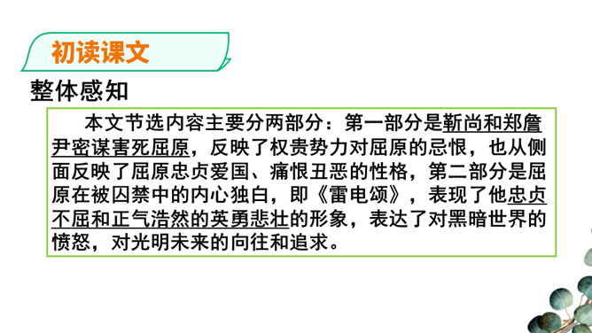 了解有关戏剧的知识、作者的生平及重要作品,了解剧本创作的时代背景。朗读课文,把握剧中的人物情感及人物的性格。赏析文中的修辞手法,象征意义,体会其表达的效果。本文节选内容主要分两部分:第一部分是靳尚和郑詹尹密谋害死屈原,反映了权贵势力对屈原的忌恨,也从侧面反映了屈原忠贞爱国、痛恨丑恶的性格,第二部分是屈原在被囚禁中的内心独白,即《雷电颂》,表现了他忠贞不屈和正气浩然的英勇悲壮的形象,表达了对黑暗世界的愤怒,对光明未来的向往和追求。所属专题:屈原ppt。