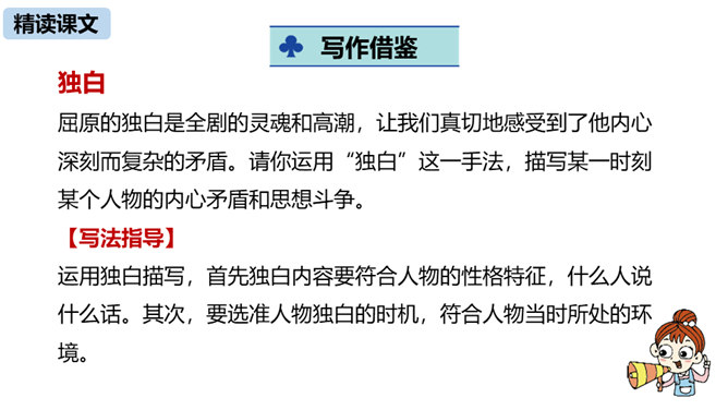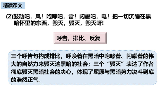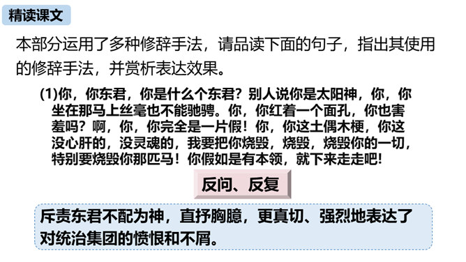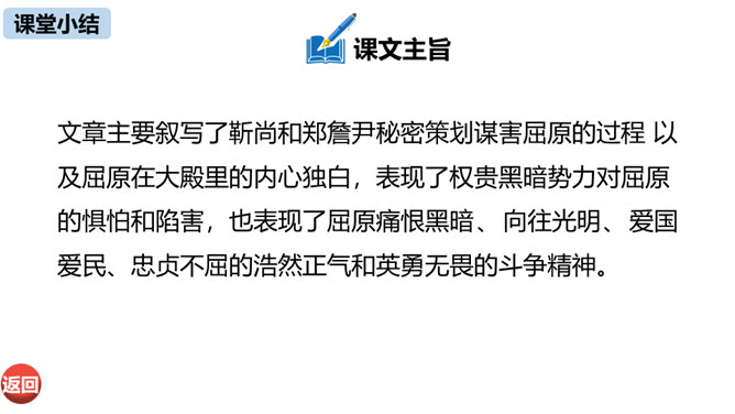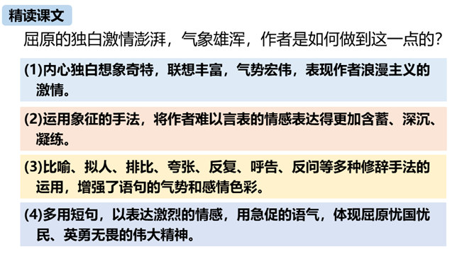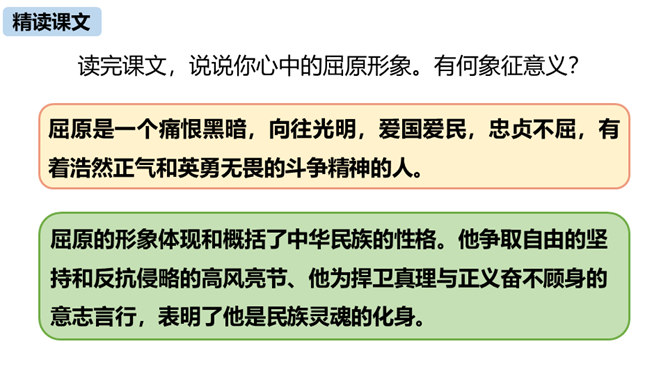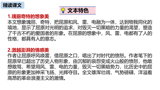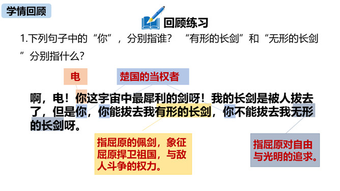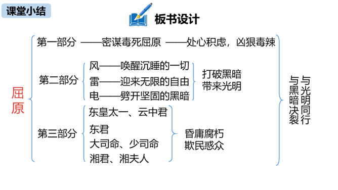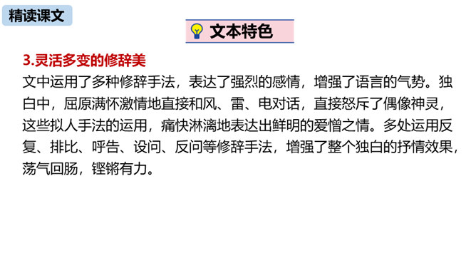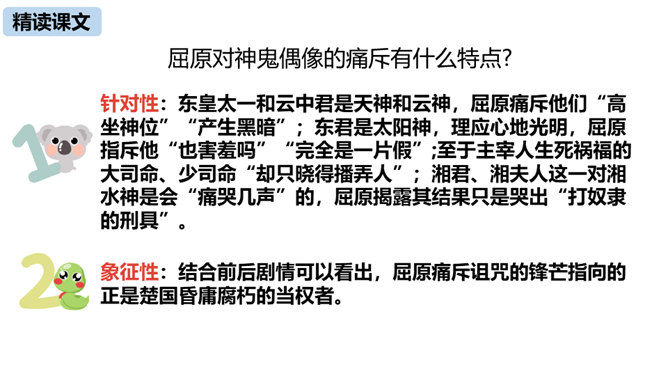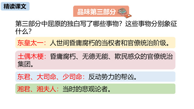 第三部分中屈原的独白写了哪些事物?这些事物分别象征什么?东皇太一:人世间昏庸腐朽的当权者和官僚统治阶级。土偶木梗:昏庸腐朽、无德无能、欺民惑众的官僚统治集团。东君、大司命、少司命:反动势力的帮凶。湘君、湘夫人:当时的悲观论者。屈原对神鬼偶像的痛斥有什么特点?针对性:东皇太一和云中君是天神和云神,屈原痛斥他们“高坐神位”“产生黑暗”;东君是太阳神,理应心地光明,屈原指斥他“也害羞吗”“完全是一片假”;至于主宰人生死祸福的大司命、少司命“却只晓得播弄人”。所属专题:屈原ppt。