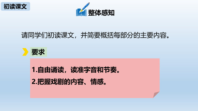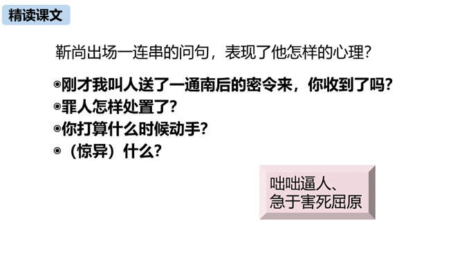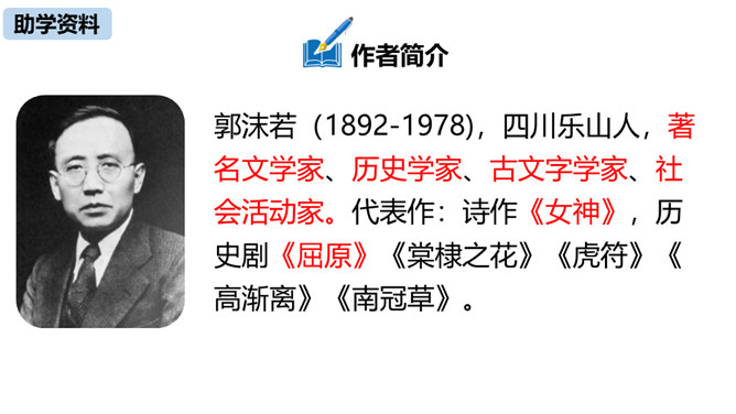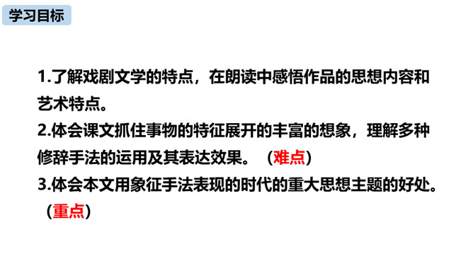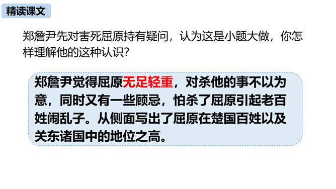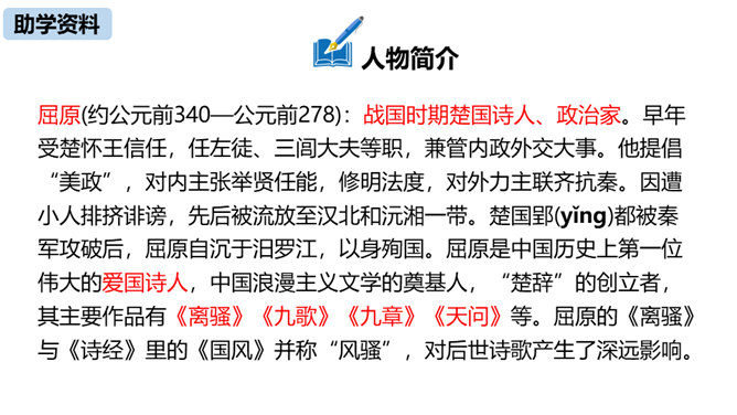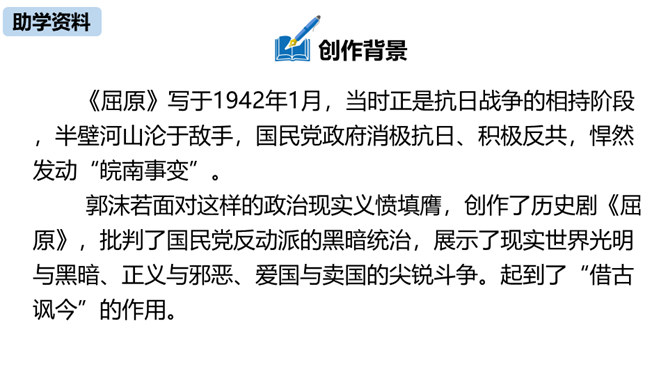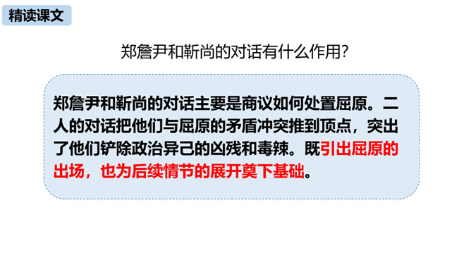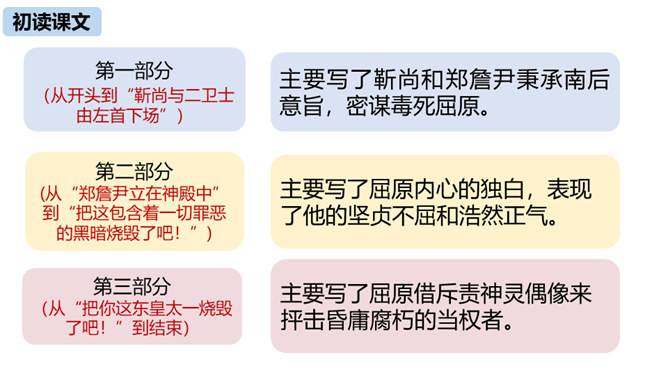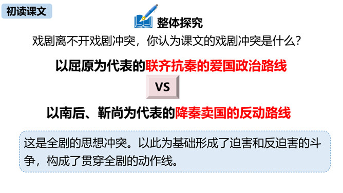 1.了解戏剧文学的特点,在朗读中感悟作品的思想内容和艺术特点。2.体会课文抓住事物的特征展开的丰富的想象,理解多种修辞手法的运用及其表达效果。(难点)3.体会本文用象征手法表现的时代的重大思想主题的好处。(重点)戏剧离不开戏剧冲突,你认为课文的戏剧冲突是什么?以屈原为代表的联齐抗秦的爱国政治路线。以南后、靳尚为代表的降秦卖国的反动路线。这是全剧的思想冲突。以此为基础形成了迫害和反迫害的斗争,构成了贯穿全剧的动作线。 话剧开头的舞台说明有何作用?交代了故事发生的地点、环境。所属专题:屈原ppt。