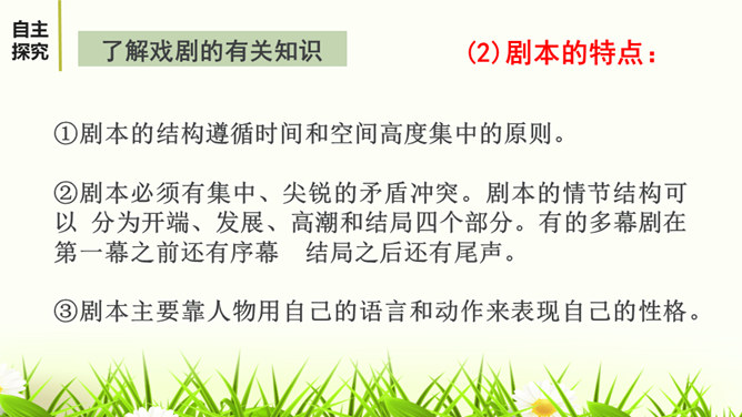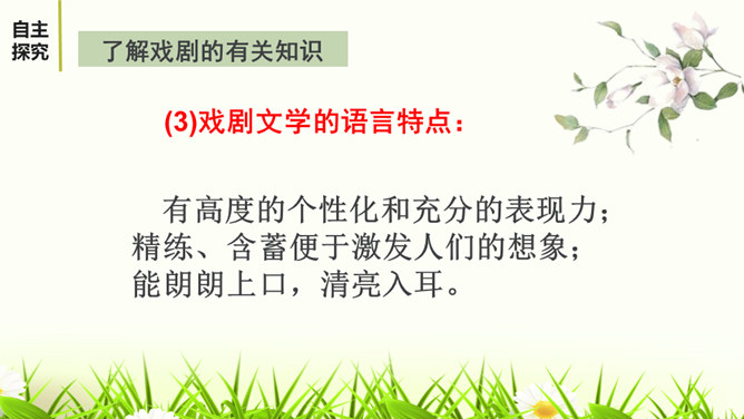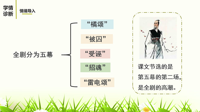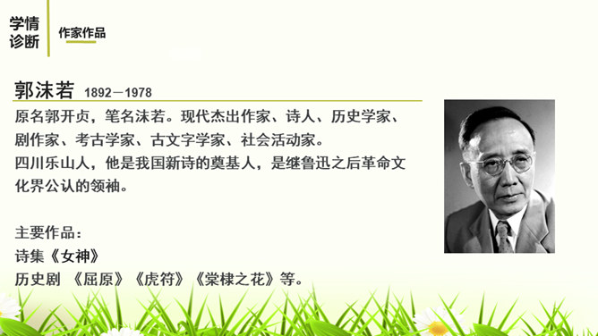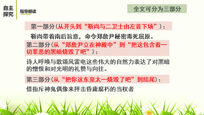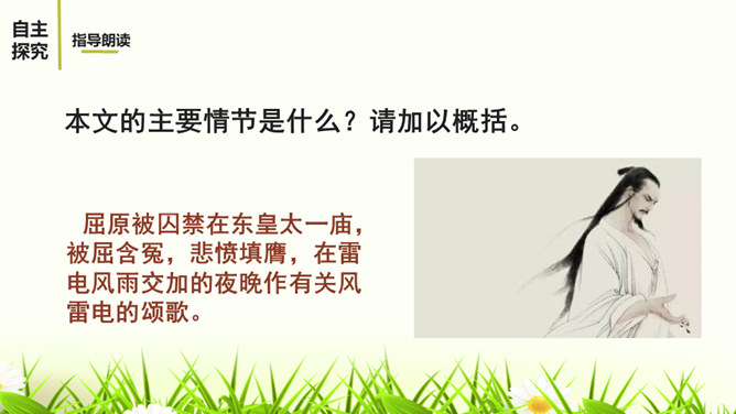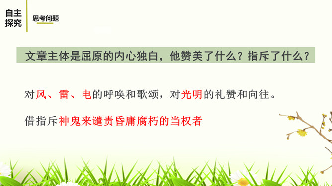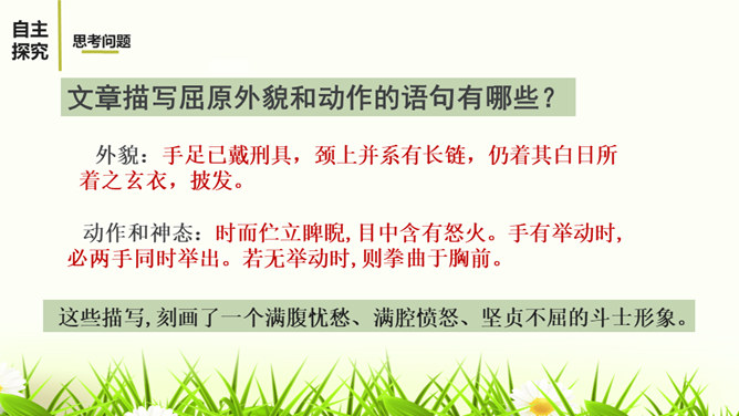 文章描写屈原外貌和动作的语句有哪些?这些描写,刻画了一个满腹忧愁、满腔愤怒、坚贞不屈的斗士形象。 屈原是一个爱国爱民,忠贞不屈,有着浩然正气和英勇无畏的斗争精神的形象。屈原的形象体现和概括了中华民族的性格。他所坚持的争取自由和反抗侵略的高风亮节,他为捍卫真理与正义刚正不阿、奋不顾身的意志言行,是民族灵魂的化身。周恩来同志称赞这一剧本说:“屈原并没有写过这样的诗词,也不能写出来,这是郭沫若借屈原的口说出自己心中的怨愤,也表达了蒋管区人民的愤恨之情,是对国民党压迫人民的控诉,好得很!所属专题:屈原ppt。