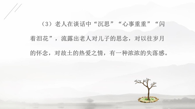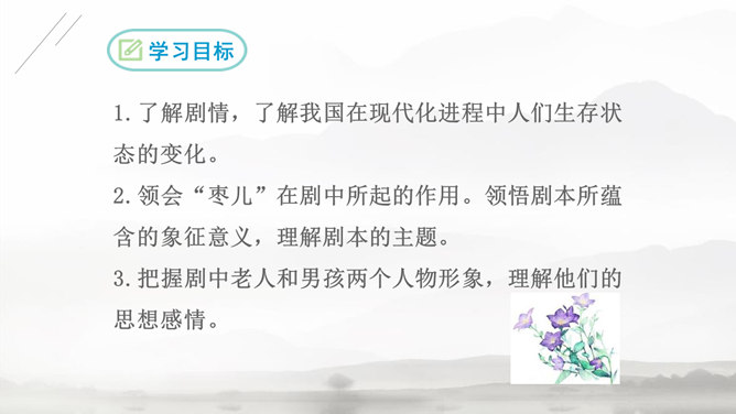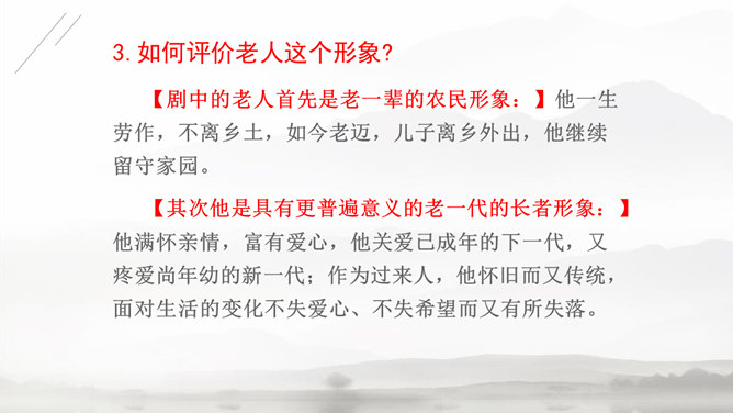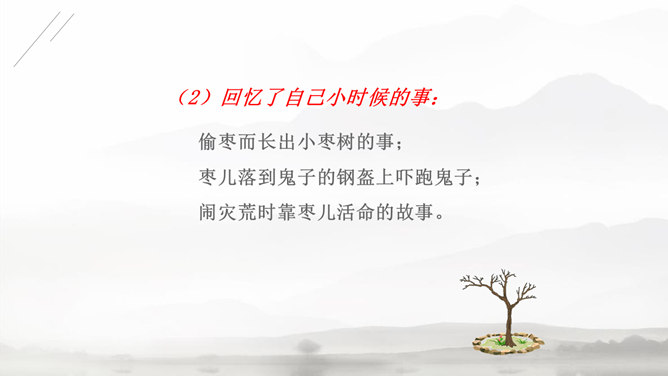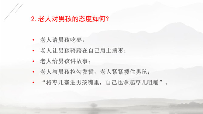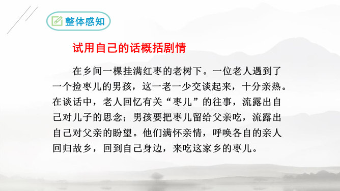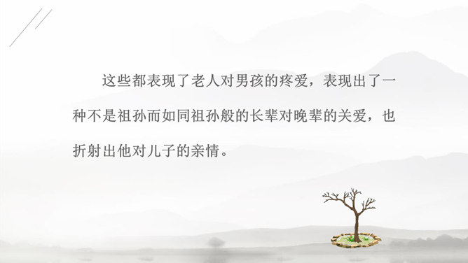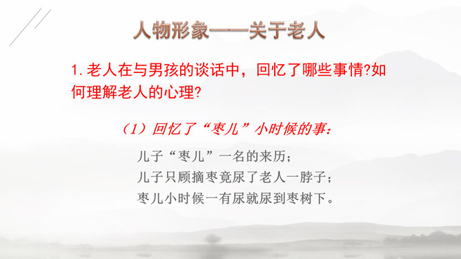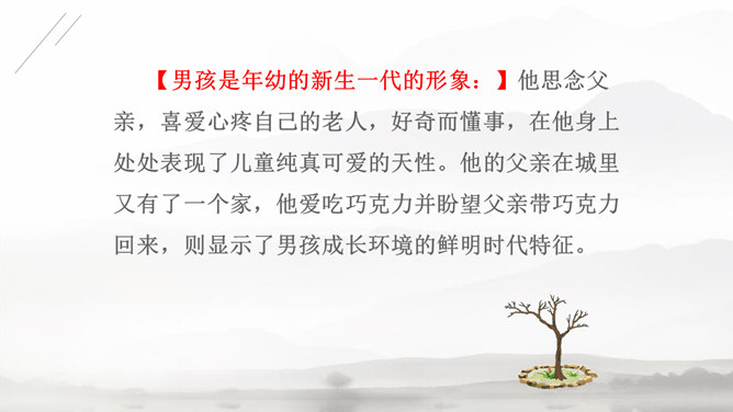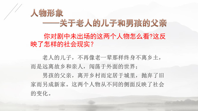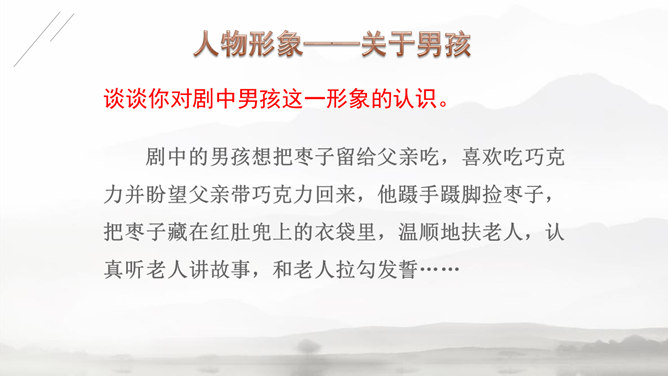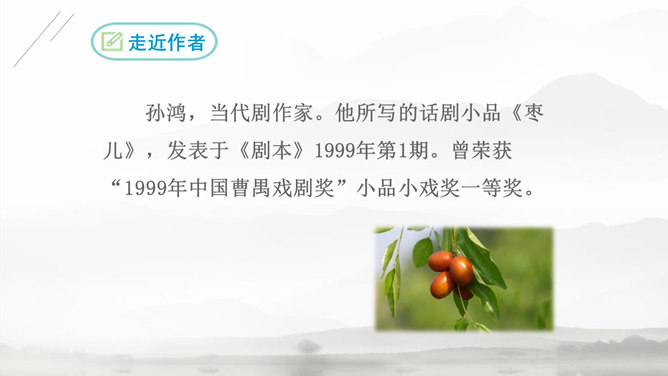 怎样理解剧中的象征手法?“枣儿”所代表的是亲情和历史,也代表一种文化传统、一种生活方式;“枣儿”所牵涉的老人与男孩的情感困惑,以及老人与儿子、男孩与父亲等人物之间的关系,是当今社会的缩影,喻示的是社会转型期人们普遍面对的现实:在剧烈深刻的社会变革中,人们的情感心态、思想观念、生存方式、精神归宿都面临着严峻的考验。剧本运用象征手法,赋予了“枣儿”以丰富而深刻的社会内涵。剧中写的是老人和男孩因“枣儿”而发生的一段交往,但其内涵却是对当今社会状态以及各代人生存状态的一种隐喻,一种象征。所属专题:枣儿ppt。