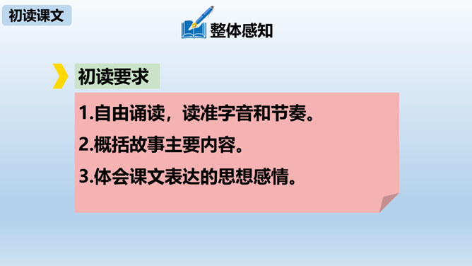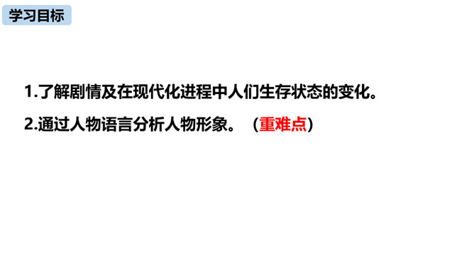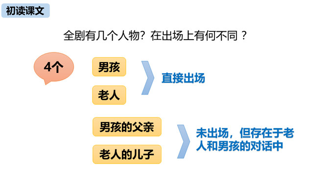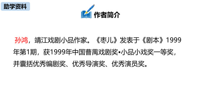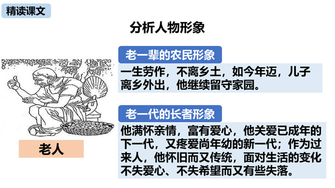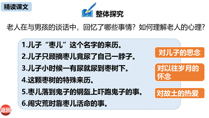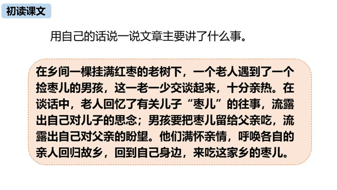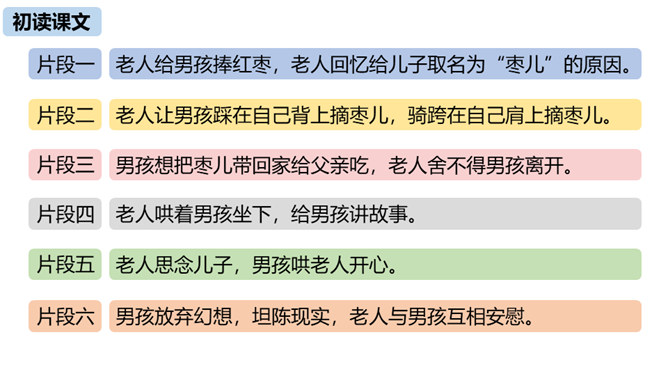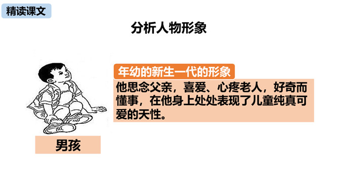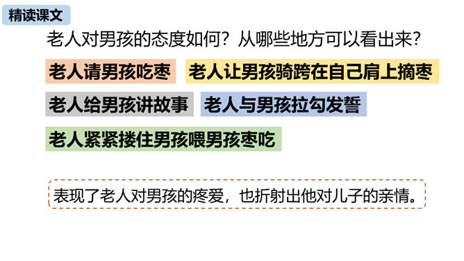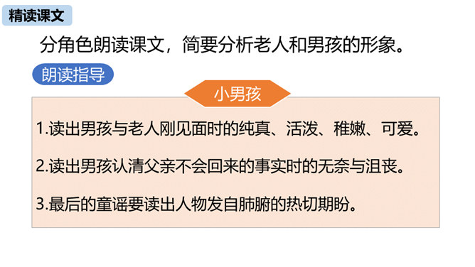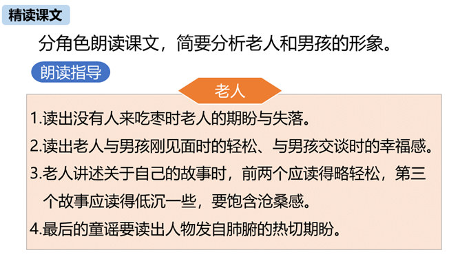 分角色朗读课文,简要分析老人和男孩的形象。小男孩:1.读出男孩与老人刚见面时的纯真、活泼、稚嫩、可爱。2.读出男孩认清父亲不会回来的事实时的无奈与沮丧。3.最后的童谣要读出人物发自肺腑的热切期盼。老人:1.读出没有人来吃枣时老人的期盼与失落。2.读出老人与男孩刚见面时的轻松、与男孩交谈时的幸福感。3.老人讲述关于自己的故事时,前两个应读得略轻松,第三个故事应读得低沉一些,要饱含沧桑感。4.最后的童谣要读出人物发自肺腑的热切期盼。年幼的新生一代的形象:他思念父亲,喜爱、心疼老人,好奇而懂事。所属专题:枣儿ppt。