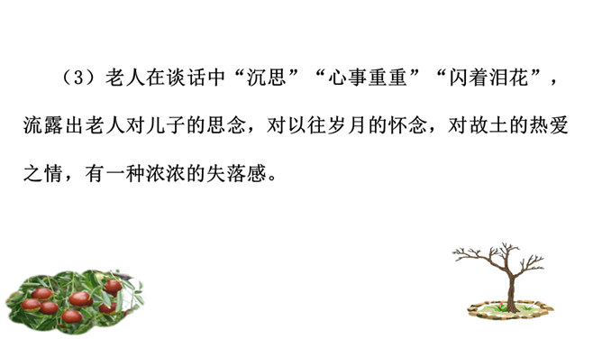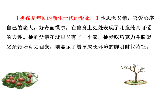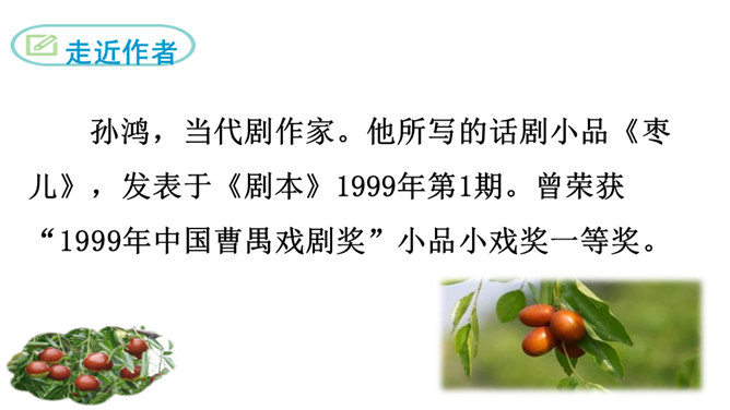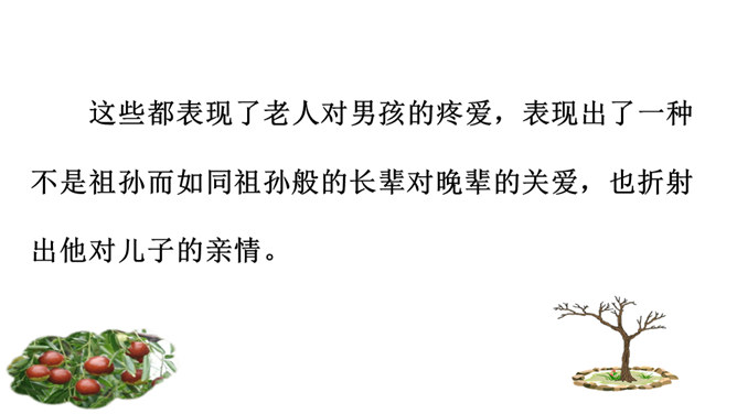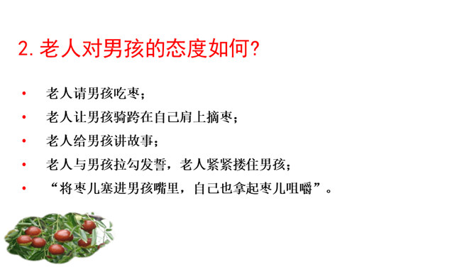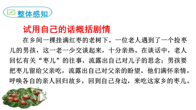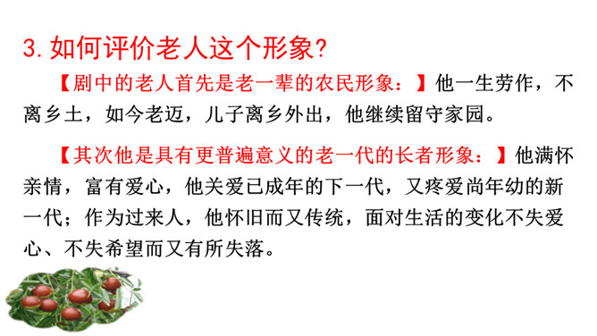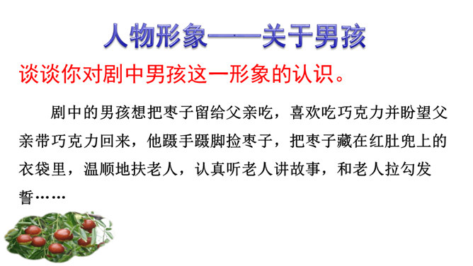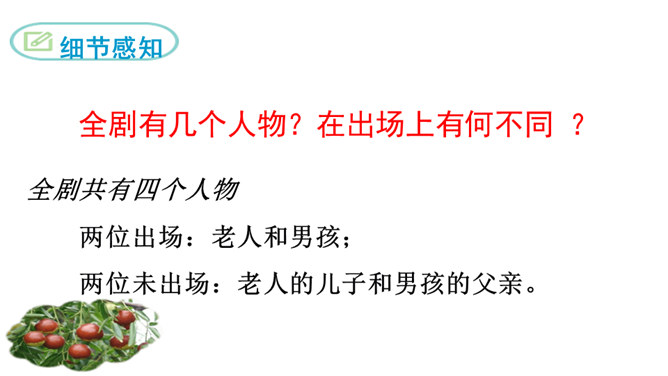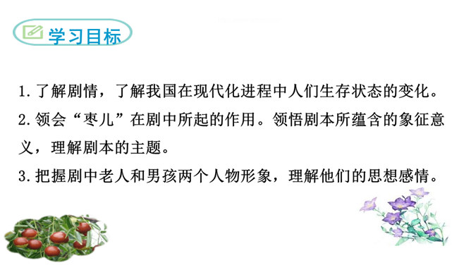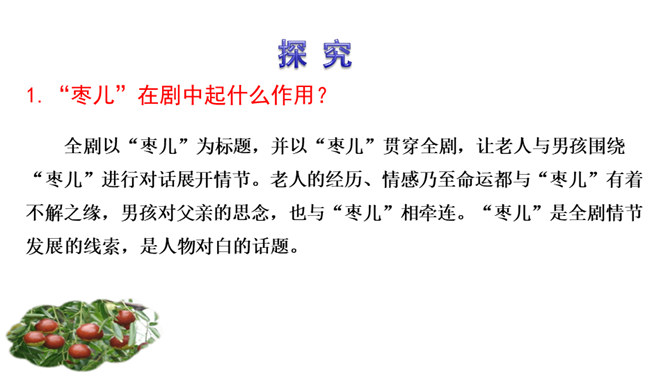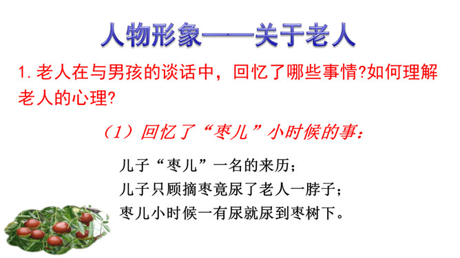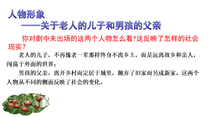 1.了解剧情,了解我国在现代化进程中人们生存状态的变化。2.领会“枣儿”在剧中所起的作用。领悟剧本所蕴含的象征意义,理解剧本的主题。3.把握剧中老人和男孩两个人物形象,理解他们的思想感情。全剧有几个人物?在出场上有何不同 ?全剧共有四个人物,两位出场:老人和男孩;两位未出场:老人的儿子和男孩的父亲。老人在与男孩的谈话中,回忆了哪些事情?如何理解老人的心理? 回忆了“枣儿”小时候的事:儿子“枣儿”一名的来历;儿子只顾摘枣竟尿了老人一脖子;枣儿小时候一有尿就尿到枣树下。所属专题:枣儿ppt。