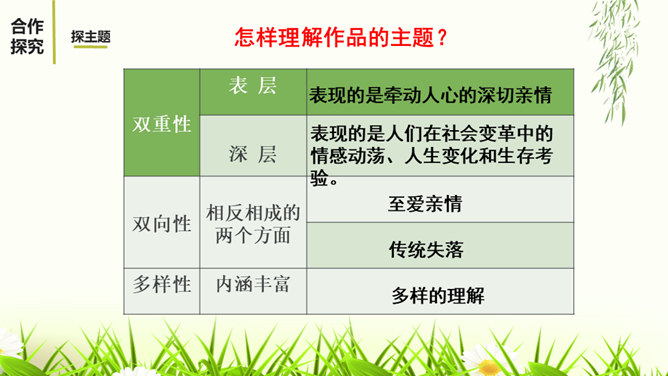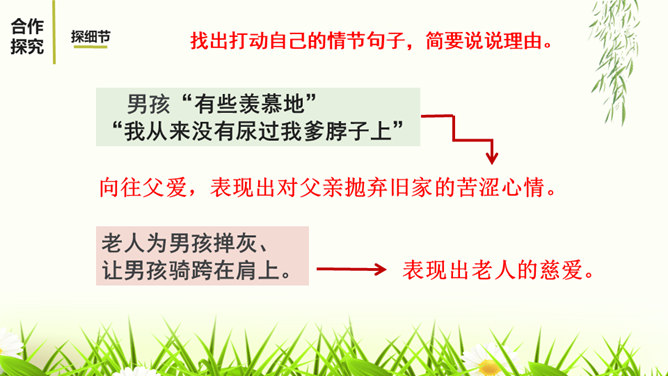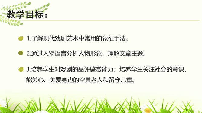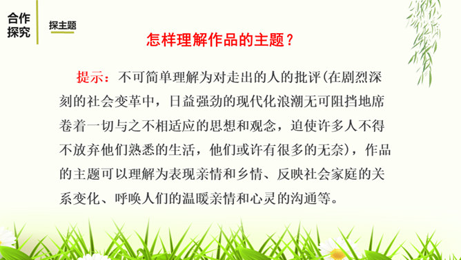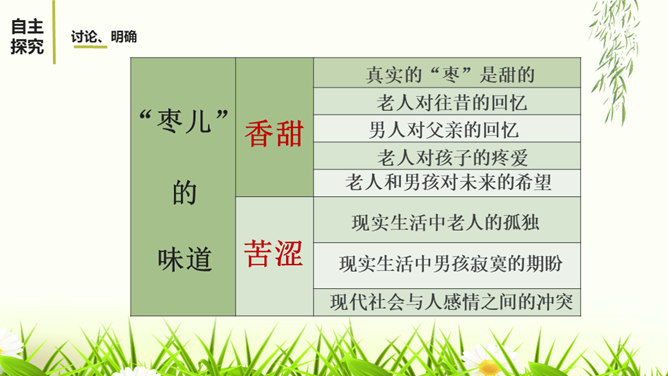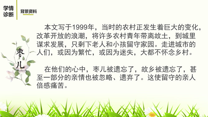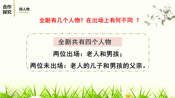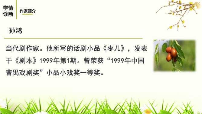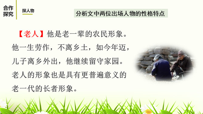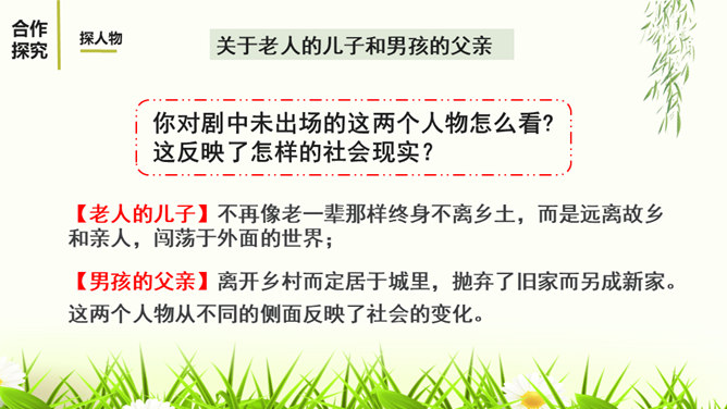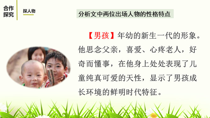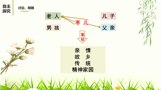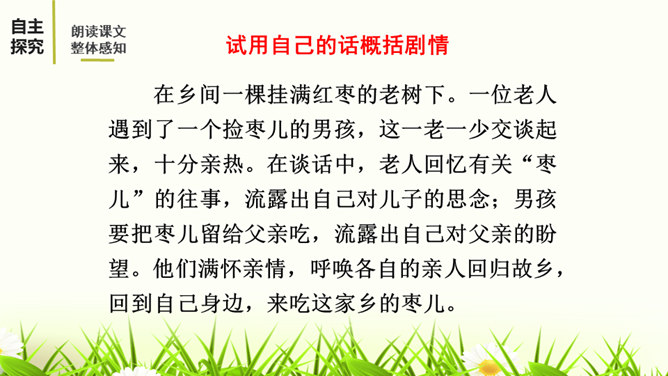 老人对男孩的态度如何?结合剧情简要说明。老人对男孩是十分疼爱的。剧中对老人的语言描写和动作表情描写都表现了老人对男孩的疼爱,舞台提示对表现人物的感情也有不可忽视的重要作用。这些舞台提示大都是人物动作、表情的简要说明。作品首尾都用了同一首童谣,有怎样的表达效果?课文开头和结尾都用了同一首童谣。这首童谣表达了在“枣儿”中所融入的父母疼爱子女的亲情。课文以这种富有民间特色的童谣形式开头,隐含了全剧与“枣儿”有关、与亲情有关的特定内容。结尾也用了这首童谣,但情境有所变化,由幕后换为前台。所属专题:枣儿ppt。