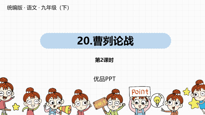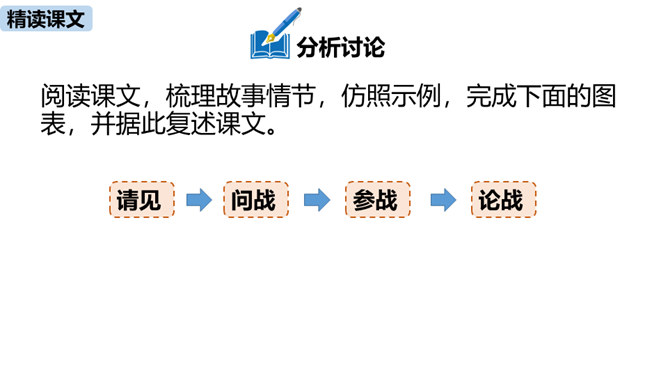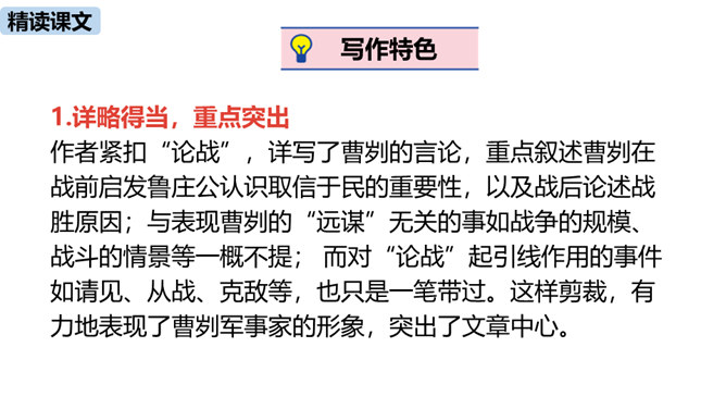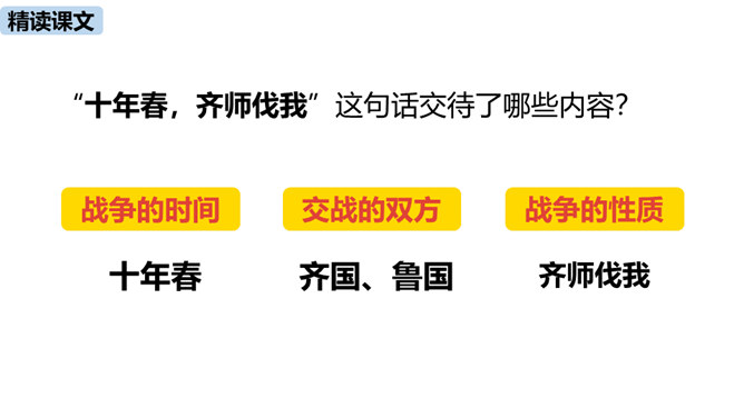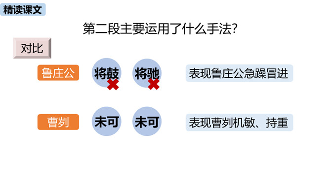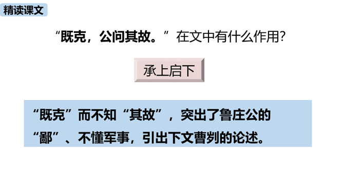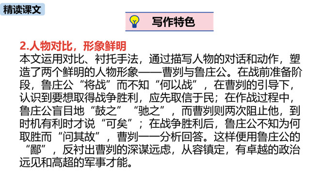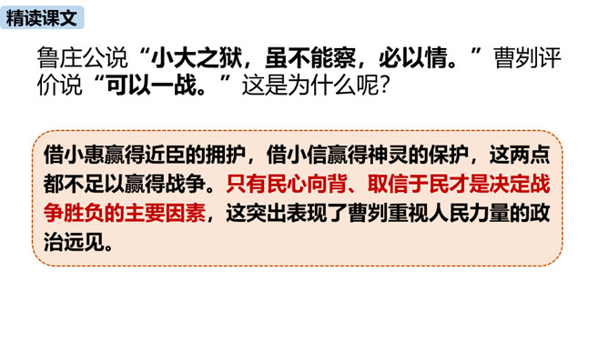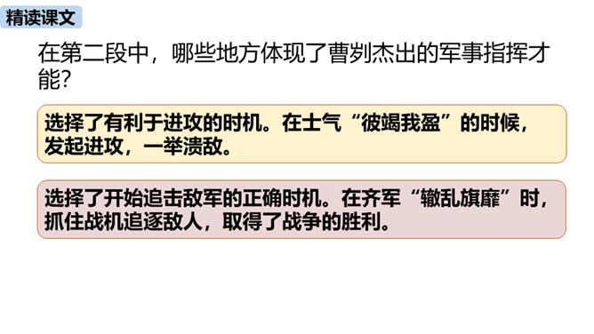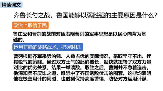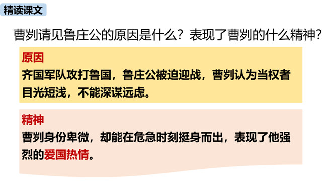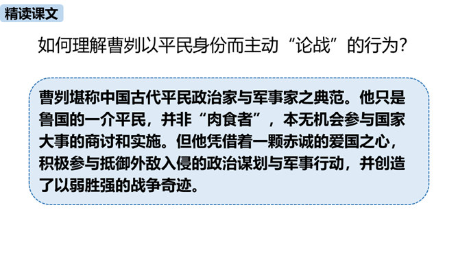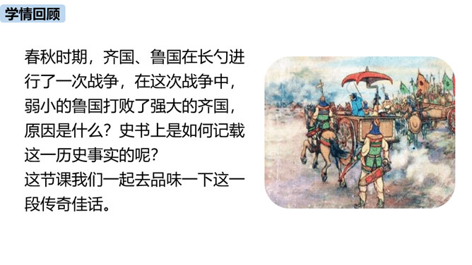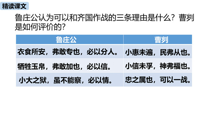 春秋时期,齐国、鲁国在长勺进行了一次战争,在这次战争中,弱小的鲁国打败了强大的齐国,原因是什么?史书上是如何记载这一历史事实的呢?这节课我们一起去品味一下这一段传奇佳话。曹刿请见鲁庄公的原因是什么?表现了曹刿的什么精神?原因:齐国军队攻打鲁国,鲁庄公被迫迎战,曹刿认为当权者目光短浅,不能深谋远虑。精神:曹刿身份卑微,却能在危急时刻挺身而出,表现了他强烈的爱国热情。鲁庄公认为可以和齐国作战的三条理由是什么?曹刿是如何评价的?所属专题:曹刿论战ppt。