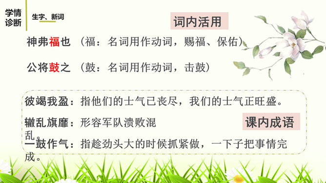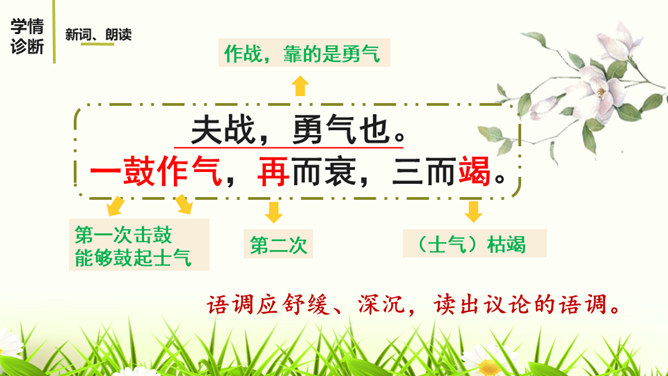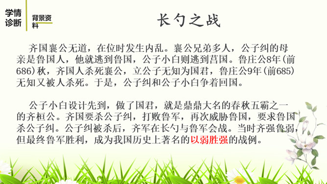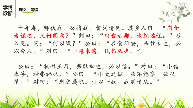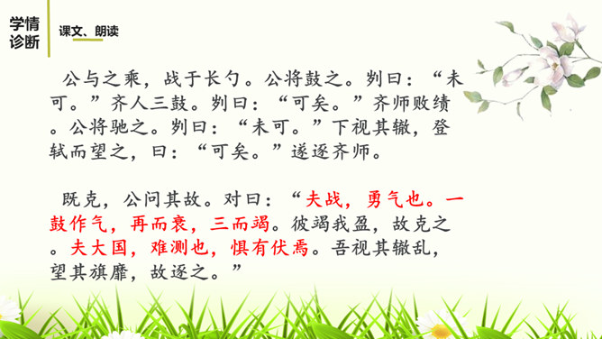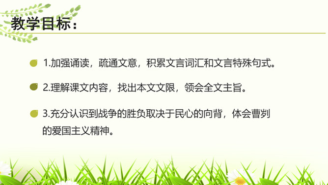 文章详略的安排对突出曹刿的形象有什么好处?战前准备阶段,鲁庄公的三答,借小惠赢得近臣的拥护,借小信赢得神灵的保护,表明他寄战胜的希望于身边的臣子、神灵,而不是百姓。这两点都被曹刿否定。在曹刿的启发下,鲁庄公终于认识到人民的重要性,民心向背是决定战争胜负的主要因素。这突出表现了曹刿重视人民力量的政治远见。鲁庄公把战争的希望寄托在施行“小惠”和祈求神灵的保佑上,说明他政治上的无能;他急于求战,急于攻击,说明他军事上的无知。所属专题:曹刿论战ppt。