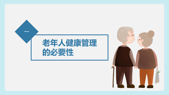 老年人健康管理PPT模板。包括老年人健康管理的必要性、老年人的健康管理的流程、老年人常见健康问题及应对、老年人运动饮食指导几部分。