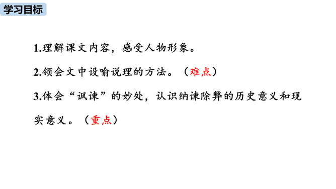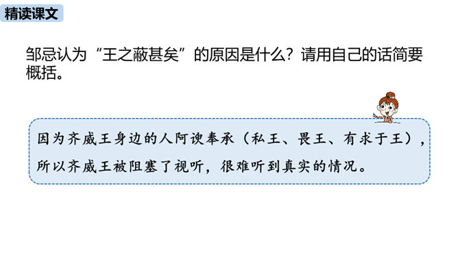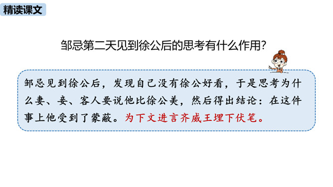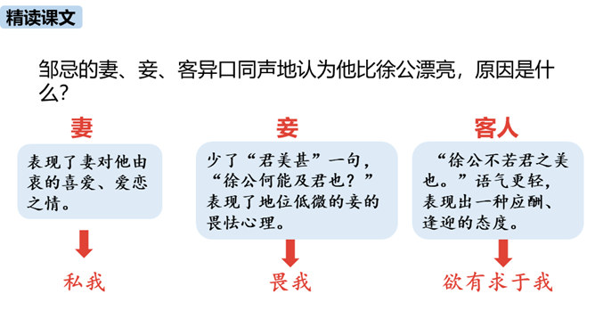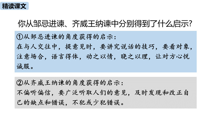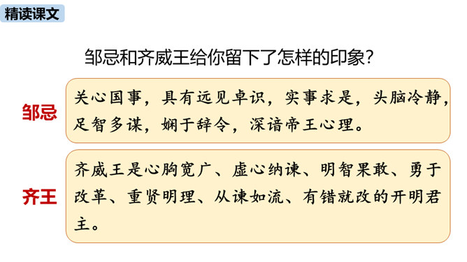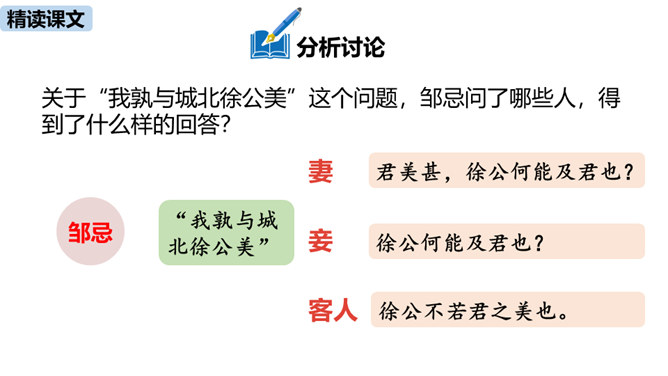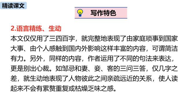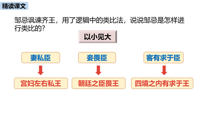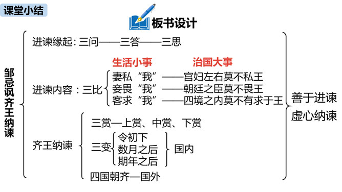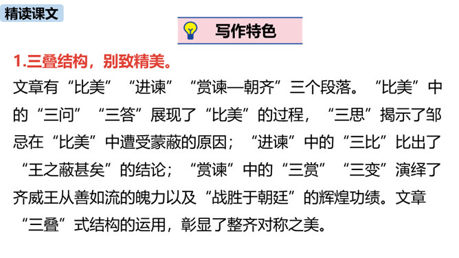文章有“比美”“进谏”“赏谏—朝齐”三个段落。“比美”中的“三问”“三答”展现了“比美”的过程,“三思”揭示了邹忌在“比美”中遭受蒙蔽的原因;“进谏”中的“三比”比出了“王之蔽甚矣”的结论;“赏谏”中的“三赏”“三变”演绎了齐威王从善如流的魄力以及“战胜于朝廷”的辉煌功绩。文章“三叠”式结构的运用,彰显了整齐对称之美。本文仅仅用了三四百字,就完整地表现了由家庭琐事到国家大事、由个人感触到国内外影响这样丰富的内容,可谓简洁有力。同样的内容,作者运用了不同的句法来表达,更是别出心裁。所属专题:邹忌讽齐王纳谏ppt。