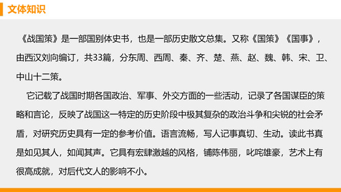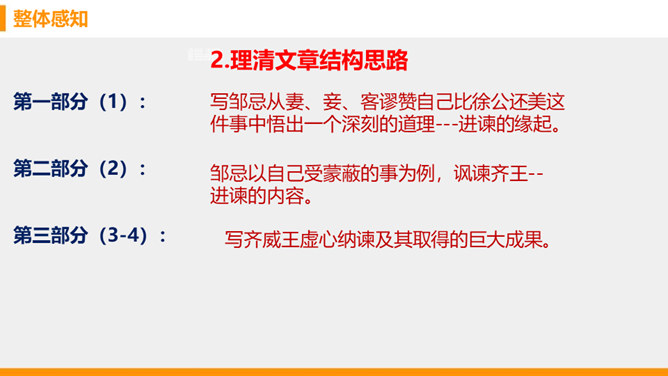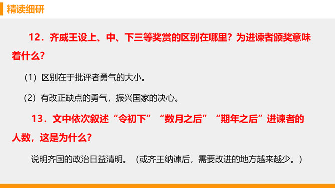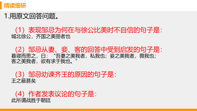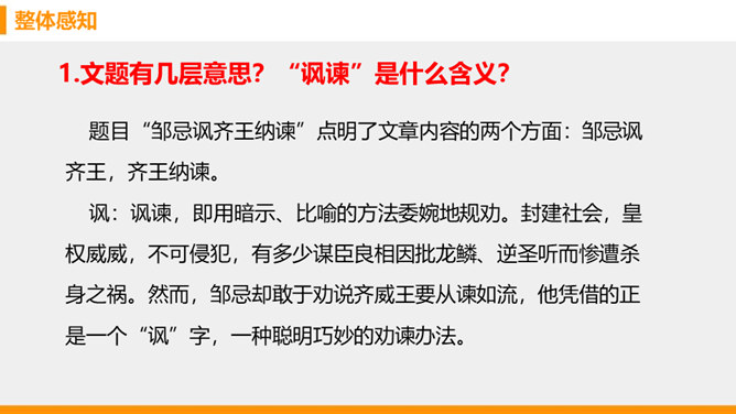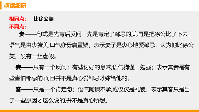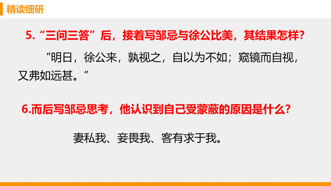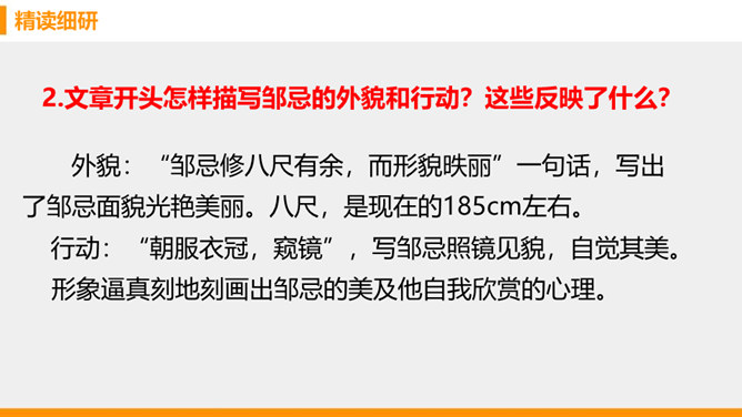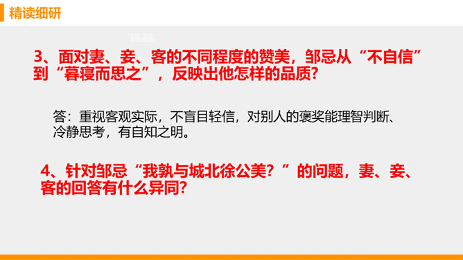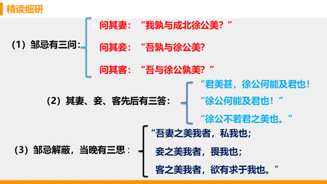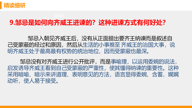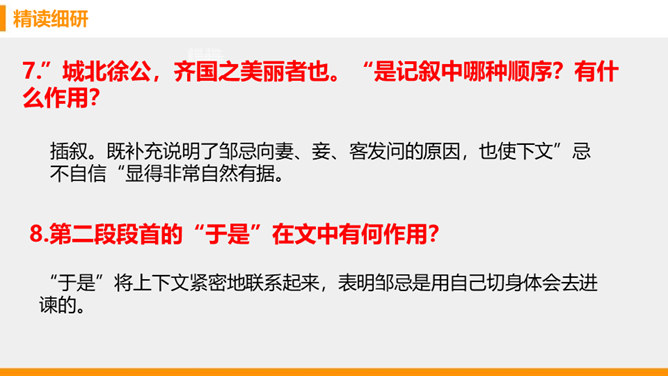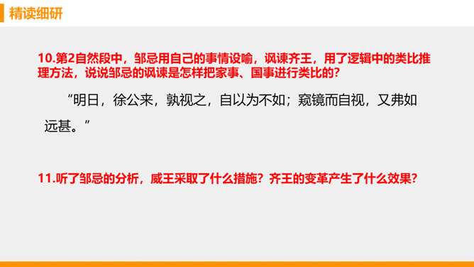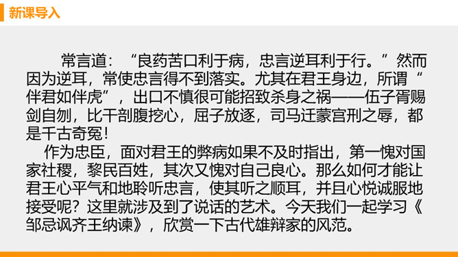 叙事简洁,剪裁巧妙。对邹忌与徐公比美的情节,作者作了绘声绘色的描绘,对他的进谏,却只作概括的叙述。对臣民的进谏,也突出重点,记叙“令初下”“数月之后”“期年之后”三个时期的不同情况,使读者从中体会到齐王纳谏后的巨大变化,而对齐王最初受蔽之深、齐国积弊之多以及具体如何改革等,都只从侧面暗示,略而不写,使文章的中心更加突出。三问三答,也没有从每个人的形态上去描写,而是通过不同语言来显现人物对问题的不同态度。用笔简约,辞约意丰。设喻说理,说服力强。设喻说理是本文最显著的写作特点。所属专题:邹忌讽齐王纳谏ppt。