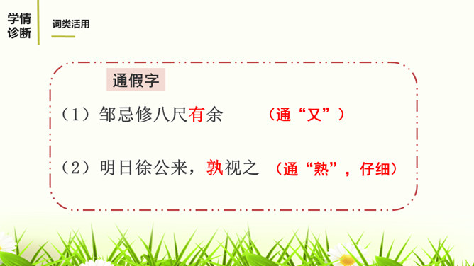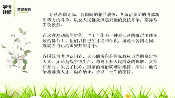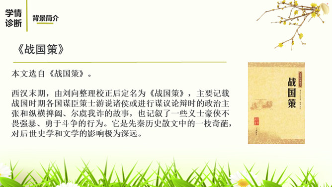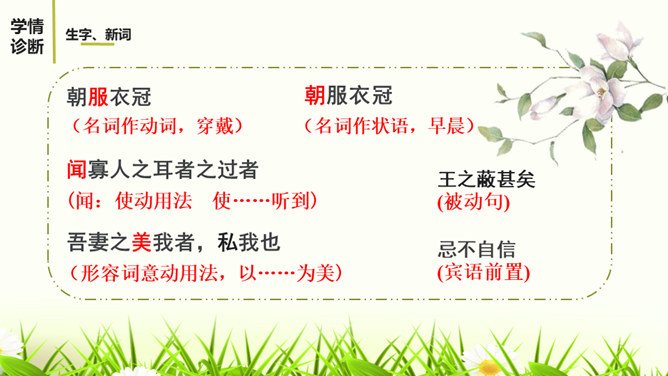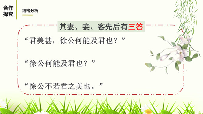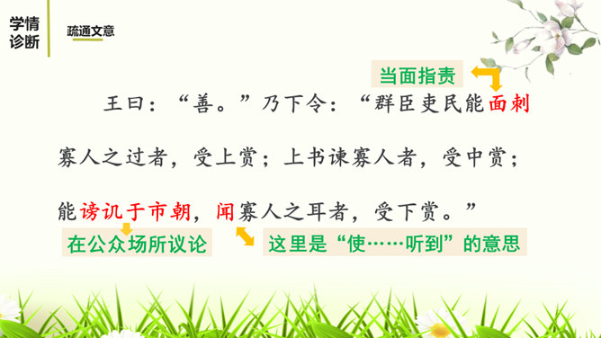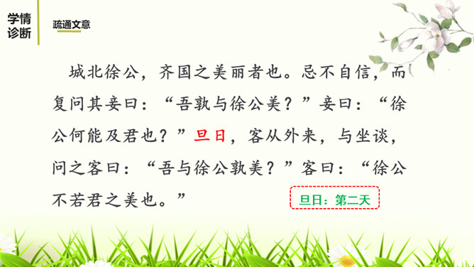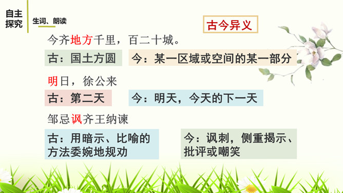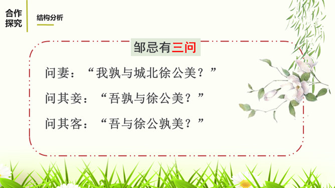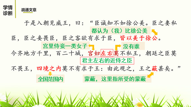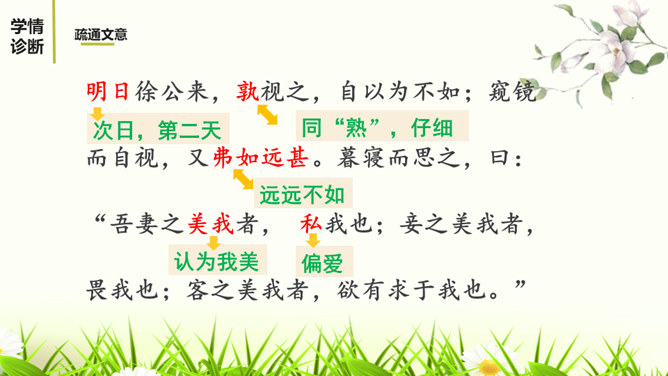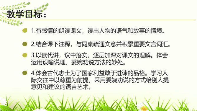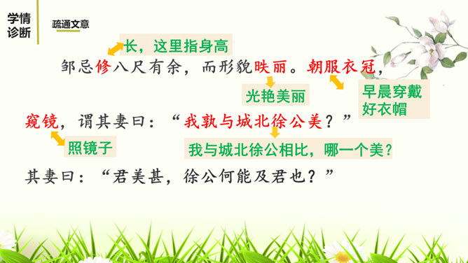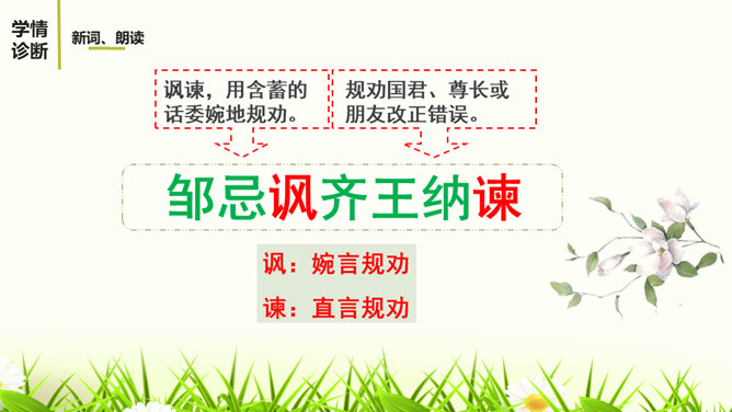 1.有感情的朗读课文,读出人物的语气和故事的情境。2.结合课下注释,与同桌疏通文意并积累重要文言词汇。3.以读代讲,议中落实,逐层加深对课文的理解。体会运用设喻说理,委婉劝说方法的妙处。4.体会古代志士为了国家利益敢于进谏的品格。学习人际交往中以尊重为前提,采用委婉劝说的方式给别人提意见和建议的语言艺术。邹忌是一个尊重客观事实的人,不偏听偏信,能正确审视自己和对待别人,还敢于向帝王进谏,这种精神是难能可贵的。我们应从其身上吸取精华,继承优良品质,树立起正确的价值取向,争取比古人做得更好。所属专题:邹忌讽齐王纳谏ppt。