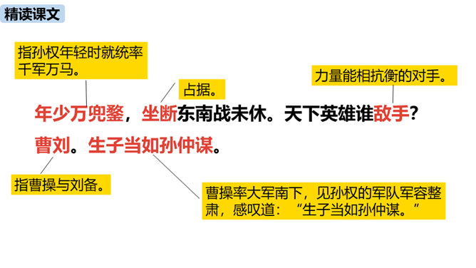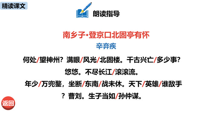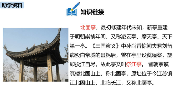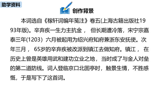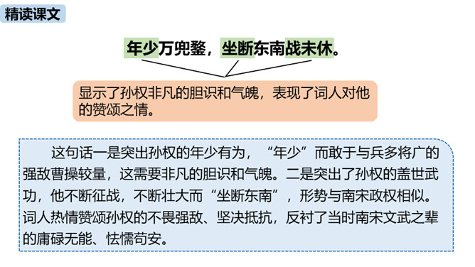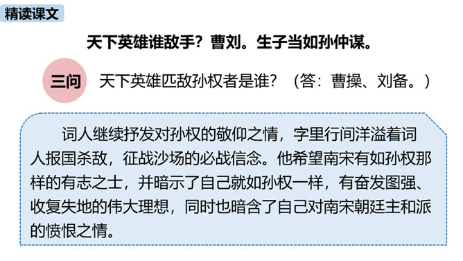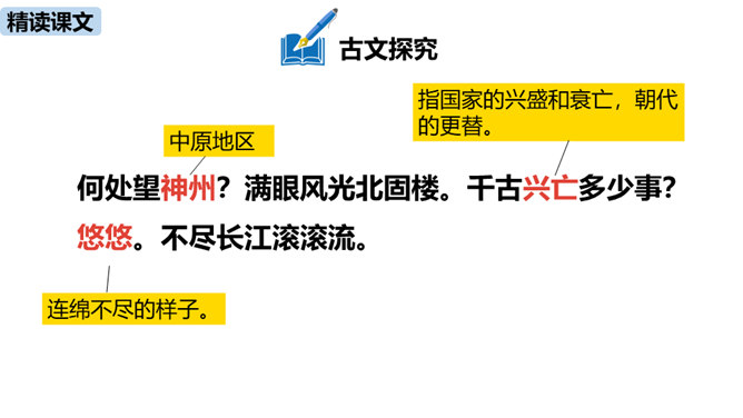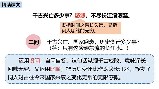 “不尽长江滚滚流”既是实写也是虚写,请结合具体内容简要分析。词人登上北固楼,遥望故国神州,满眼风光之中自然有滚滚东流的长江,所以是实景描写。同时,词人由眼前的自然风光联想到历史上的兴亡之事,悠悠岁月,犹如奔流的长河,淹没了历史的风云,所以此句又暗指时间的流逝,也是虚写。本词上、下片各运用了什么手法?有什么表达效果?上片即景抒情,词人登高望远,感受到千古兴亡之事已经逝去,唯有滚滚长江,不舍昼夜,短暂和永恒形成对比,表达了词人对中原故土的怀念。下片用典,表现了词人怀古伤今的无限感慨。