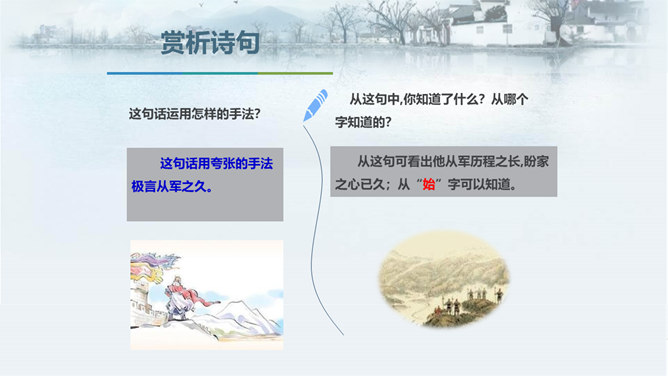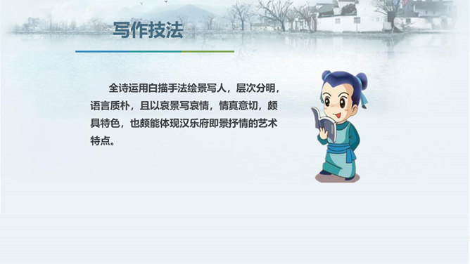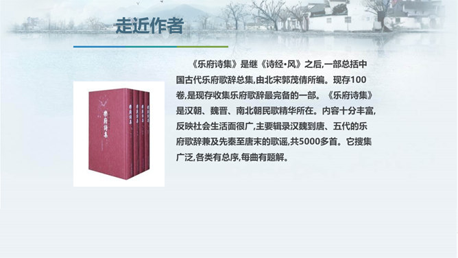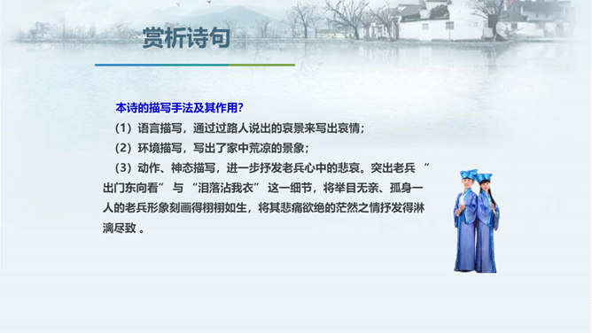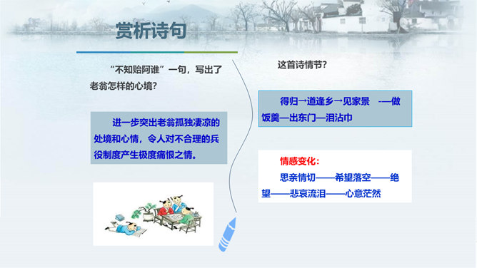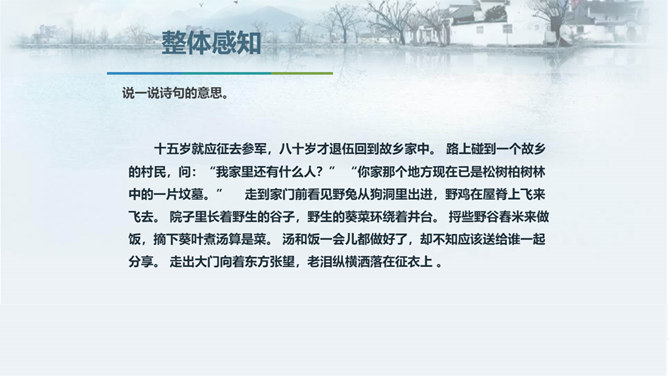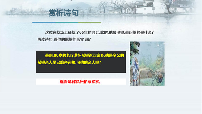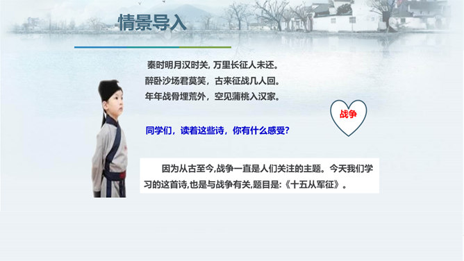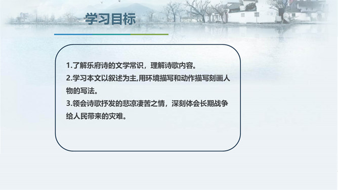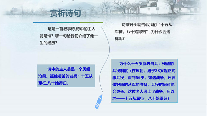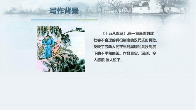 1.了解乐府诗的文学常识,理解诗歌内容。2.学习本文以叙述为主,用环境描写和动作描写刻画人物的写法。3.领会诗歌抒发的悲凉凄苦之情,深刻体会长期战争给人民带来的灾难。这是一首暴露封建社会不合理的兵役制度的汉代乐府民歌,反映了劳动人民在当时黑暗的兵役制度下的不平和痛苦。作品真实、深刻、令人感愤,催人泣下。这是一首叙事诗,诗中的主人翁是谁?哪一句给我们介绍了他一生的经历?诗中的主人翁是一个历经沧桑、孤独凄苦的老兵;十五从军征,八十始得归。诗歌开头就告诉我们“十五从军征,八十始得归” 为什么会这样呢?所属专题:十五从军征ppt。