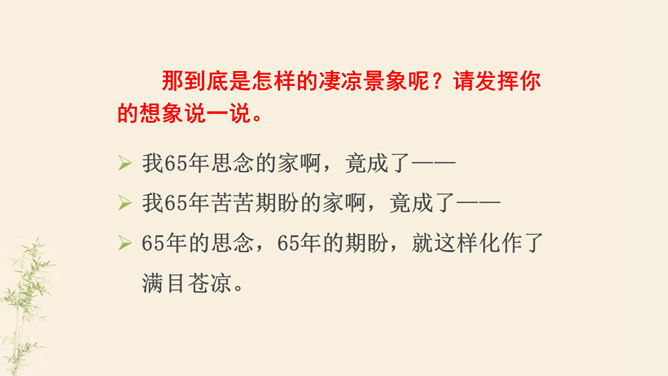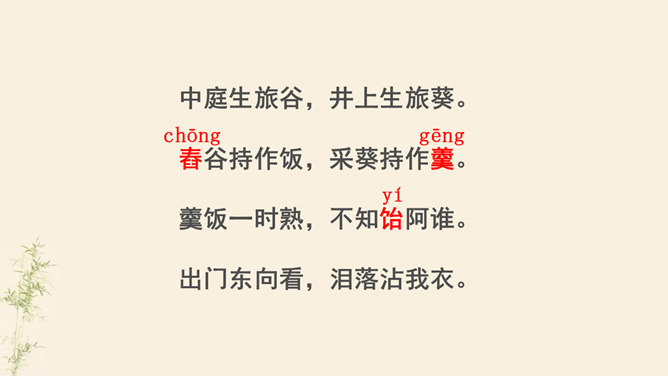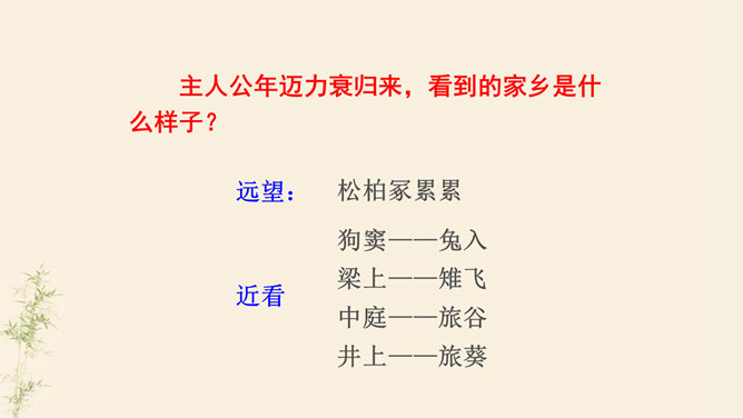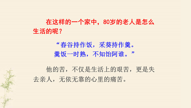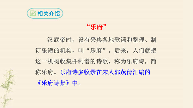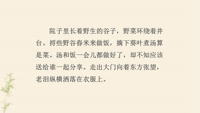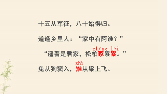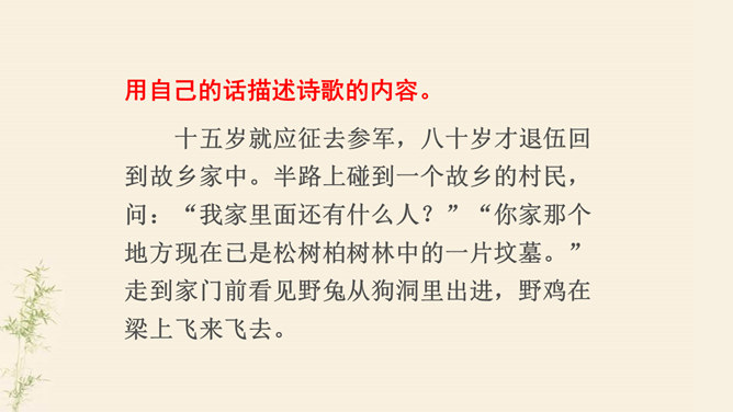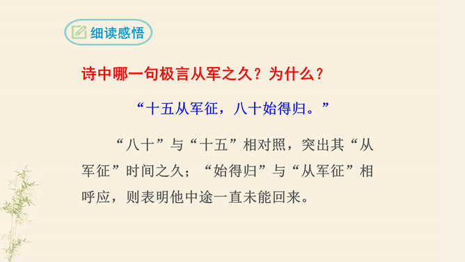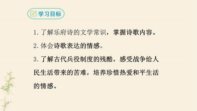 了解乐府诗的文学常识,掌握诗歌内容。了解古代兵役制度的残酷,感受战争给人民生活带来的苦难,培养珍惜热爱和平生活的情感。动作描写:进一步抒发老兵心中的悲哀。突出老兵“出门东向看”与“泪落沾我衣”这一细节,将举目无亲、孤身一人的老兵形象刻画得栩栩如生,将其悲痛欲绝的茫然之情抒发得淋漓尽致。他在泣什么?他为什么而泣呢?请同学们发挥想象提笔写下来,一段话即可。反对战争,渴望和平是从古至今咱们每一个老百姓的心愿。但是即便在今天,在这个看似和平的世界上,仍有很多的国家和地区的人们在从事着战争,你想对他们说什么?所属专题:十五从军征ppt。