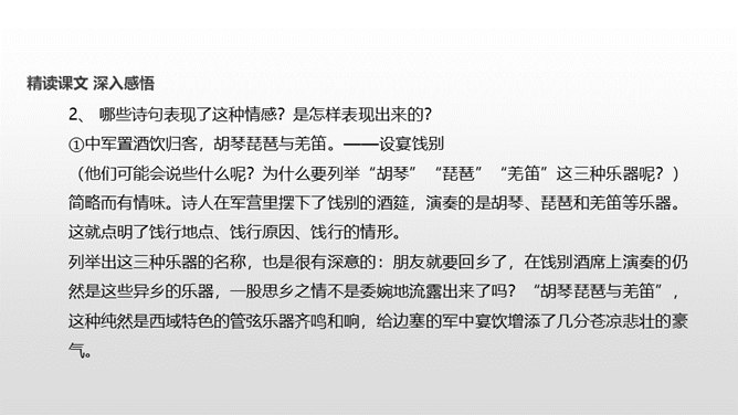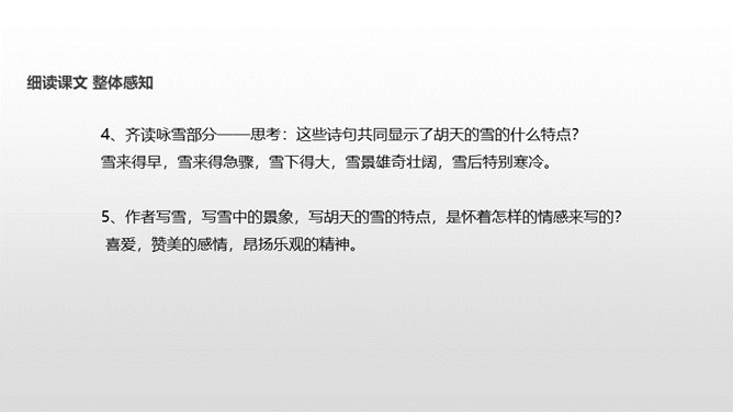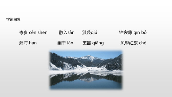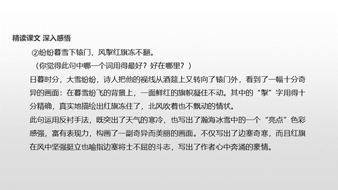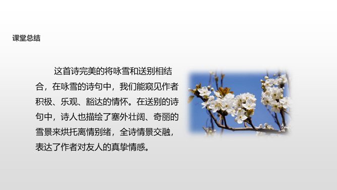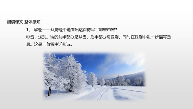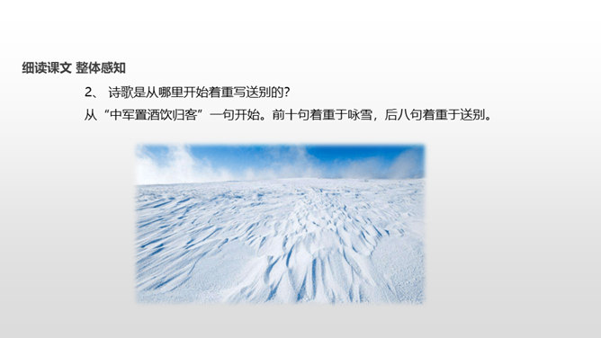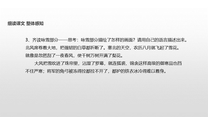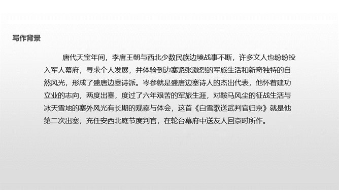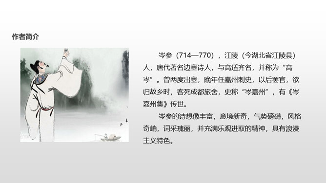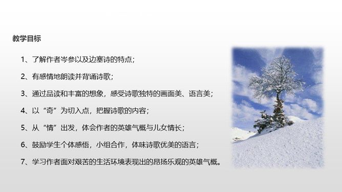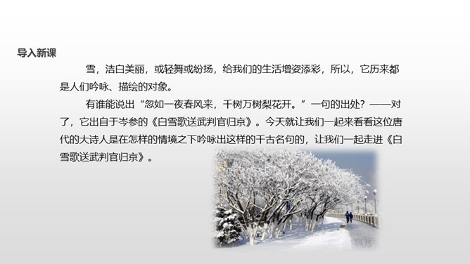 了解作者岑参以及边塞诗的特点;有感情地朗读并背诵诗歌;通过品读和丰富的想象,感受诗歌独特的画面美、语言美;以“奇”为切入点,把握诗歌的内容;从“情”出发,体会作者的英雄气概与儿女情长;鼓励学生个体感悟,小组合作,体味诗歌优美的语言;学习作者面对艰苦的生活环境表现出的昂扬乐观的英雄气概。齐读咏雪部分——思考:咏雪部分描绘了怎样的画面?请用自己的语言描述出来。北风席卷着大地,把强韧的白草都折断了。塞北的天空,农历八月就飞起了雪花。就像是忽然刮了一夜春风,使千树万树开满了梨花。所属专题:白雪歌送武判官归京ppt。
