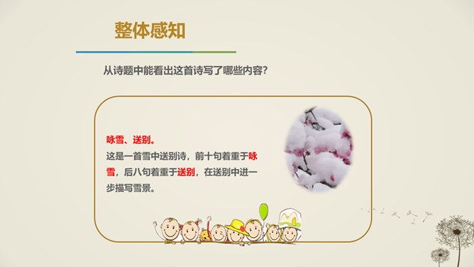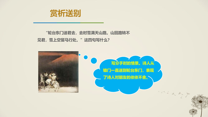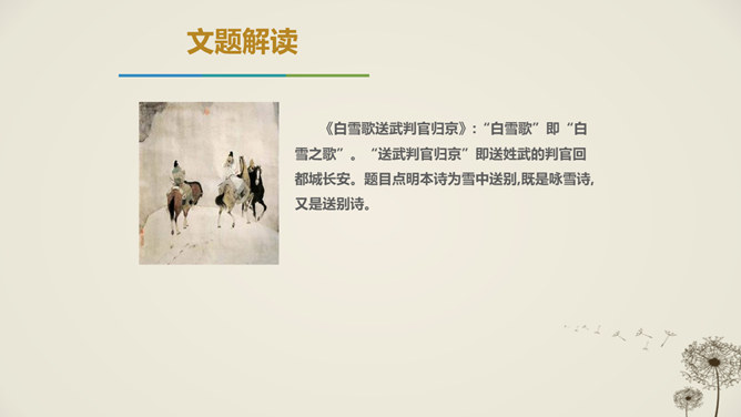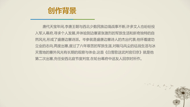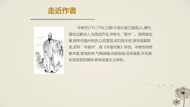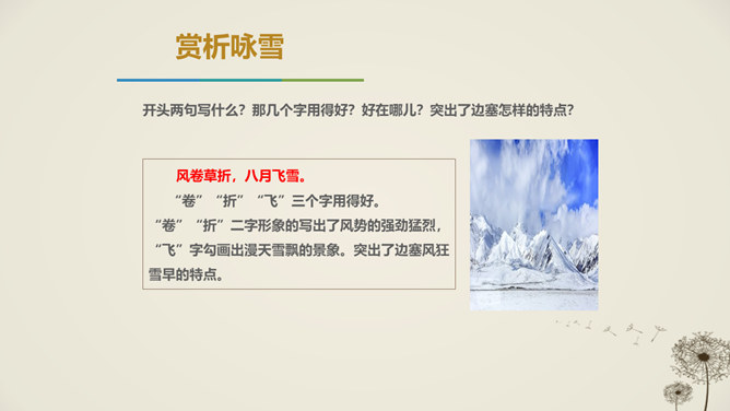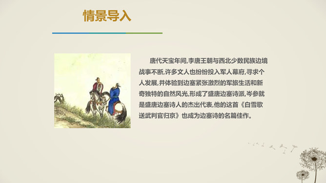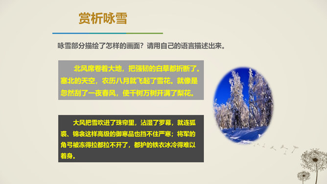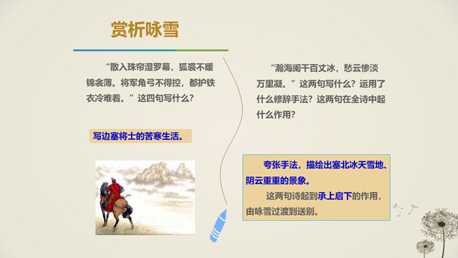 唐代天宝年间,李唐王朝与西北少数民族边境战事不断,许多文人也纷纷投入军人幕府,寻求个人发展,并体验到边塞紧张激烈的军旅生活和新奇独特的自然风光,形成了盛唐边塞诗派,岑参就是盛唐边塞诗人的杰出代表。1.感悟诗歌语言美、意境美,领悟作者的思想感情。2.通过反复朗读,理解诗歌的内容;通过研读品析,体会诗人情感,激发个体感悟。3.发挥想象,培养学生的审美体验和审美情趣。咏雪部分描绘了怎样的画面?请用自己的语言描述出来。大风把雪吹进了珠帘里,沾湿了罗幕,就连狐裘、锦衾这样高级的御寒品也挡不住严寒。所属专题:白雪歌送武判官归京ppt。