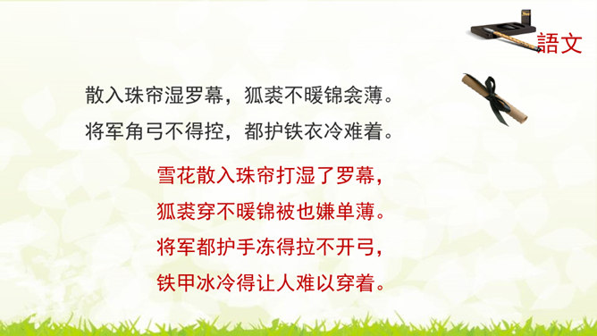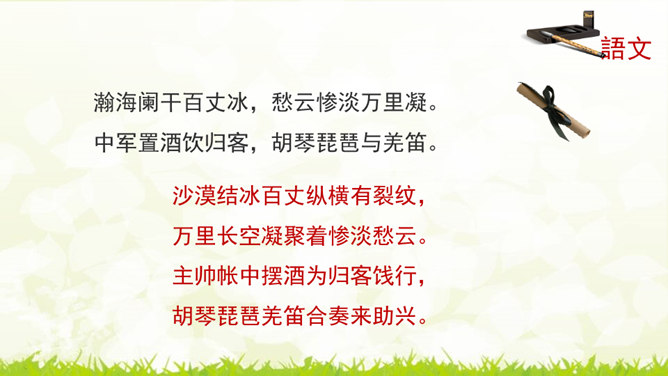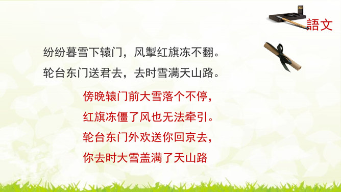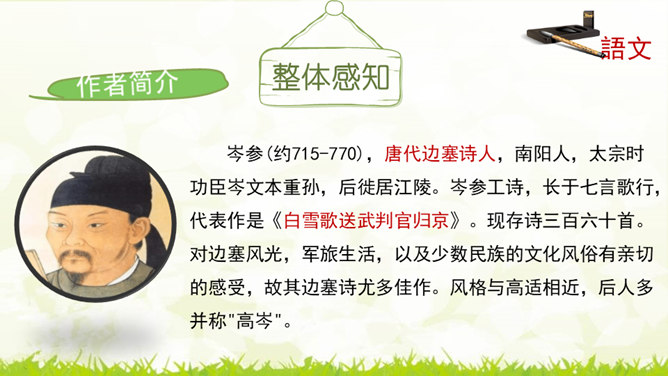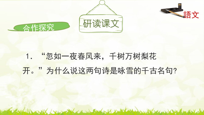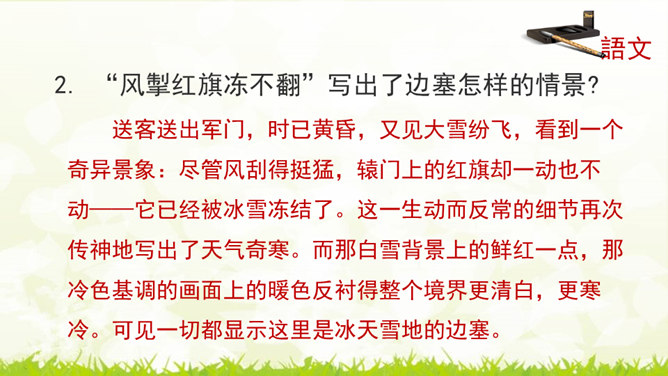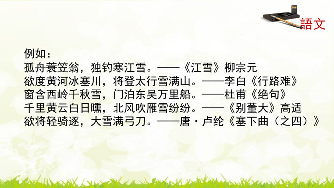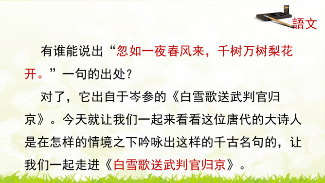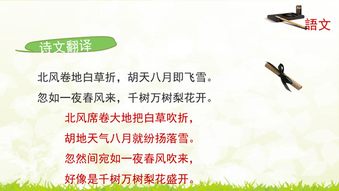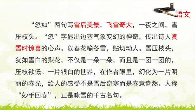 这两句是诗人由眼前的景色而展开的联想:望着披上银妆的树木,诗人忽然觉得自己好像已置身于大好春光之中,那强劲的春风,一夜之间竟吹开了这千树万树的梨花,一个“忽”字,不仅表现了边塞气象变化的神奇,而且传达出诗人赏雪时的惊喜心情。比喻辞格的运用,既清新而贴切写出了边塞特有的奇异风光,又表现了诗人开阔的胸襟。此诗抒写塞外送别、雪中送客之情,却充满奇思异想,并不令人感到伤感。诗中所表现出来的浪漫理想和壮逸情怀使人觉得塞外风雪变成了可玩味欣赏的对象。所属专题:白雪歌送武判官归京ppt。
