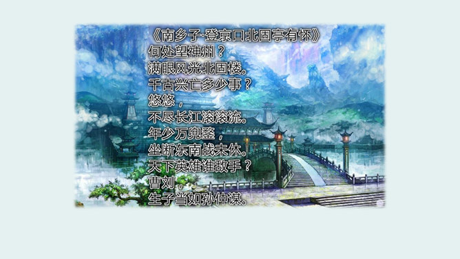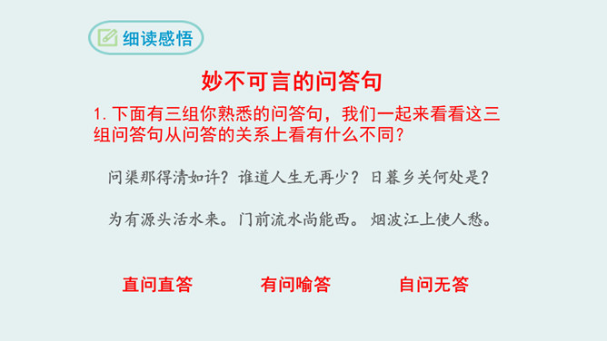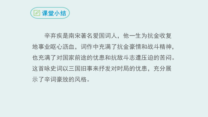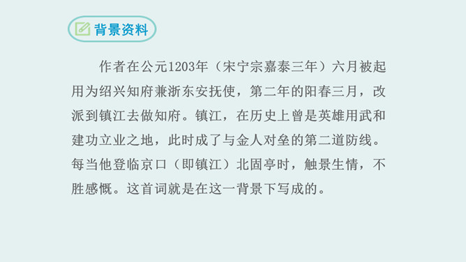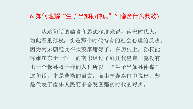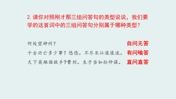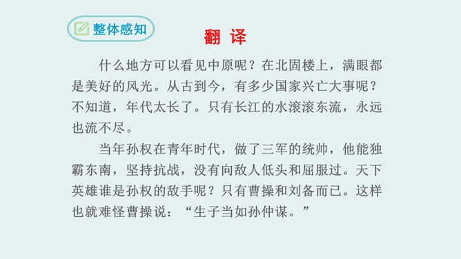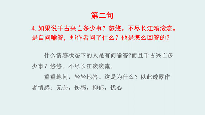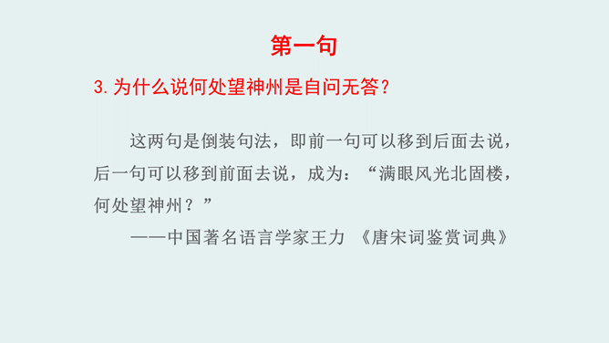 为什么说何处望神州是自问无答?这两句是倒装句法,即前一句可以移到后面去说,后一句可以移到前面去说,成为:“满眼风光北固楼,何处望神州?”如果说千古兴亡多少事?悠悠。不尽长江滚滚流。是自问喻答,那作者问了什么?他是怎么回答的? 什么情感状态下的人是有问喻答?而且千古兴亡多少事?悠悠。不尽长江滚滚流。重重地问,轻轻地答。这是为什么?以此透露作者情感:无奈,伤感,抑郁,忧心。“天下英雄谁敌手?曹刘。”这个问句怎么读?坚定,毫不迟疑地。问后略停,以示肯定语气。所属专题:南乡子·登京口北固亭有怀ppt。