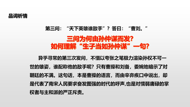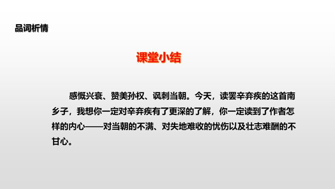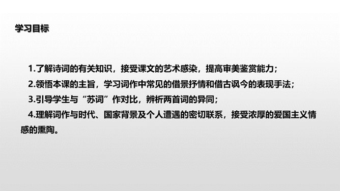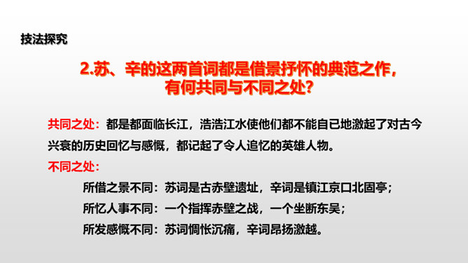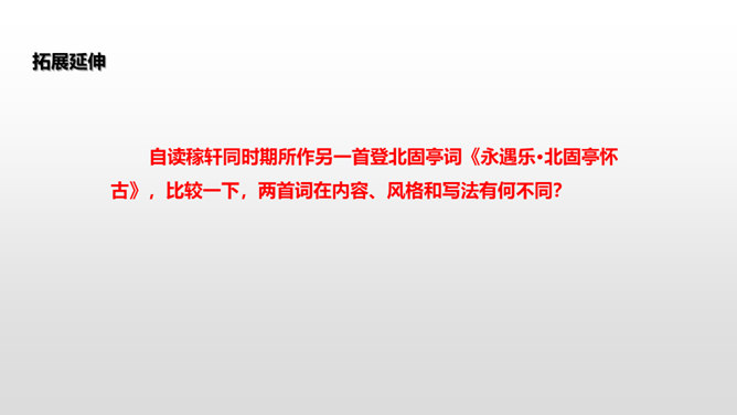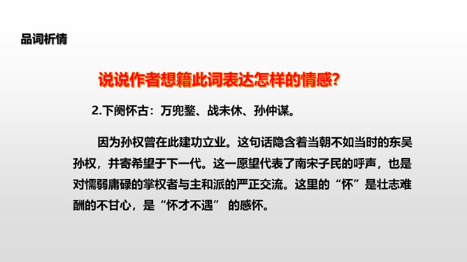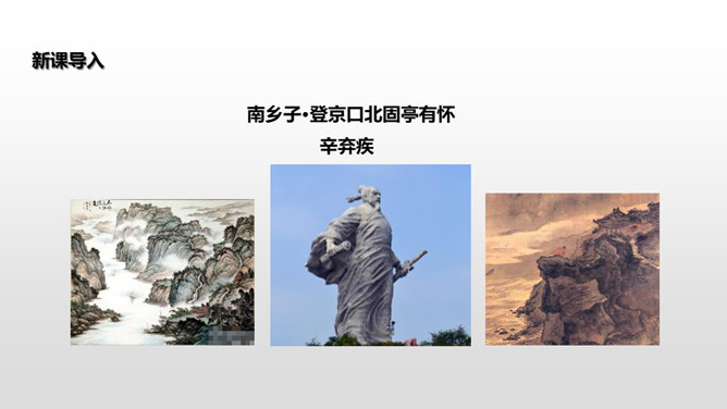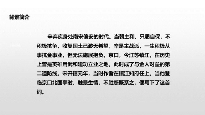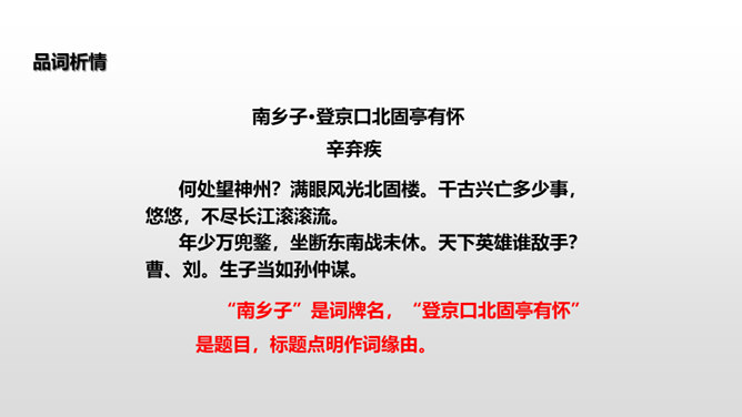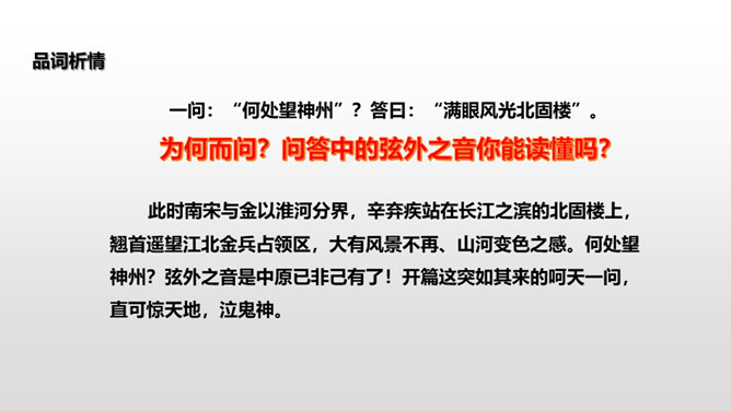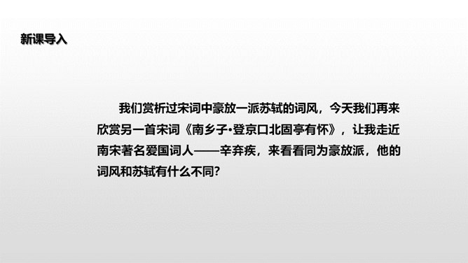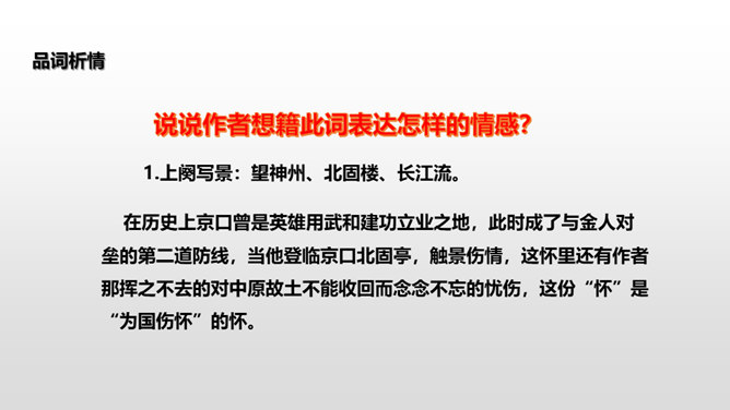 1.了解诗词的有关知识,接受课文的艺术感染,提高审美鉴赏能力;2.领悟本课的主旨,学习词作中常见的借景抒情和借古讽今的表现手法;3.引导学生与“苏词”作对比,辨析两首词的异同;4.理解词作与时代、国家背景及个人遭遇的密切联系,接受浓厚的爱国主义情感的熏陶。为何而问?问答中的弦外之音你能读懂吗?此时南宋与金以淮河分界,辛弃疾站在长江之滨的北固楼上,翘首遥望江北金兵占领区,大有风景不再、山河变色之感。何处望神州?弦外之音是中原已非己有了!开篇这突如其来的呵天一问,直可惊天地,泣鬼神。所属专题:南乡子·登京口北固亭有怀ppt。