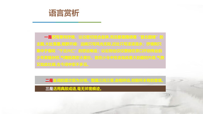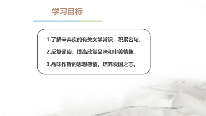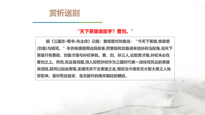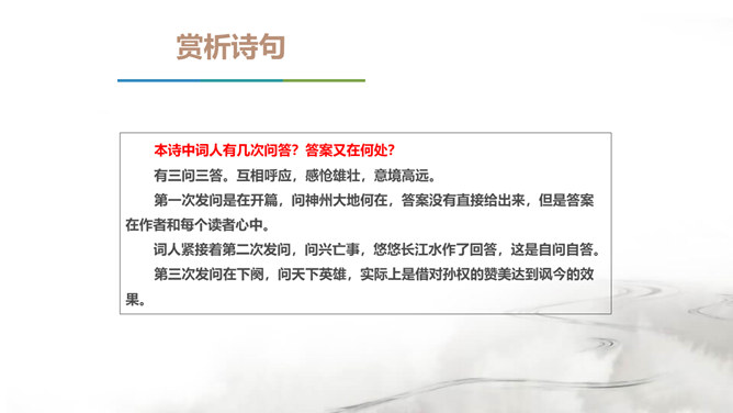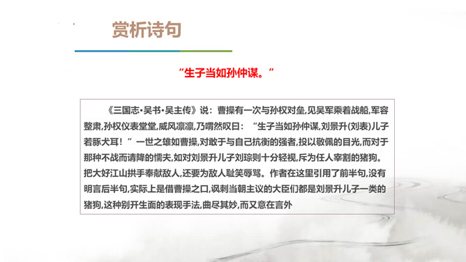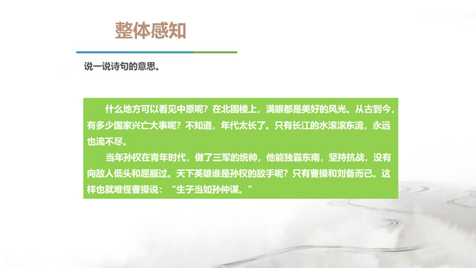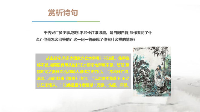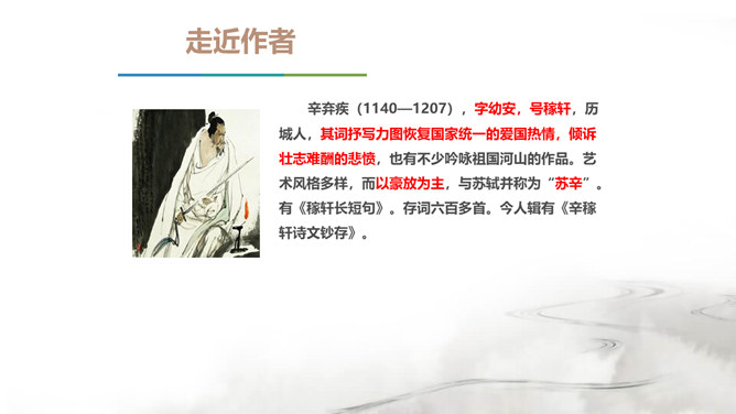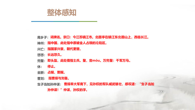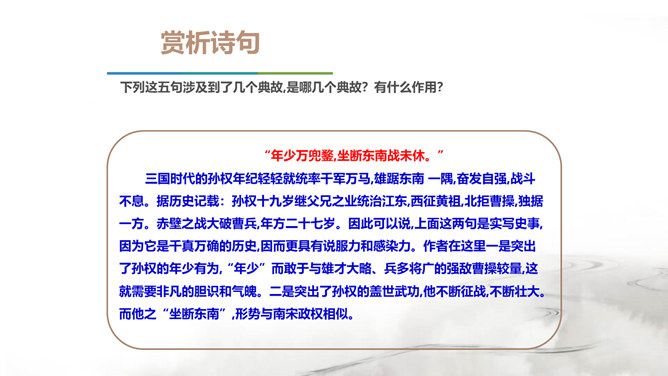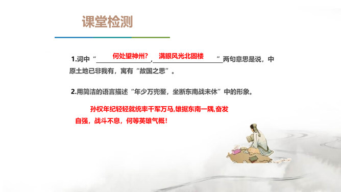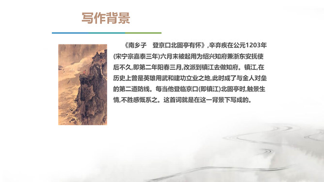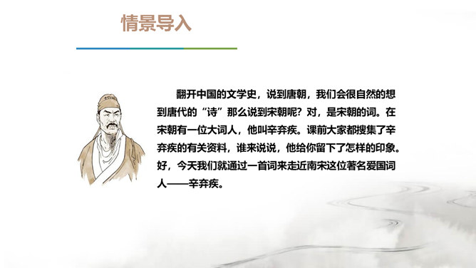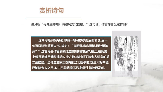 翻开中国的文学史,说到唐朝,我们会很自然的想到唐代的“诗”那么说到宋朝呢?对,是宋朝的词。在宋朝有一位大词人,他叫辛弃疾。课前大家都搜集了辛弃疾的有关资料,谁来说说,他给你留下了怎样的印象。好,今天我们就通过一首词来走近南宋这位著名爱国词人——辛弃疾。1.了解辛弃疾的有关文学常识,积累名句。2.反复诵读,提高欣赏品味和审美情趣。3.品味作者的思想感情,培养爱国之志。本诗中词人有几次问答?答案又在何处?有三问三答。互相呼应,感怆雄壮,意境高远。所属专题:南乡子·登京口北固亭有怀ppt。