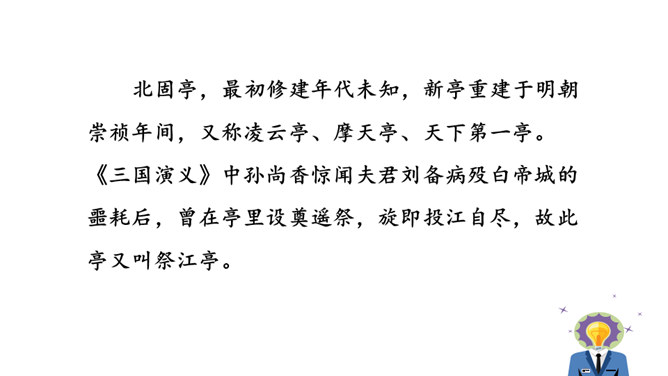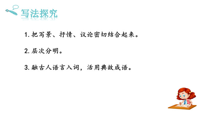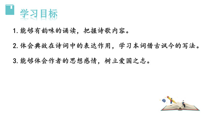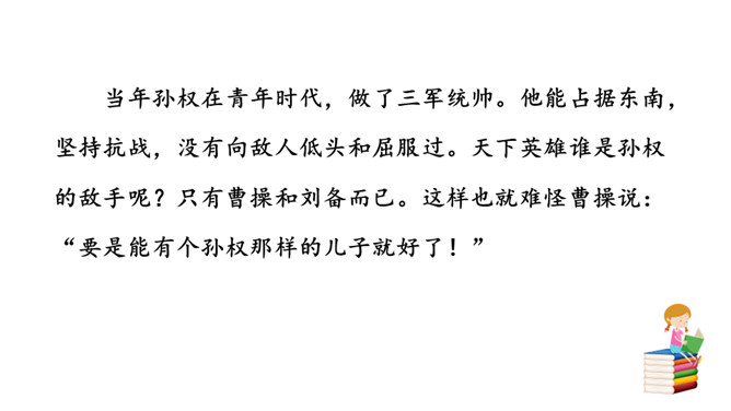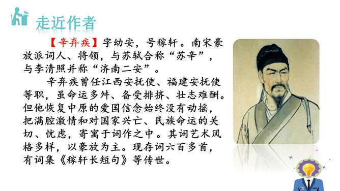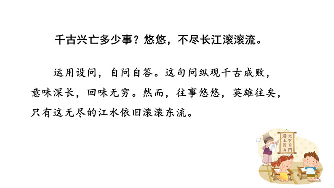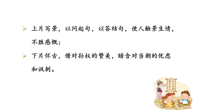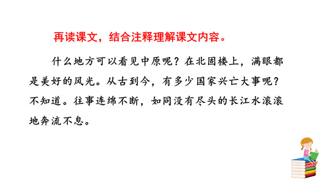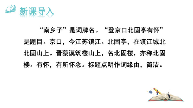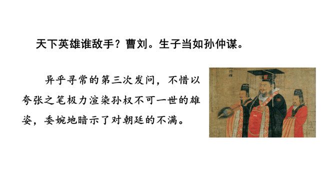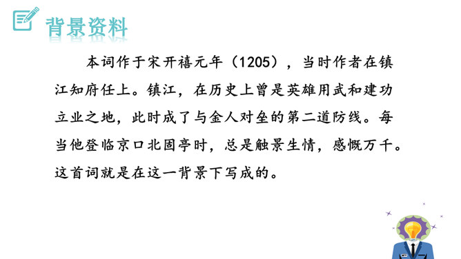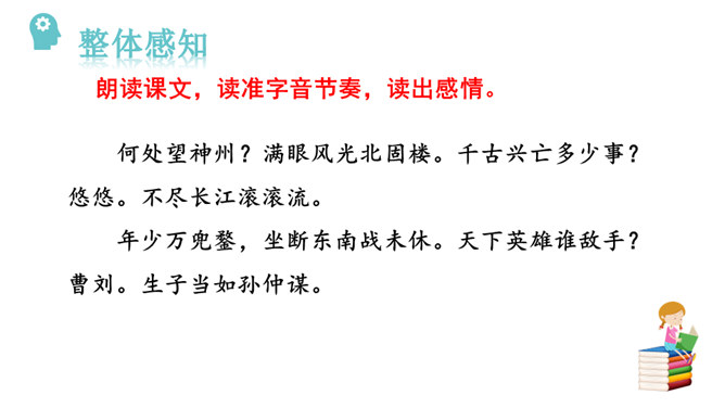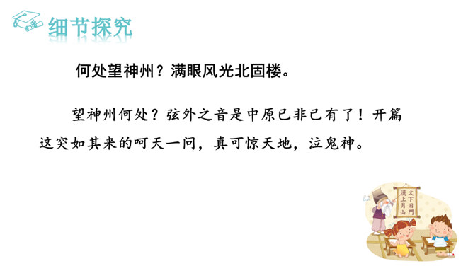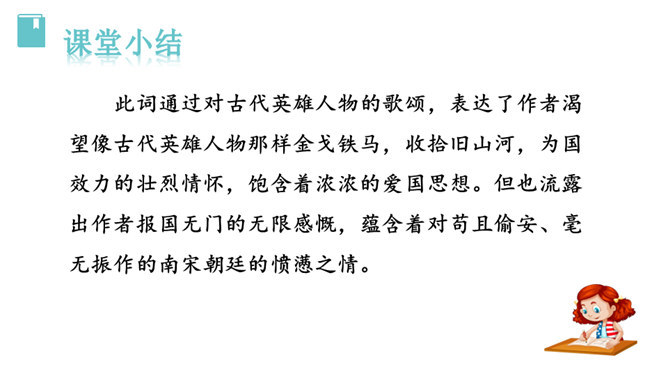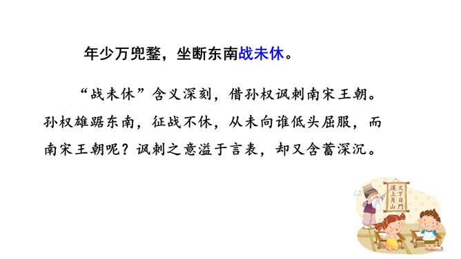 再读课文,结合注释理解课文内容。什么地方可以看见中原呢?在北固楼上,满眼都是美好的风光。从古到今,有多少国家兴亡大事呢?不知道。往事连绵不断,如同没有尽头的长江水滚滚地奔流不息。当年孙权在青年时代,做了三军统帅。他能占据东南,坚持抗战,没有向敌人低头和屈服过。天下英雄谁是孙权的敌手呢?只有曹操和刘备而已。这样也就难怪曹操说:“要是能有个孙权那样的儿子就好了!”望神州何处?弦外之音是中原已非己有了!开篇这突如其来的呵天一问,真可惊天地,泣鬼神。所属专题:南乡子·登京口北固亭有怀ppt。