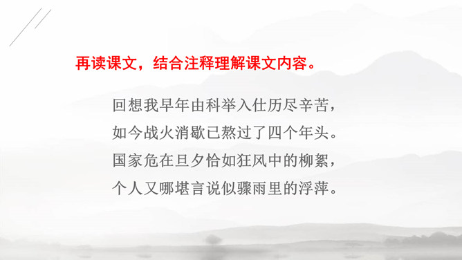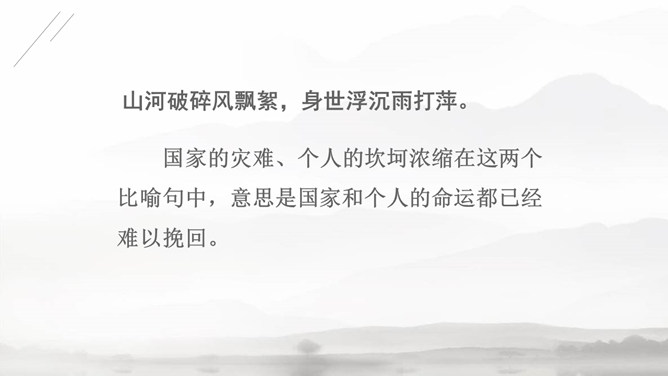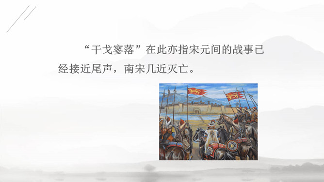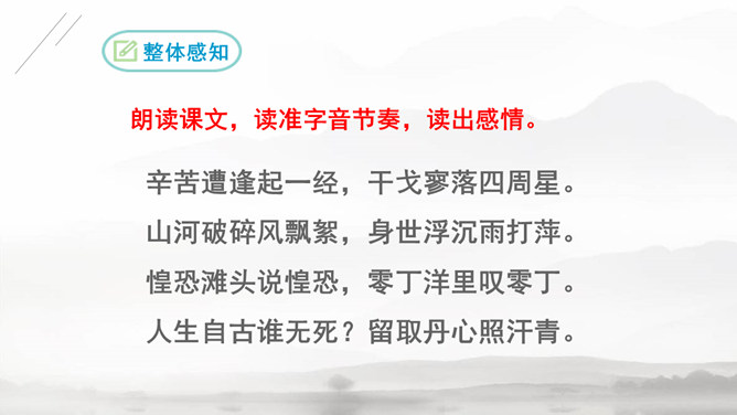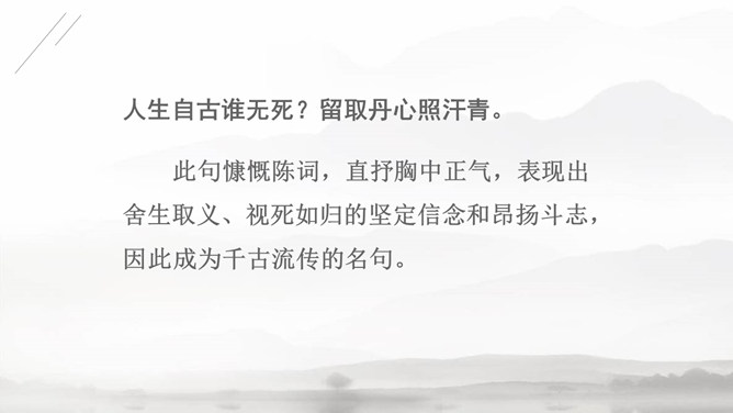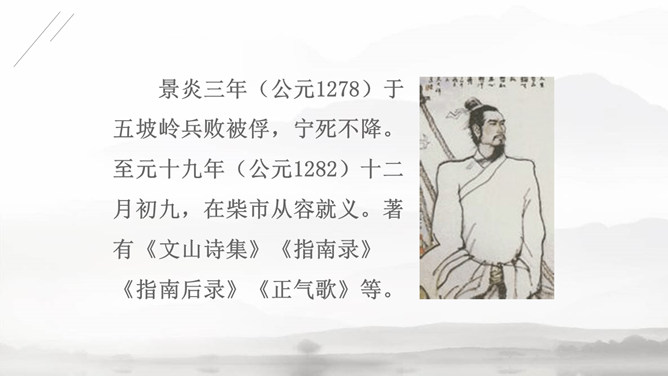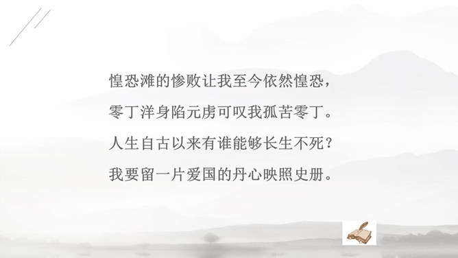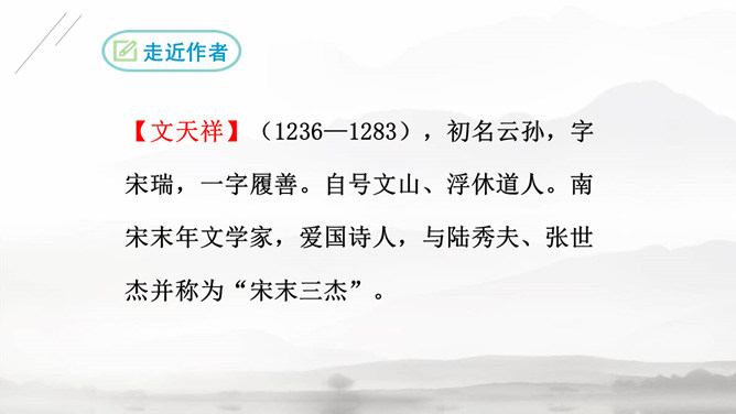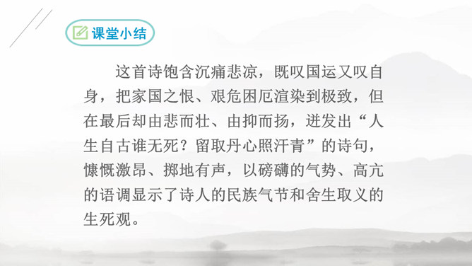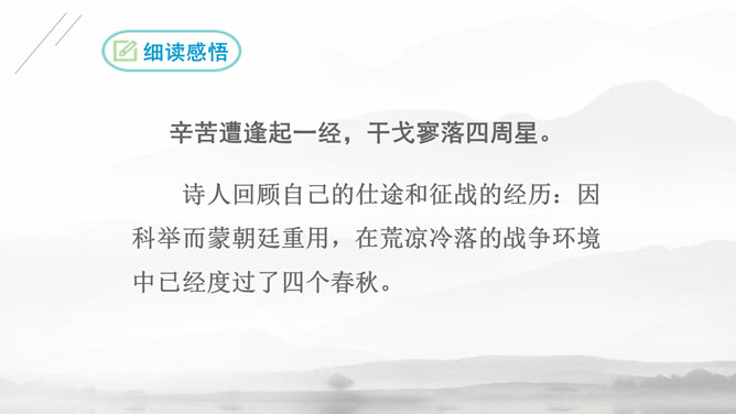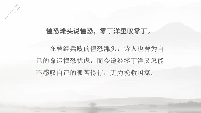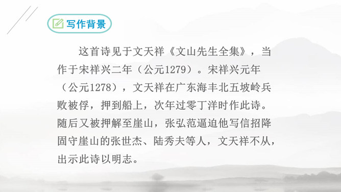 诗人回顾自己的仕途和征战的经历:因科举而蒙朝廷重用,在荒凉冷落的战争环境中已经度过了四个春秋。“干戈寥落”在此亦指宋元间的战事已经接近尾声,南宋几近灭亡。国家的灾难、个人的坎坷浓缩在这两个比喻句中,意思是国家和个人的命运都已经难以挽回。在曾经兵败的惶恐滩头,诗人也曾为自己的命运惶恐忧虑,而今途经零丁洋又怎能不感叹自己的孤苦伶仃,无力挽救国家。此句慷慨陈词,直抒胸中正气,表现出舍生取义、视死如归的坚定信念和昂扬斗志,因此成为千古流传的名句。