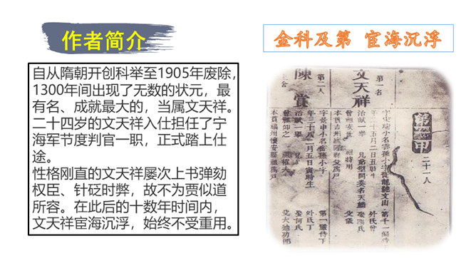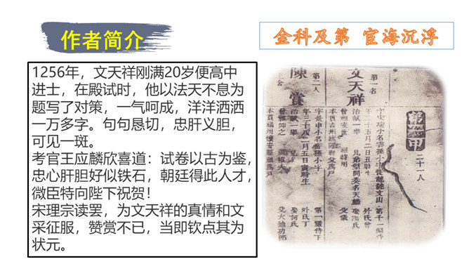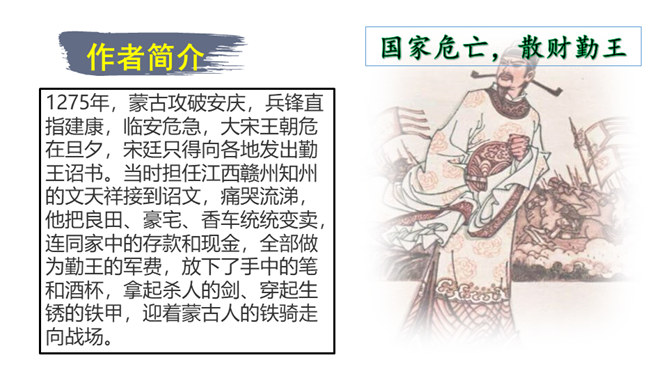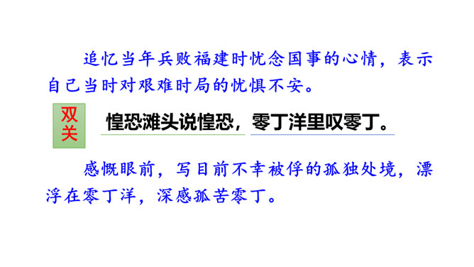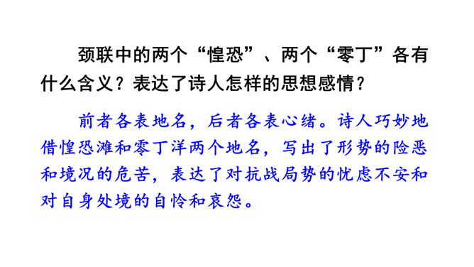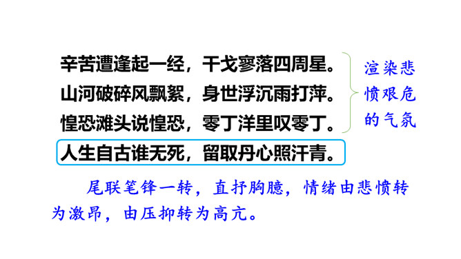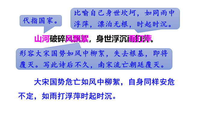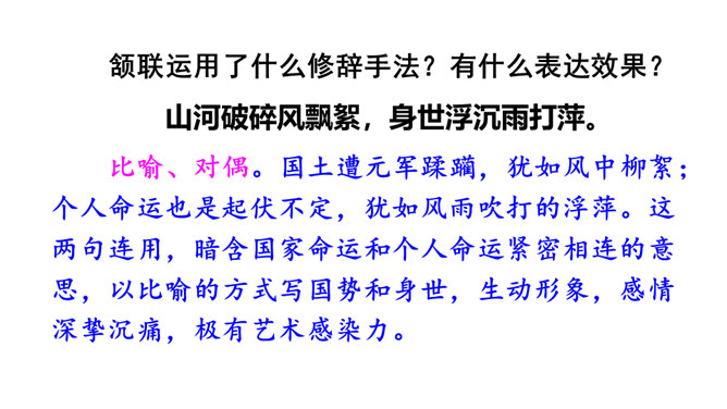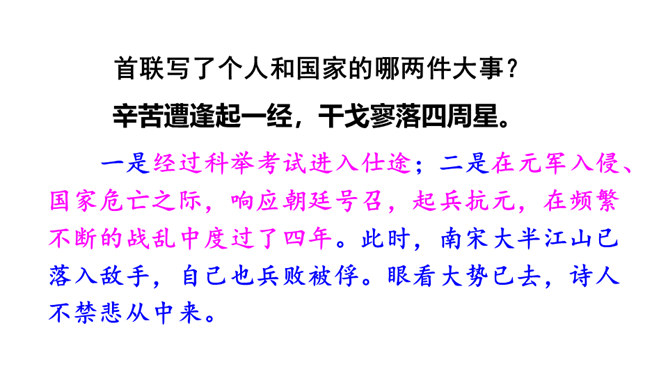 首联写了个人和国家的哪两件大事?一是经过科举考试进入仕途;二是在元军入侵、国家危亡之际,响应朝廷号召,起兵抗元,在频繁不断的战乱中度过了四年。此时,南宋大半江山已落入敌手,自己也兵败被俘。眼看大势已去,诗人不禁悲从中来。颔联运用了什么修辞手法?有什么表达效果?比喻、对偶。国土遭元军蹂躏,犹如风中柳絮;个人命运也是起伏不定,犹如风雨吹打的浮萍。这两句连用,暗含国家命运和个人命运紧密相连的意思,以比喻的方式写国势和身世,生动形象,感情深挚沉痛,极有艺术感染力。