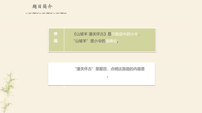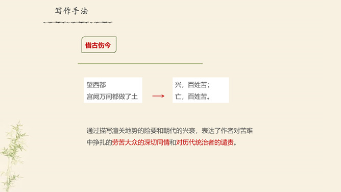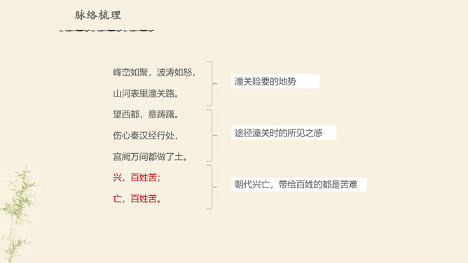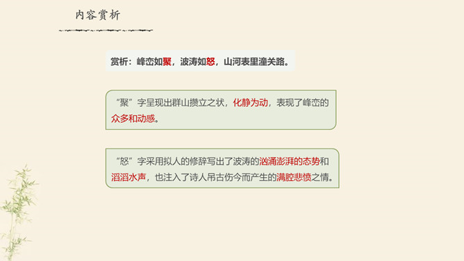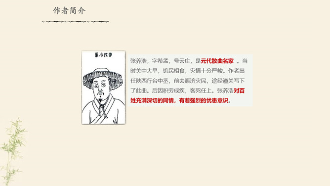 张养浩,字希孟,号云庄,是元代散曲名家 。当时关中大旱,饥民相食,灾情十分严峻。作者出任陕西行台中丞,前去赈济灾民,途经潼关写下了此曲。后因积劳成疾,客死任上。张养浩对百姓充满深切的同情,有着强烈的忧患意识。“聚”字呈现出群山攒立之状,化静为动,表现了峰峦的众多和动感。“怒”字采用拟人的修辞写出了波涛的汹涌澎湃的态势和滔滔水声,也注入了诗人吊古伤今而产生的满腔悲愤之情。通过描写潼关地势的险要和朝代的兴衰,表达了作者对苦难中挣扎的劳苦大众的深切同情和对历代统治者的谴责。所属专题:山坡羊·潼关怀古ppt。