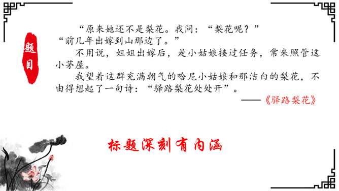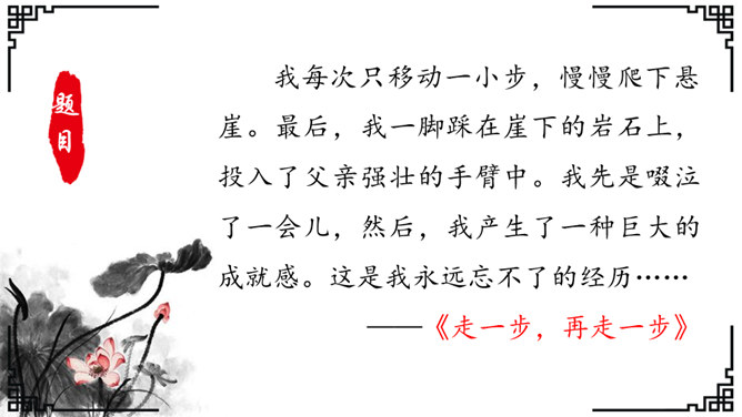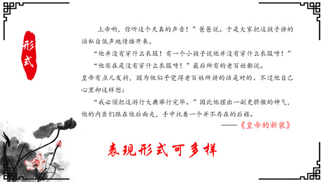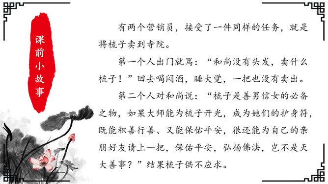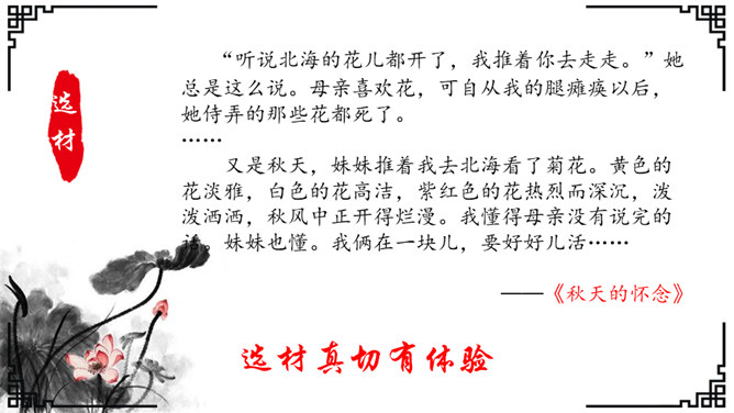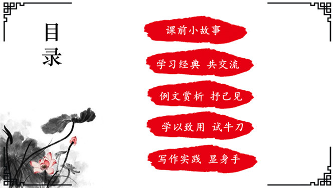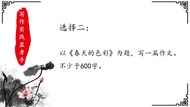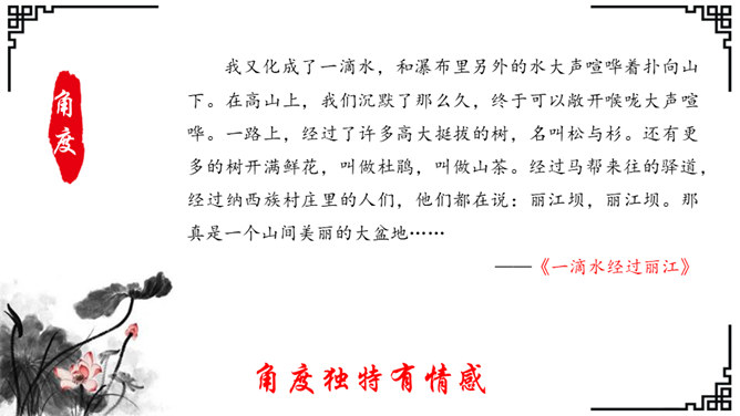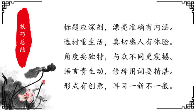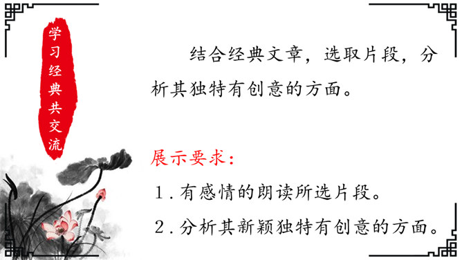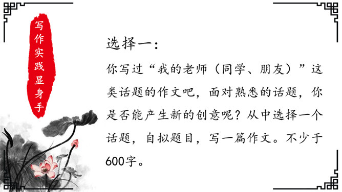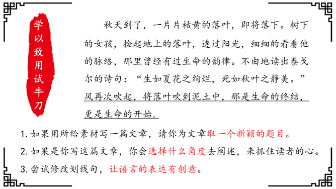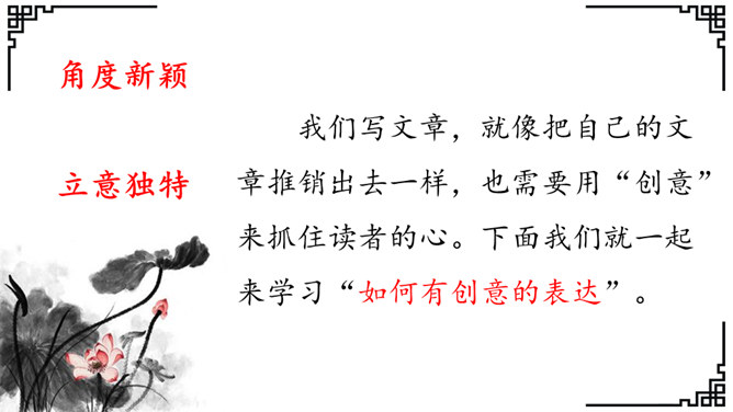 我们写文章,就像把自己的文章推销出去一样,也需要用“创意”来抓住读者的心。下面我们就一起来学习“如何有创意的表达”。结合经典文章,选取片段,分析其独特有创意的方面。展示要求:有感情的朗读所选片段。分析其新颖独特有创意的方面。先自己思考,然后在小组内先交流,选取代表从题目、角度、选材、语言等进行赏析。1.如果用所给素材写一篇文章,请你为文章取一个新颖的题目。2.如果是你写这篇文章,你会选择什么角度去阐述,来抓住读者的心。3.尝试修改划线句,让语言的表达有创意。所属专题:有创意的表达ppt。