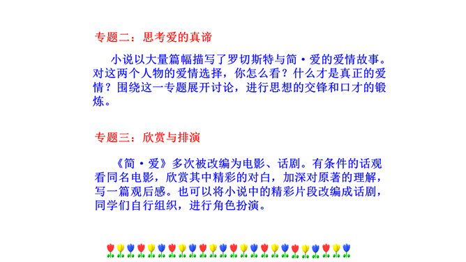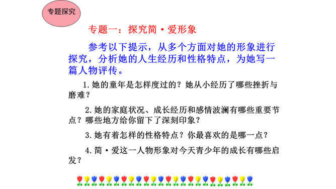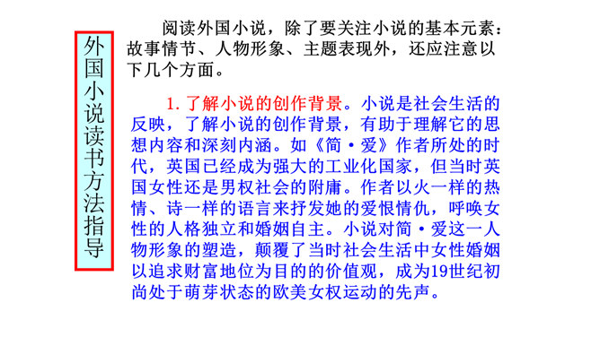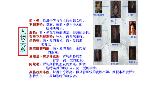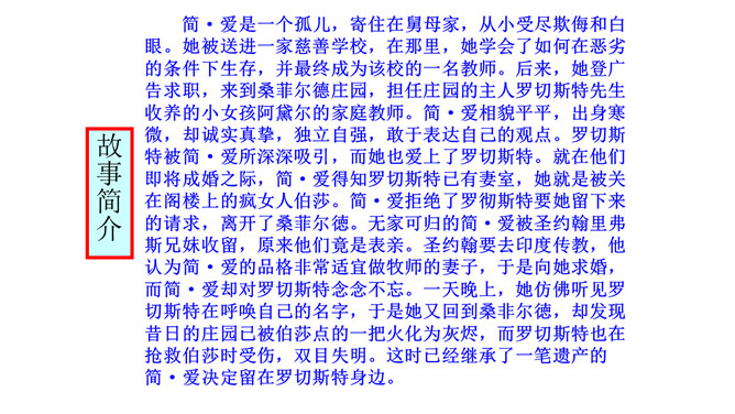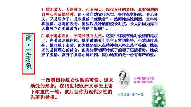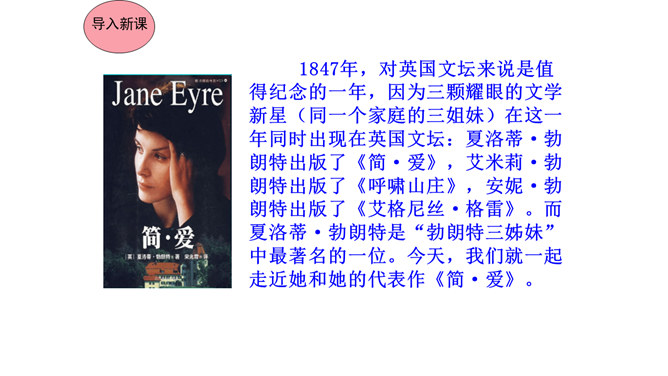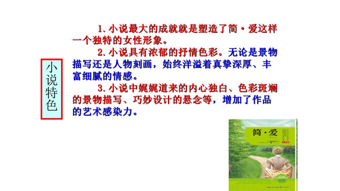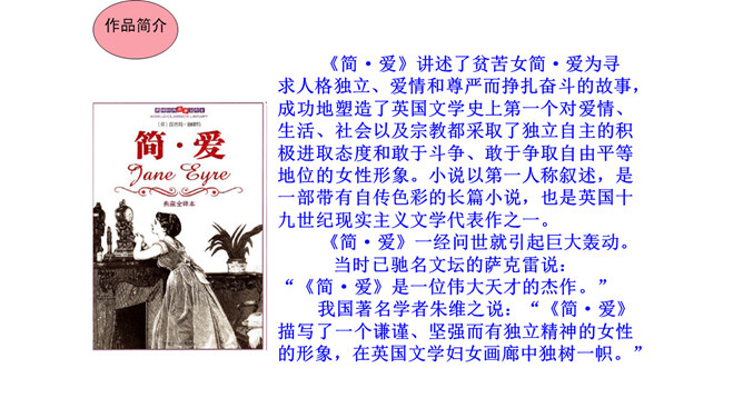 《简·爱》讲述了贫苦女简·爱为寻求人格独立、爱情和尊严而挣扎奋斗的故事,成功地塑造了英国文学史上第一个对爱情、生活、社会以及宗教都采取了独立自主的积极进取态度和敢于斗争、敢于争取自由平等地位的女性形象。小说以第一人称叙述,是一部带有自传色彩的长篇小说,也是英国十九世纪现实主义文学代表作之一。《简·爱》一经问世就引起巨大轰动。当时已驰名文坛的萨克雷说:“《简·爱》是一位伟大天才的杰作。”我国著名学者朱维之说:“《简·爱》描写了一个谦谨、坚强而有独立精神的女性的形象,在英国文学妇女画廊中独树一帜。”