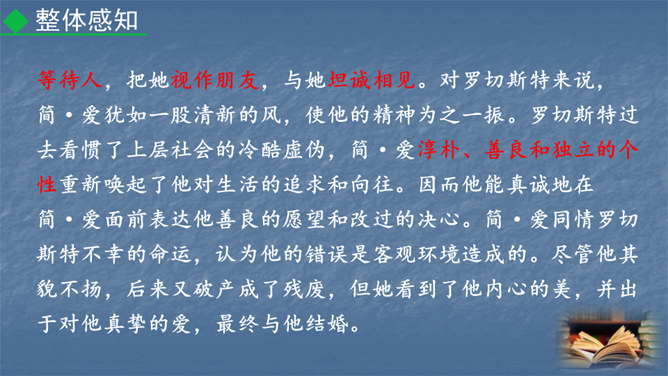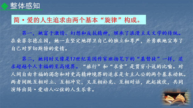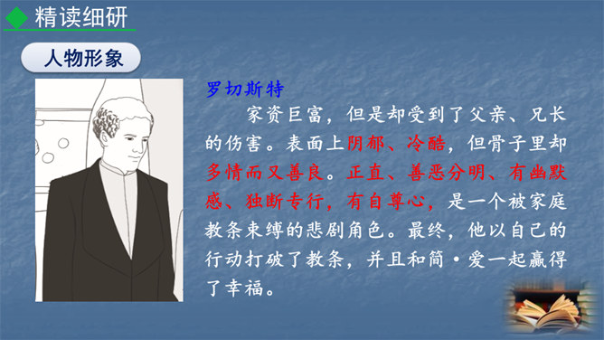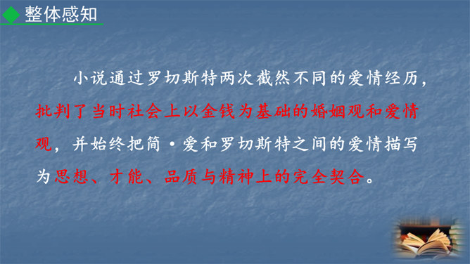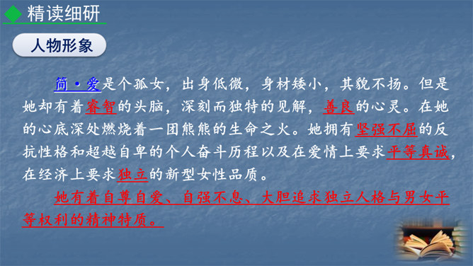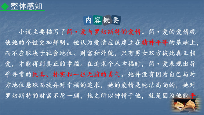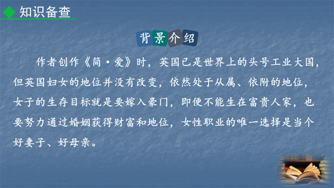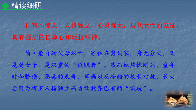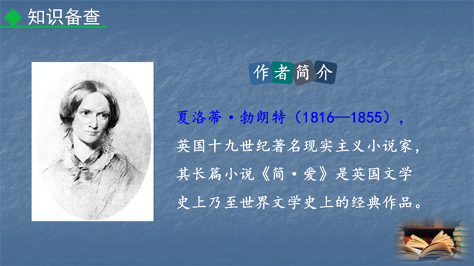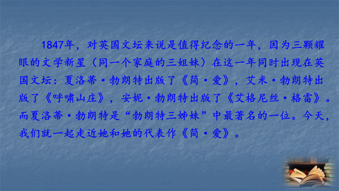 1847年,对英国文坛来说是值得纪念的一年,因为三颗耀眼的文学新星(同一个家庭的三姐妹)在这一年同时出现在英国文坛:夏洛蒂·勃朗特出版了《简·爱》,艾米·勃朗特出版了《呼啸山庄》,安妮·勃朗特出版了《艾格尼丝·格雷》。而夏洛蒂·勃朗特是“勃朗特三姊妹”中最著名的一位。今天,我们就一起走近她和她的代表作《简·爱》。1.熟悉小说情节,分析人物形象。(重点)2.掌握阅读外国小说的方法。(难点)3.让学生真切感受到读书的快乐,激发学生继续阅读的兴趣。(素养)