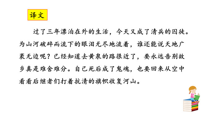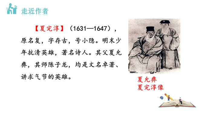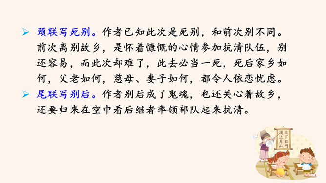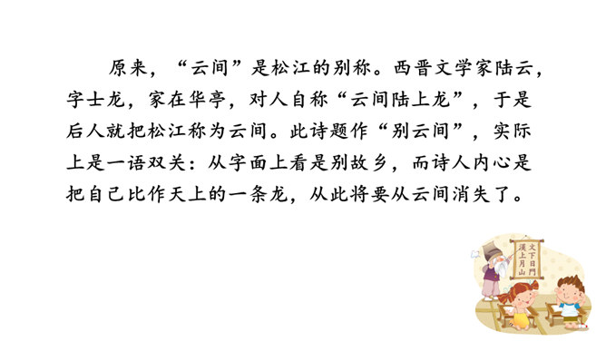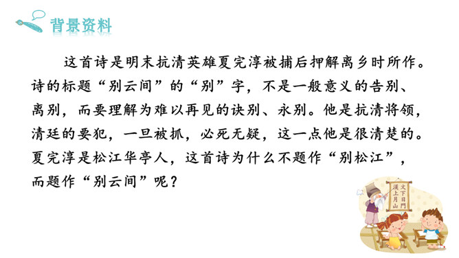 这首诗是明末抗清英雄夏完淳被捕后押解离乡时所作。诗的标题“别云间”的“别”字,不是一般意义的告别、离别,而要理解为难以再见的诀别、永别。他是抗清将领,清廷的要犯,一旦被抓,必死无疑,这一点他是很清楚的。夏完淳是松江华亭人,这首诗为什么不题作“别松江”,而题作“别云间”呢?原来,“云间”是松江的别称。西晋文学家陆云,字士龙,家在华亭,对人自称“云间陆上龙”,于是后人就把松江称为云间。此诗题作“别云间”,实际上是一语双关:从字面上看是别故乡,而诗人内心是把自己比作天上的一条龙,从此将要从云间消失了。所属专题:别云间ppt。