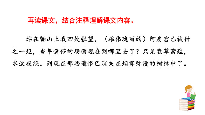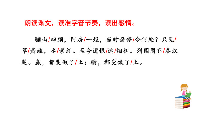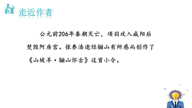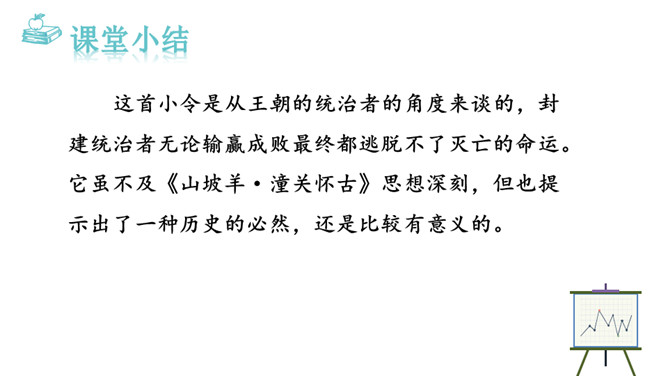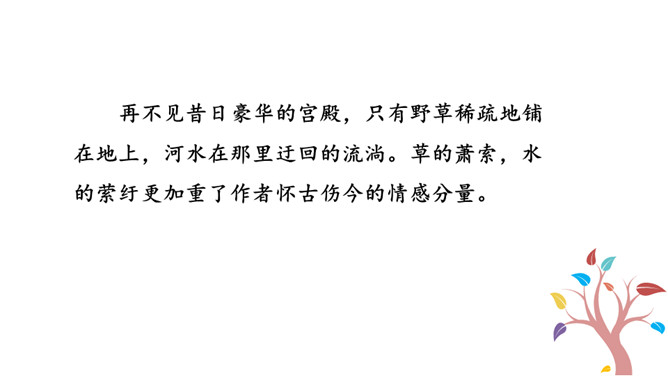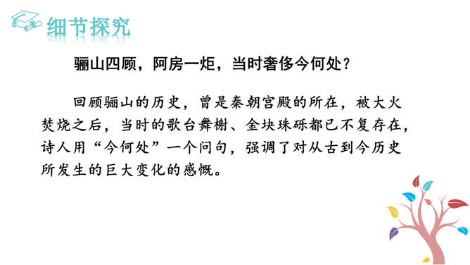 到如今,秦王朝因奢侈、残暴而亡国的遗恨已消失在烟树之间了。而这种亡国的遗恨不只有秦朝才有,周朝、战国列强直到汉楚之争,哪个不抱有败亡的遗恨呢?实际上作者在这里寄托了一种讽刺,是说后人都已遗忘了前朝败亡的教训!元朝统治者在夺得政权之后更奢侈挥霍无度,全然不顾国库空虚、社会经济急待调整。张养浩对当时的状况心怀不满,但想到列国的历史,又觉得从夺得政权,到奢侈暴戾,到最终败亡,乃是历代封建王朝的共同结局。杜牧说阿房宫“楚人一炬,可怜焦土”,作者正是由此引申开来。所属专题:山坡羊·骊山怀古ppt。