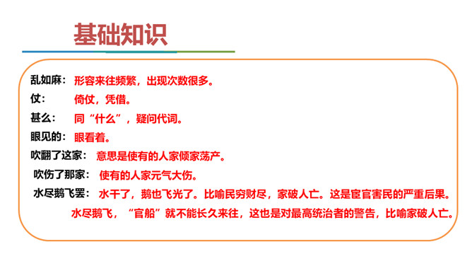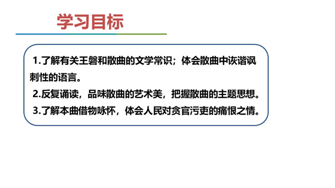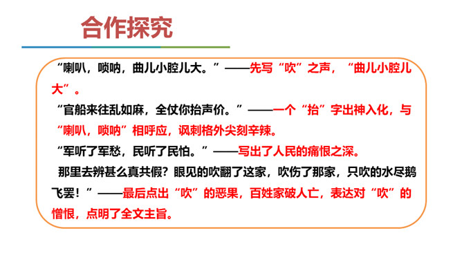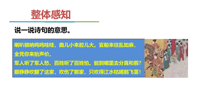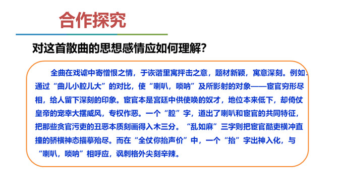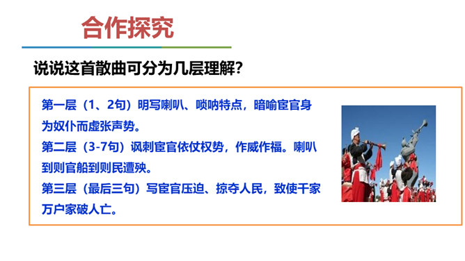 当时大宦官刘瑾当权,派出大批宦官到各地盘税查矿,搜刮民财,闹得鸡犬不宁。老百姓以及一些小官,听到他们的喇叭声就恐惧万分,作者就以此为题,揭露他们的丑态,在轻俏诙谐中充满了对宦官的鄙视和愤慨。说说这首散曲可分为几层理解?第一层(1、2句)明写喇叭、唢呐特点,暗喻宦官身为奴仆而虚张声势。第二层(3-7句)讽刺宦官依仗权势,作威作福。喇叭到则官船到则民遭殃。第三层(最后三句)写宦官压迫、掠夺人民,致使千家万户家破人亡。全曲在戏谑中寄憎恨之情,于诙谐里寓抨击之意,题材新颖,寓意深刻。所属专题:朝天子·咏喇叭ppt。
