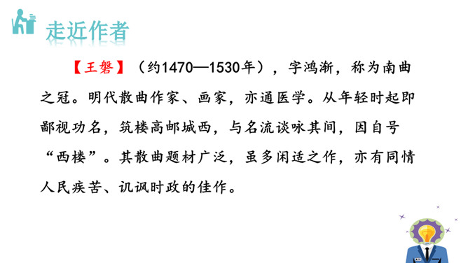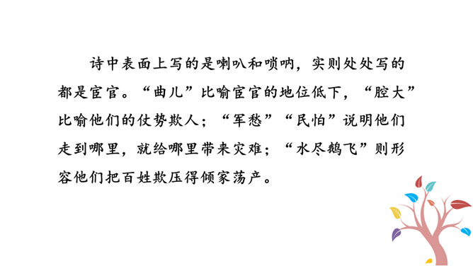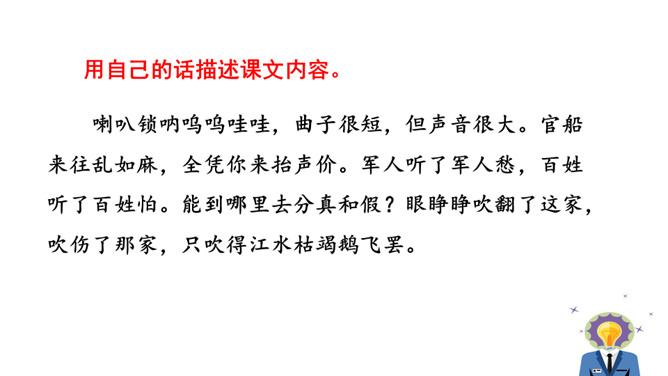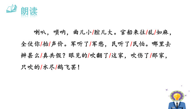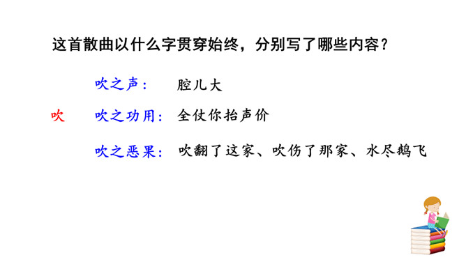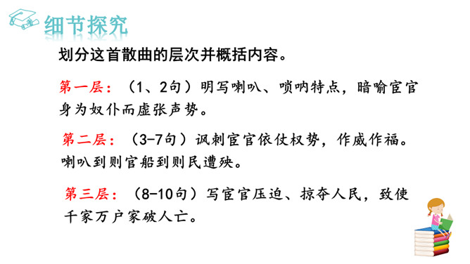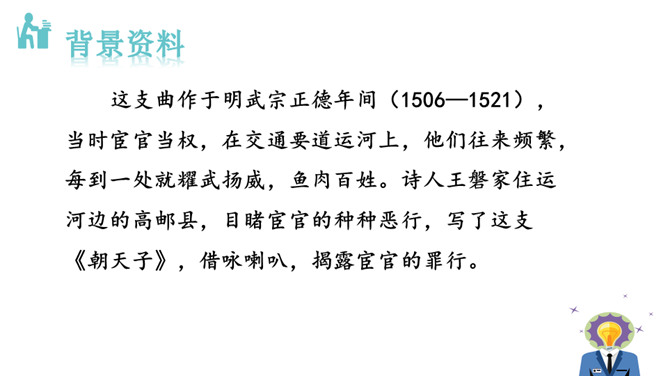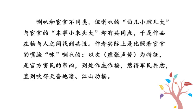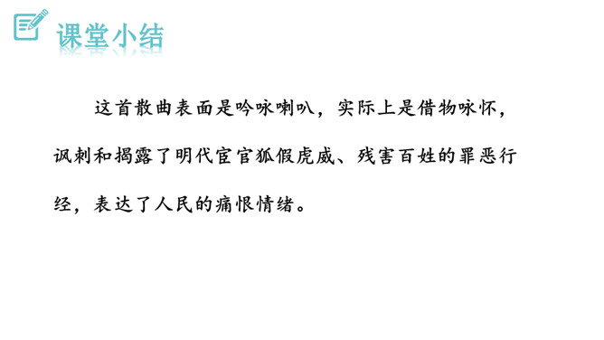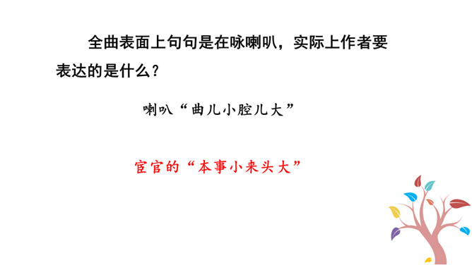 1.能够把握词的内容,赏析词语言。2.能够体会词人深沉的思想感情。喇叭锁呐呜呜哇哇,曲子很短,但声音很大。官船来往乱如麻,全凭你来抬声价。军人听了军人愁,百姓听了百姓怕。能到哪里去分真和假?眼睁睁吹翻了这家,吹伤了那家,只吹得江水枯竭鹅飞罢。这首散曲以什么字贯穿始终,分别写了哪些内容?全曲表面上句句是在咏喇叭,实际上作者要表达的是什么?这首散曲表面是吟咏喇叭,实际上是借物咏怀,讽刺和揭露了明代宦官狐假虎威、残害百姓的罪恶行经,表达了人民的痛恨情绪。所属专题:朝天子·咏喇叭ppt。