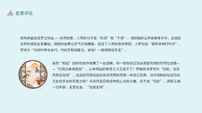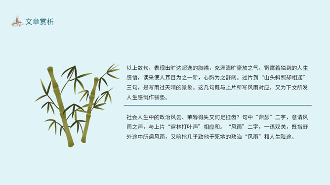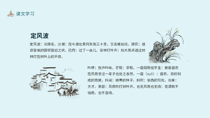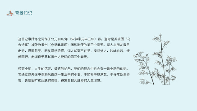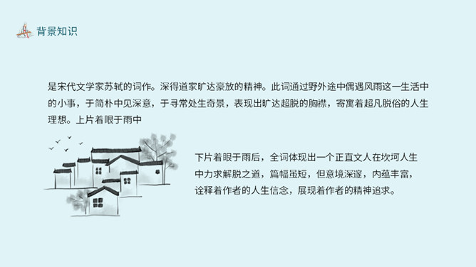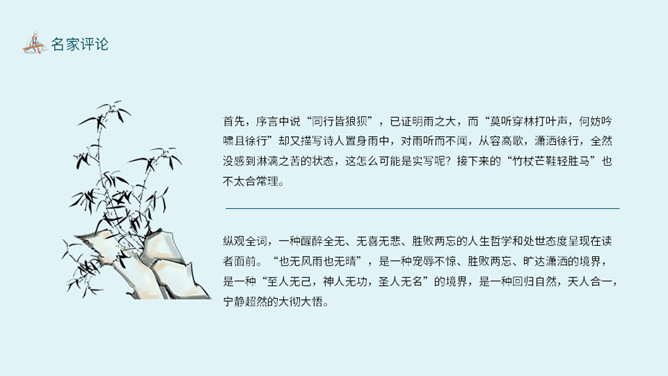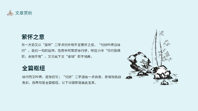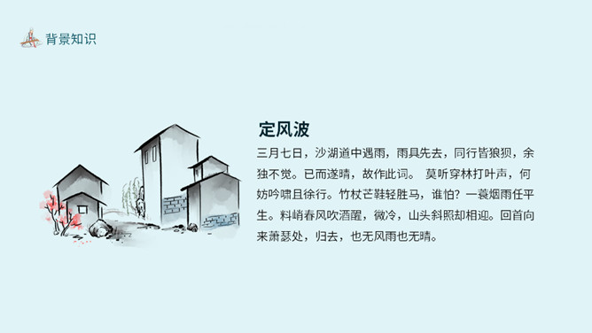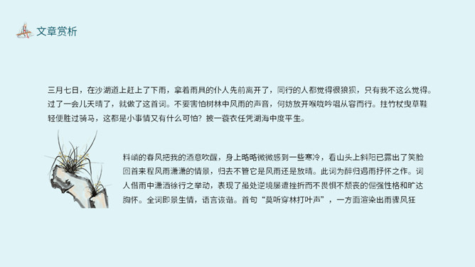 料峭的春风把我的酒意吹醒,身上略略微微感到一些寒冷,看山头上斜阳已露出了笑脸回首来程风雨潇潇的情景,归去不管它是风雨还是放晴。此词为醉归遇雨抒怀之作。词人借雨中潇洒徐行之举动,表现了虽处逆境屡遭挫折而不畏惧不颓丧的倔强性格和旷达胸怀。全词即景生情,语言诙谐。首句“莫听穿林打叶声”,一方面渲染出雨骤风狂另一方面又以“莫听”二字点明外物不足萦怀之意。“何妨吟啸且徐行”,是前一句的延伸。在雨中照常舒徐行步,呼应小序“同行皆狼狈,余独不觉”,又引出下文“谁怕”即不怕来。所属专题:定风波ppt。