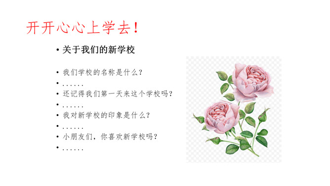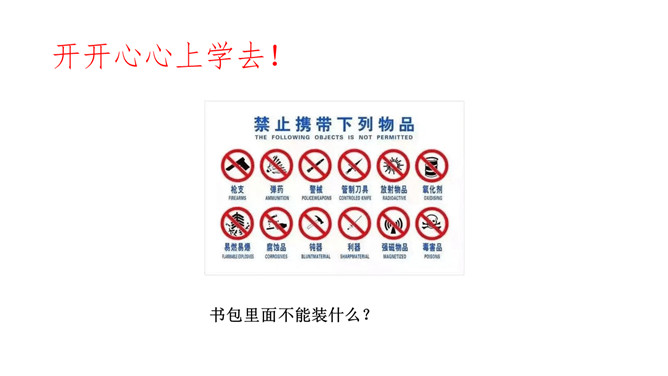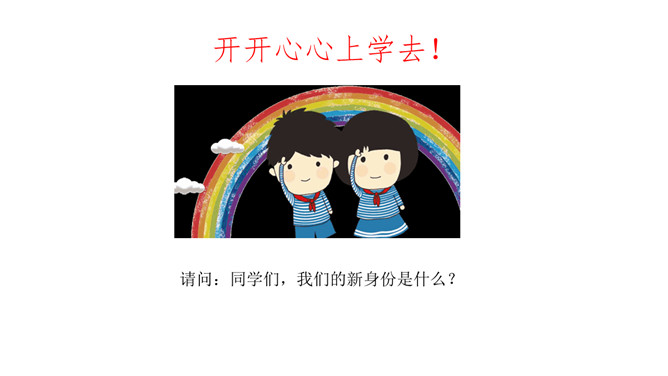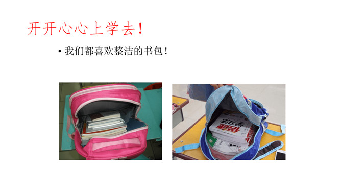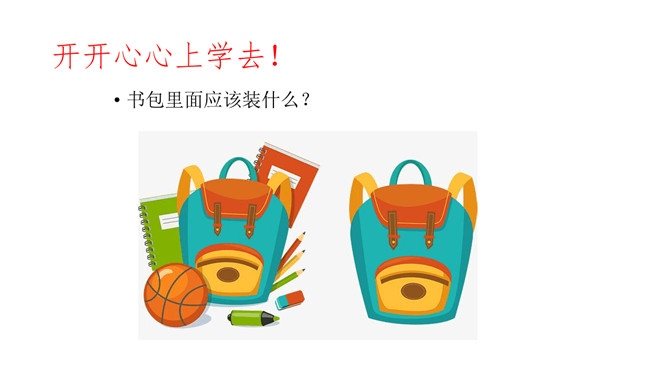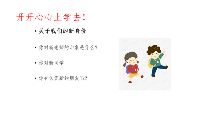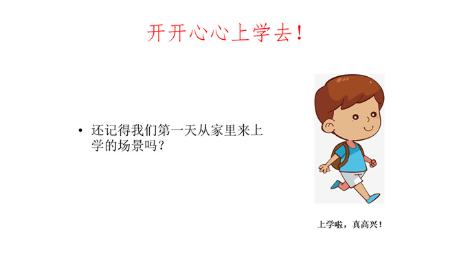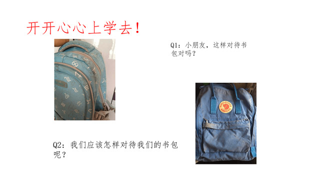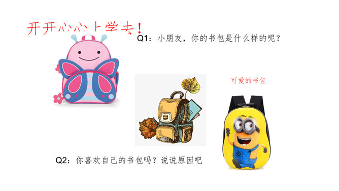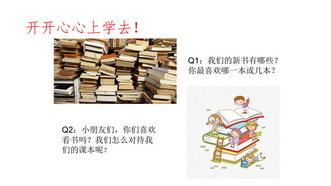 请问:同学们,我们的新身份是什么?还记得我们第一天从家里来上学的场景吗?关于我们的新学校:我们学校的名称是什么?还记得我们第一天来这个学校吗?我对新学校的印象是什么?小朋友们,你喜欢新学校吗?你对新老师的印象是什么?你对新同学你有认识新的朋友吗?我们的新书有哪些?你最喜欢哪一本或几本?小朋友们,你们喜欢看书吗?我们怎么对待我们的课本呢?小朋友,你的书包是什么样的呢?你喜欢自己的书包吗?说说原因吧。小朋友,这样对待书包对吗?我们应该怎样对待我们的书包呢?所属专题:开开心心上学去ppt。