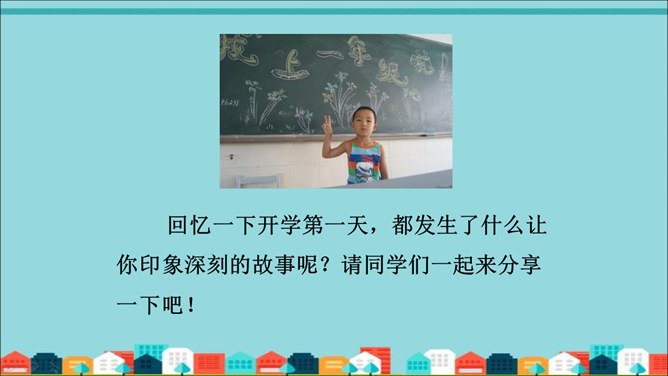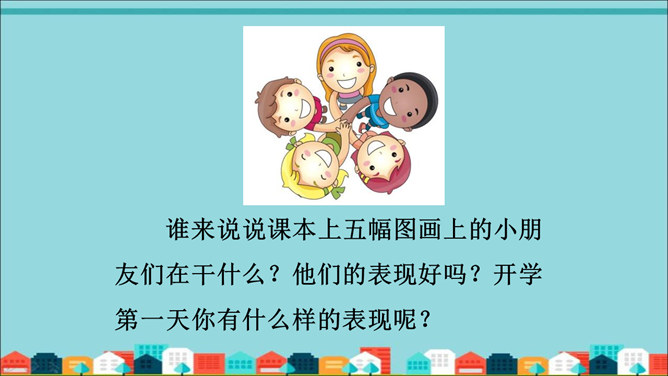 同学们,你们已经是一名小学生了,欢迎你们!谁来说说课本上五幅图画上的小朋友们在干什么?他们的表现好吗?开学第一天你有什么样的表现呢?回忆一下开学第一天,都发生了什么让你印象深刻的故事呢?请同学们一起来分享一下吧!来到学校,想不想看看我们的学校是什么样的吗?让我们一起去看看校园吧!新学期你都收到了哪些书本呢?我们要爱惜书本吗?该如何爱护?小书包,别着急,用品文具想仔细。大大小小排个队,样样不少都爱惜。我们都是好伙伴,天天一起上学去。所属专题:开开心心上学去ppt。