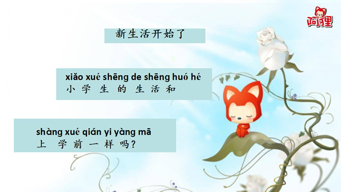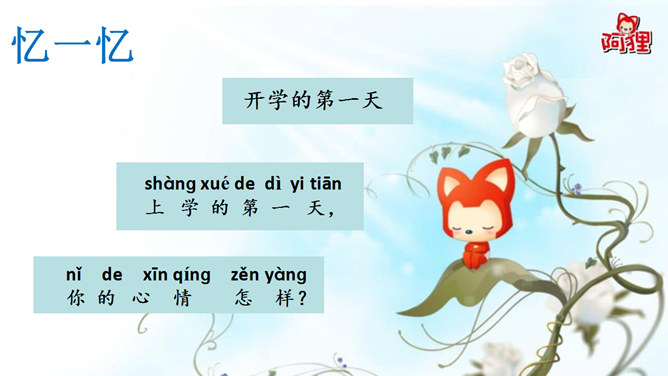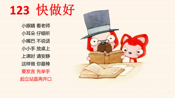 快做好:小眼睛 看老师 小耳朵 仔细听 小嘴巴 不说话 小小手 放桌上 上课时 请安静 这样做 你最棒 要发言 先举手 起立站直再开口。大家好,我叫阿狸,我喜欢读书。你当时是怎样的心情呢?小女孩在害怕什么?如何帮助她呢。摸摸书桌和椅子,在摸摸课本,看看自己保护好它们了吗。我们的桌椅是学校所拥有的东西是学校的财产,它们叫做公物。好孩子要知道,爱惜图书,爱护公物。拿出你的小书包,整齐吗?一起动手装整齐。新学期我的新愿望。所属专题:开开心心上学去ppt。
