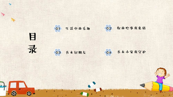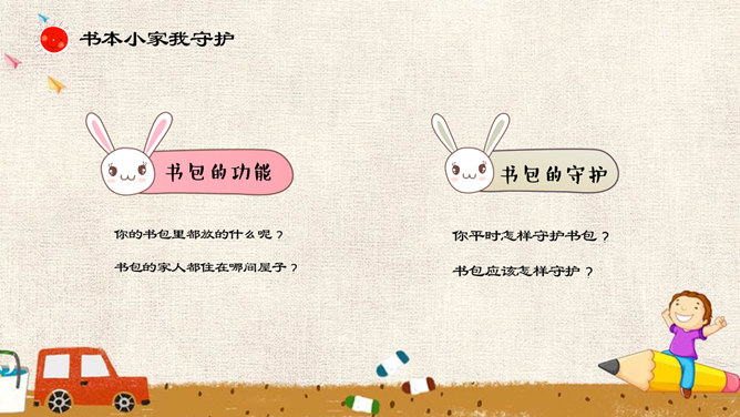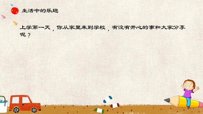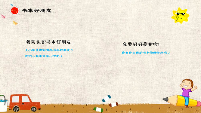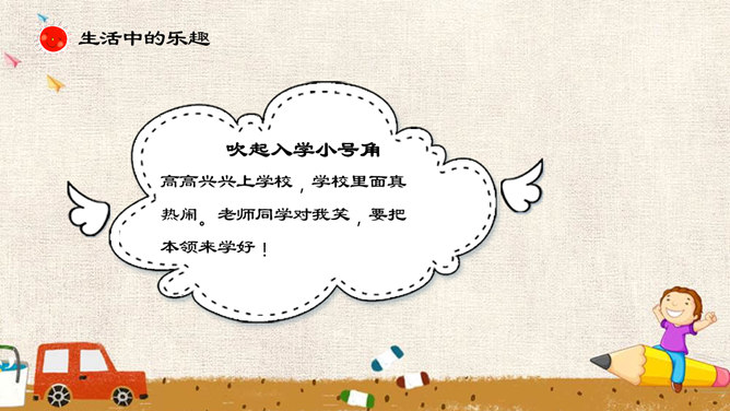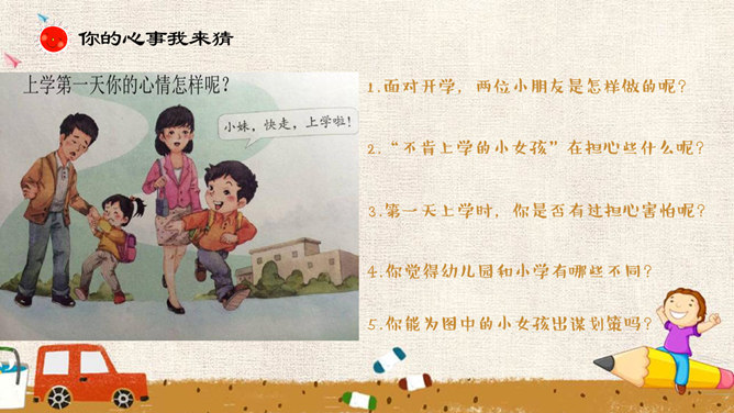 吹起入学小号角,高高兴兴上学校,学校里面真热闹。老师同学对我笑,要把本领来学好!上学第一天,你从家里来到学校,有没有开心的事和大家分享呢?1.面对开学,两位小朋友是怎样做的呢?2.“不肯上学的小女孩”在担心些什么呢?3.第一天上学时,你是否有过担心害怕呢?4.你觉得幼儿园和小学有哪些不同?5.你能为图中的小女孩出谋划策吗?来认识书本好朋友,上小学认识到哪些书本好朋友?我们一起来分享一下吧!我要好好爱护它!你有什么保护书本的好妙招吗?谁是书本的小家?书本小家的来历?所属专题:开开心心上学去ppt。